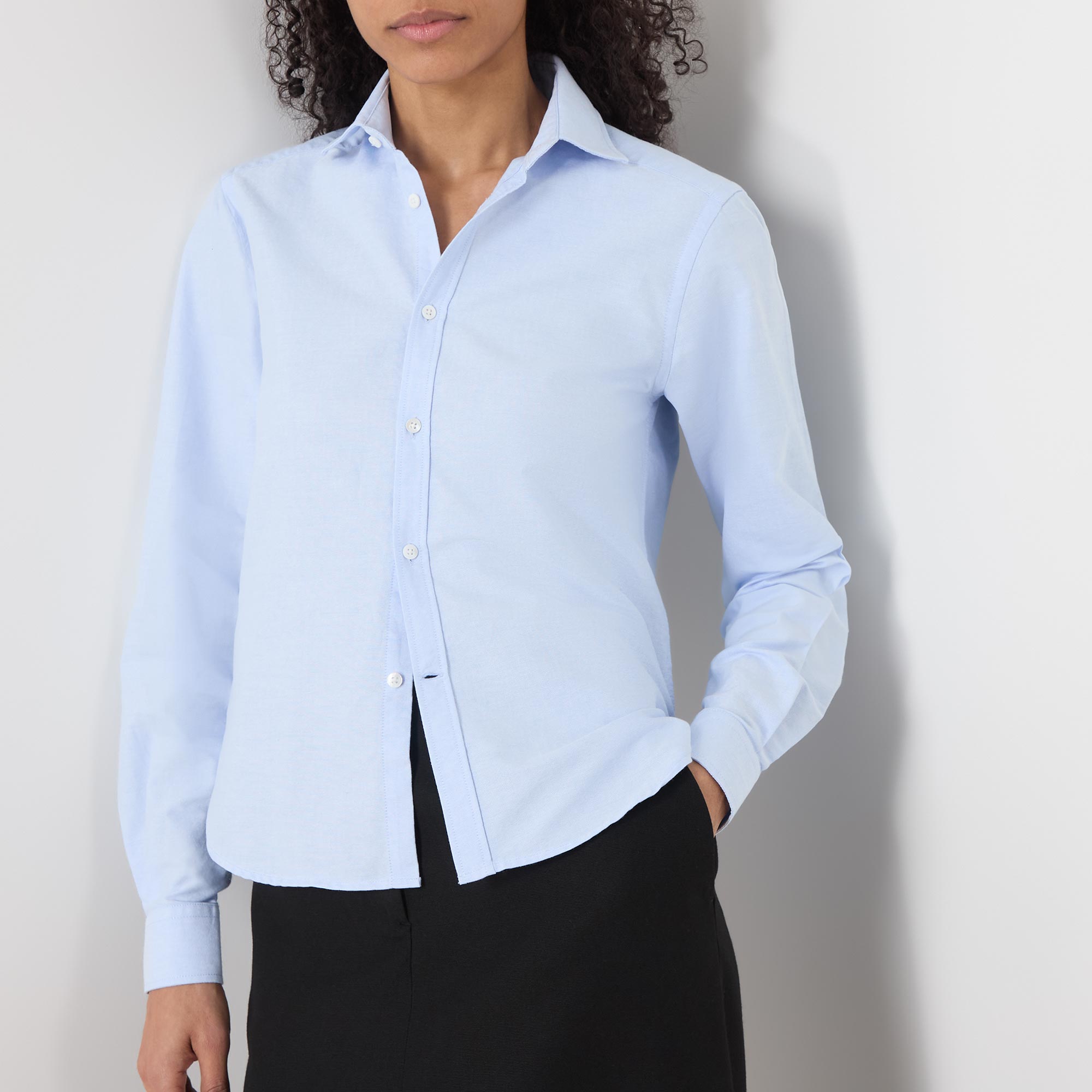 - Classic collar, button fastening, long sleeves, buttoned cuffs, two pleats across the yoke, curved hemline