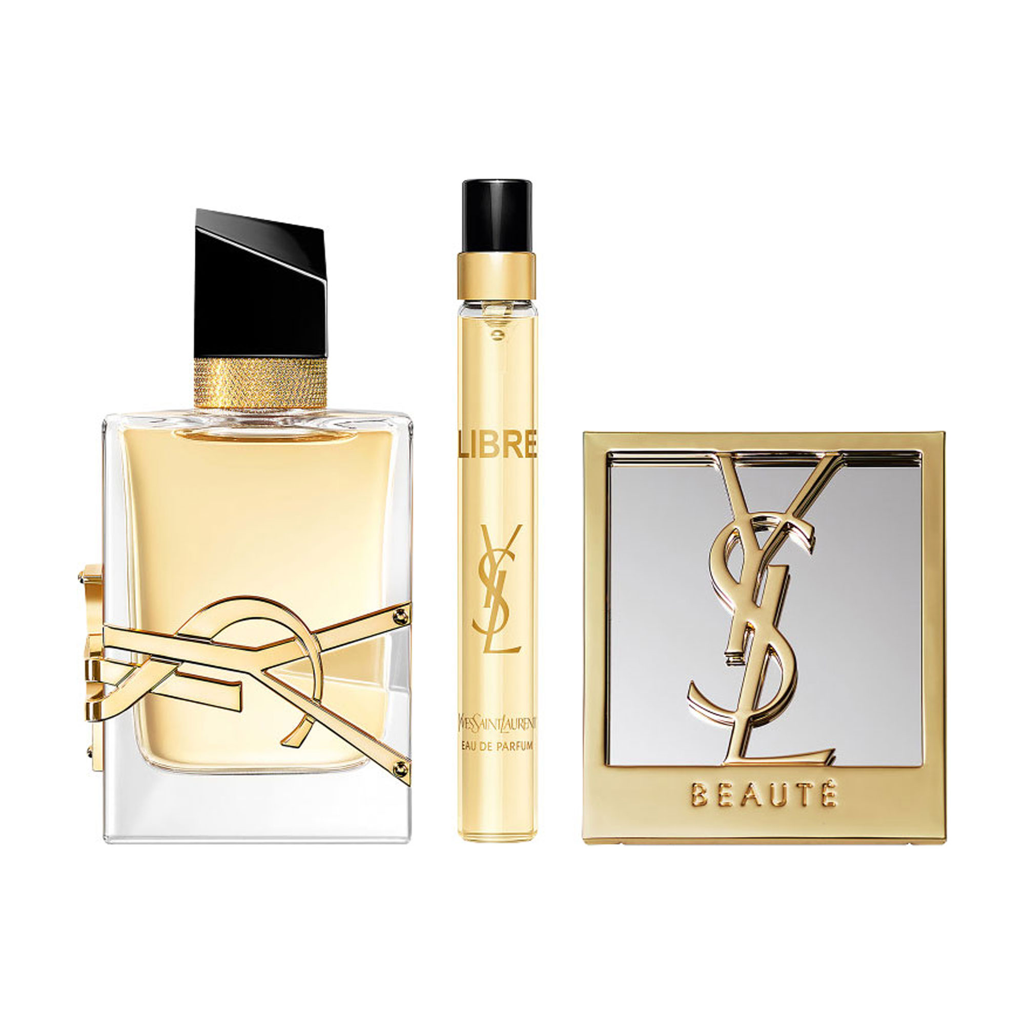 Description: A YSL Libre gift set with fragrance and a gold mirror to celebrate blossoming freshness and connection.