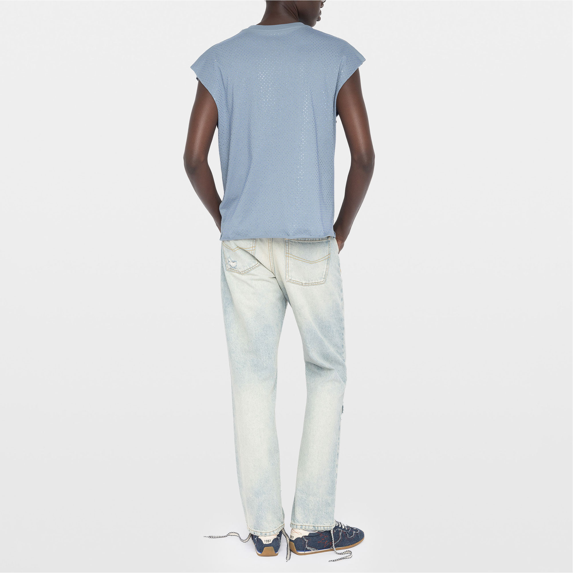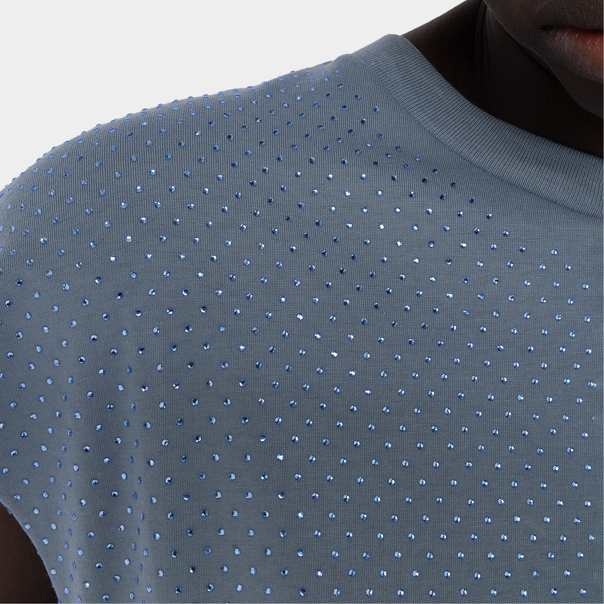 - Sleeveless, round neckline, rhinestone embellishment