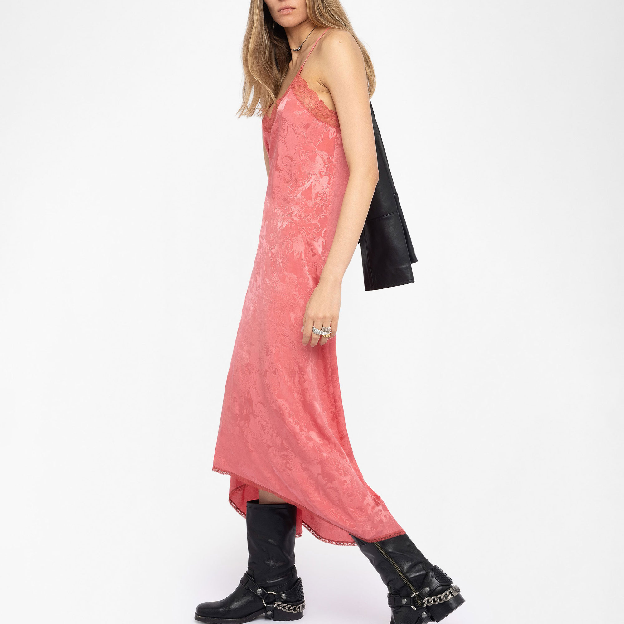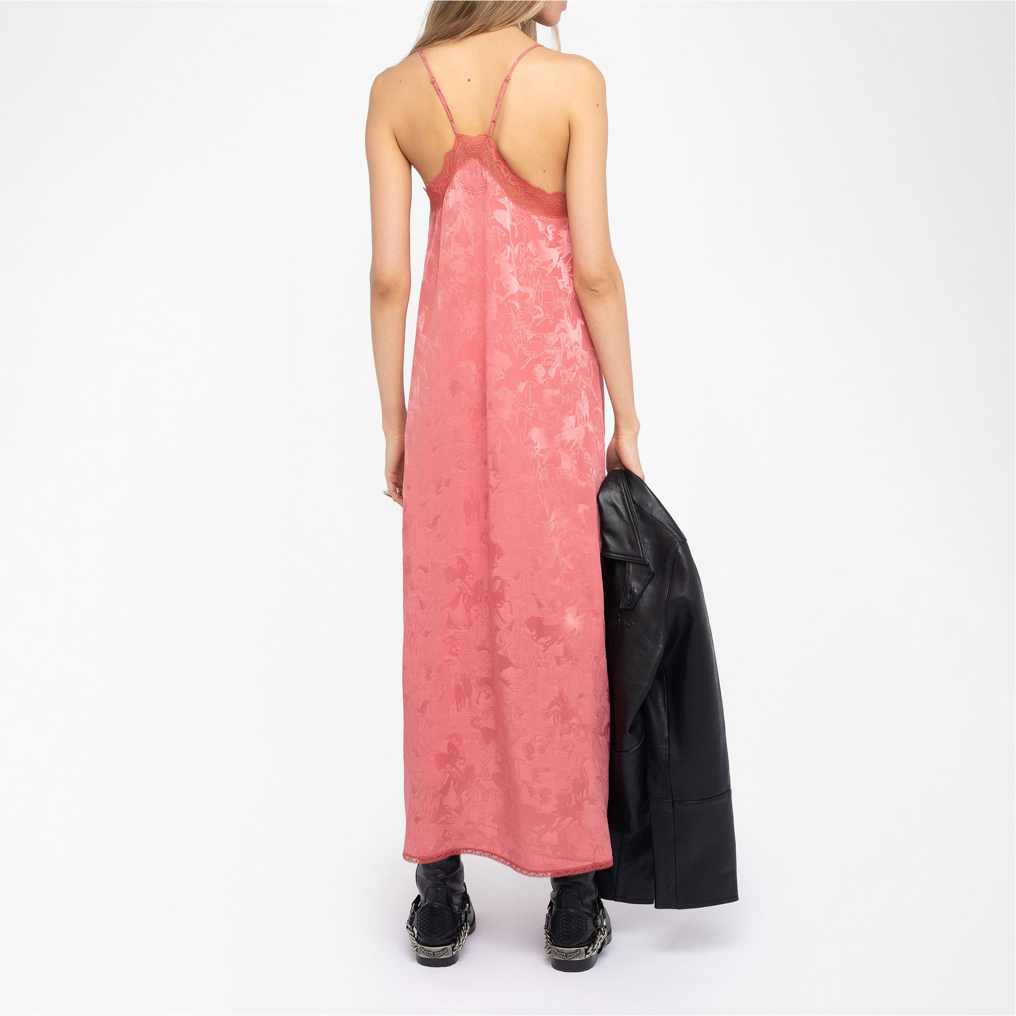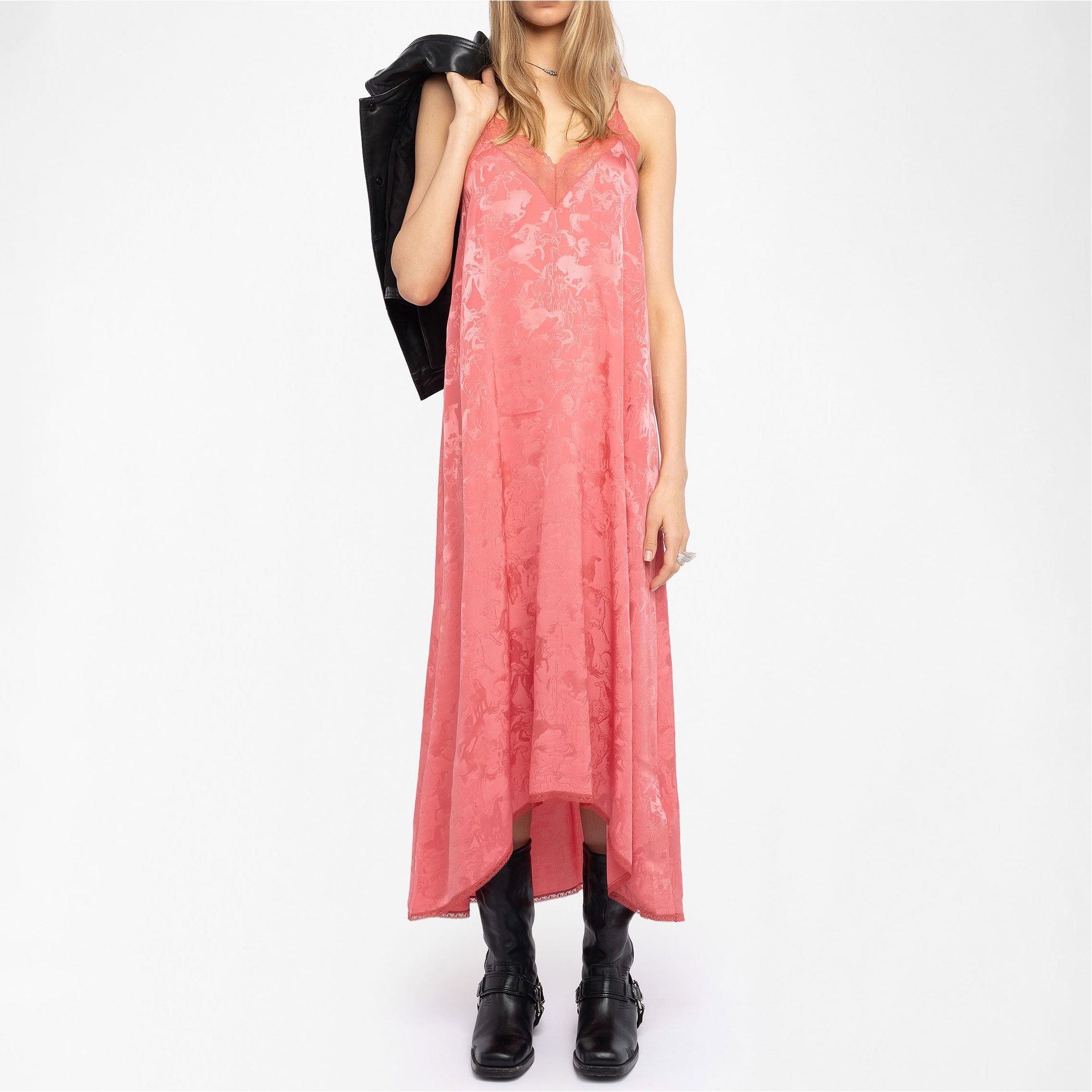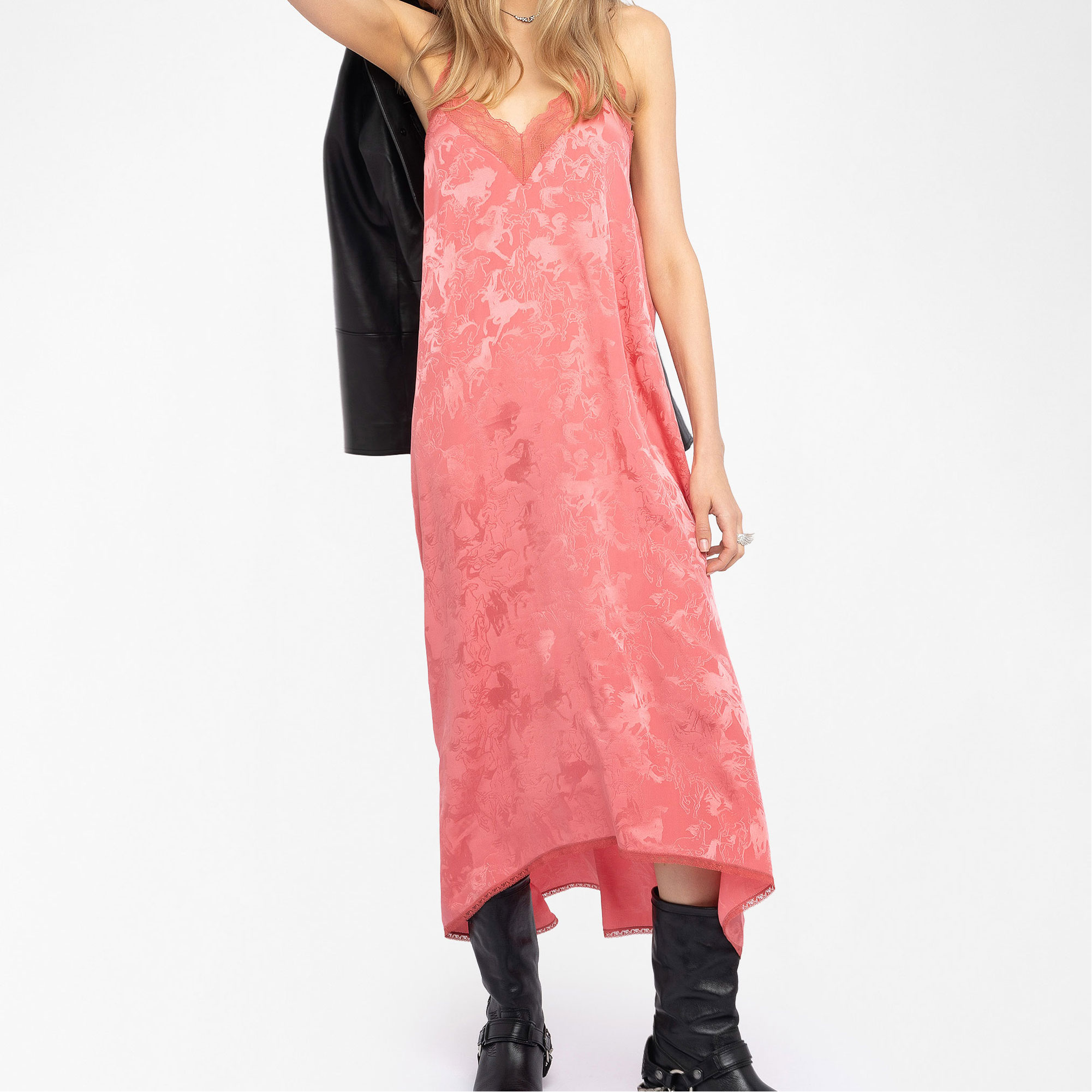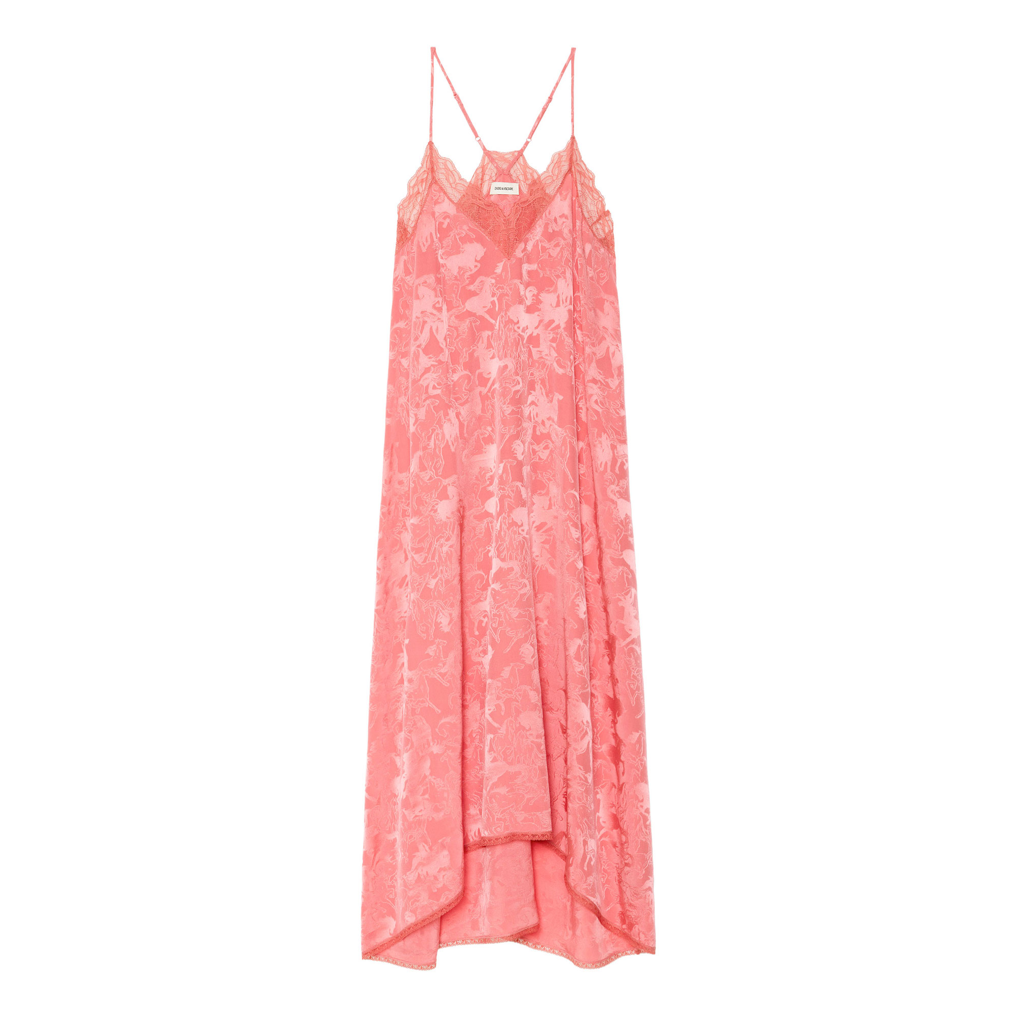 - Midi length, lingerie-inspired style, horse print, silk fabric, adjustable straps, lace trim