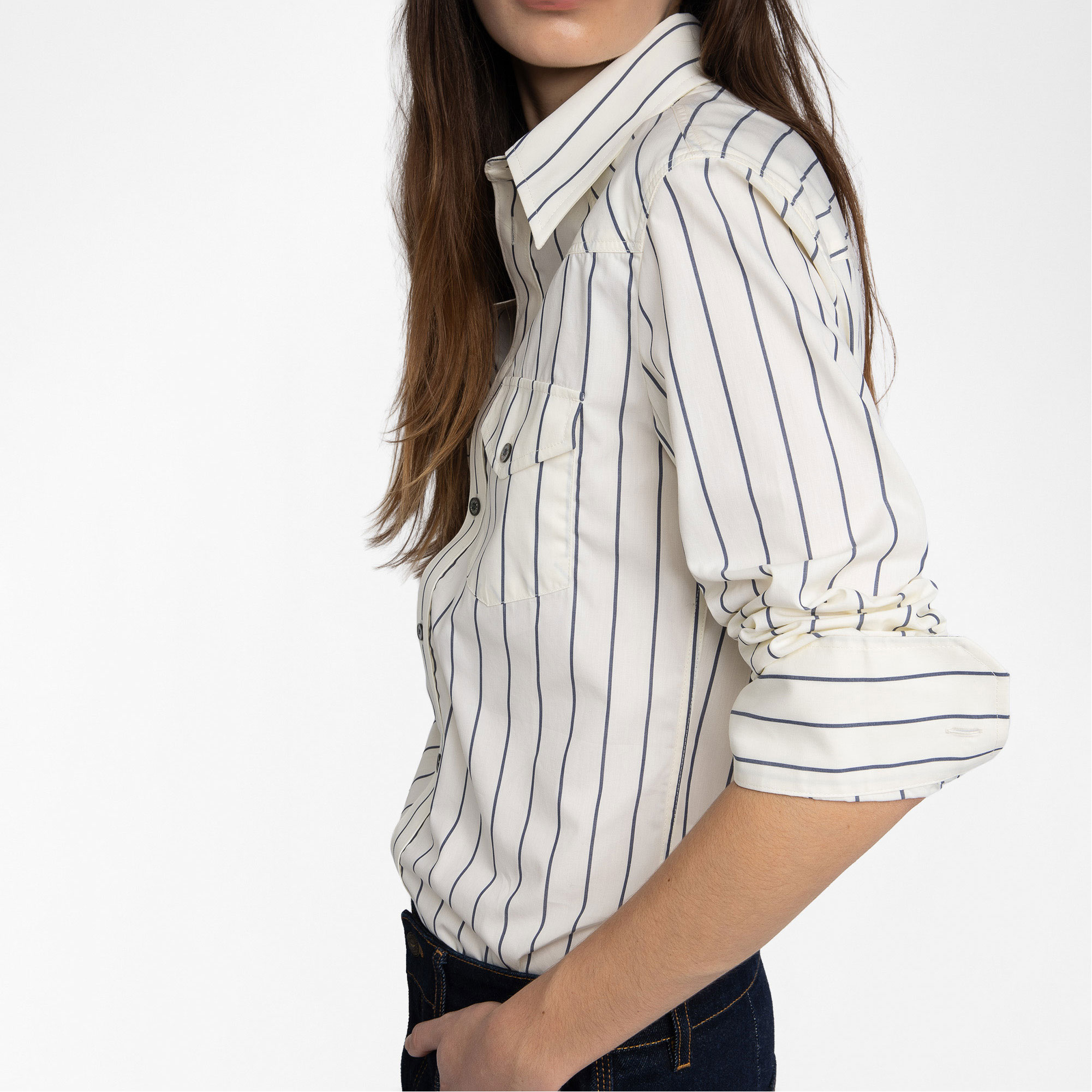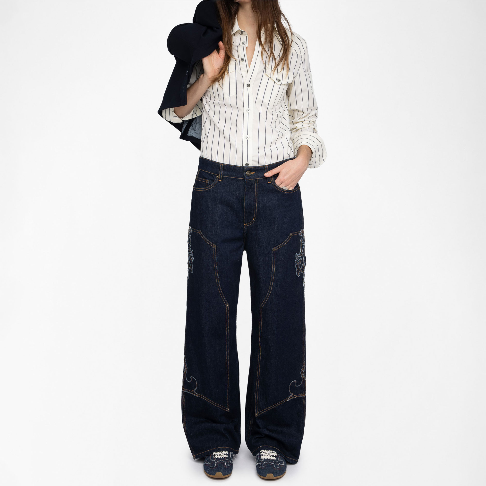 - Poplin fabric, patch chest pockets, crystals at the back