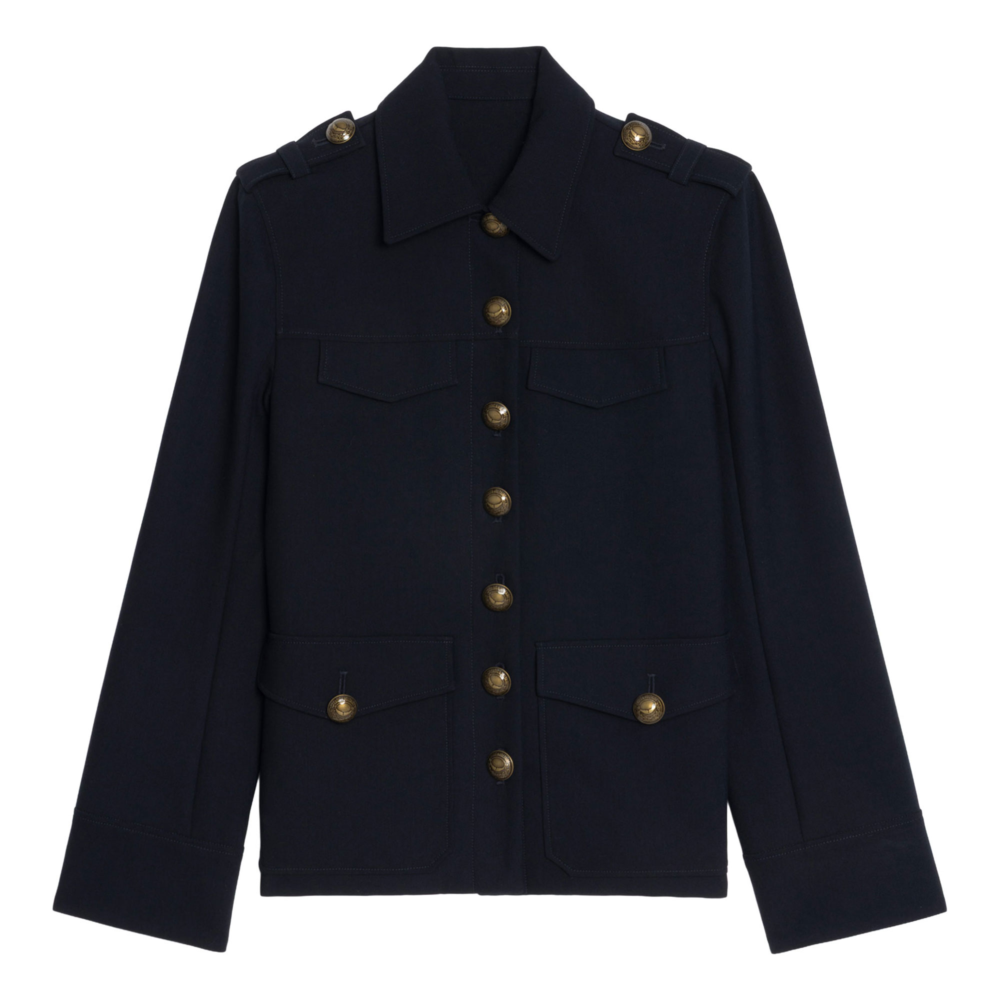 - Military-inspired, tailored, button closure, multiple pockets