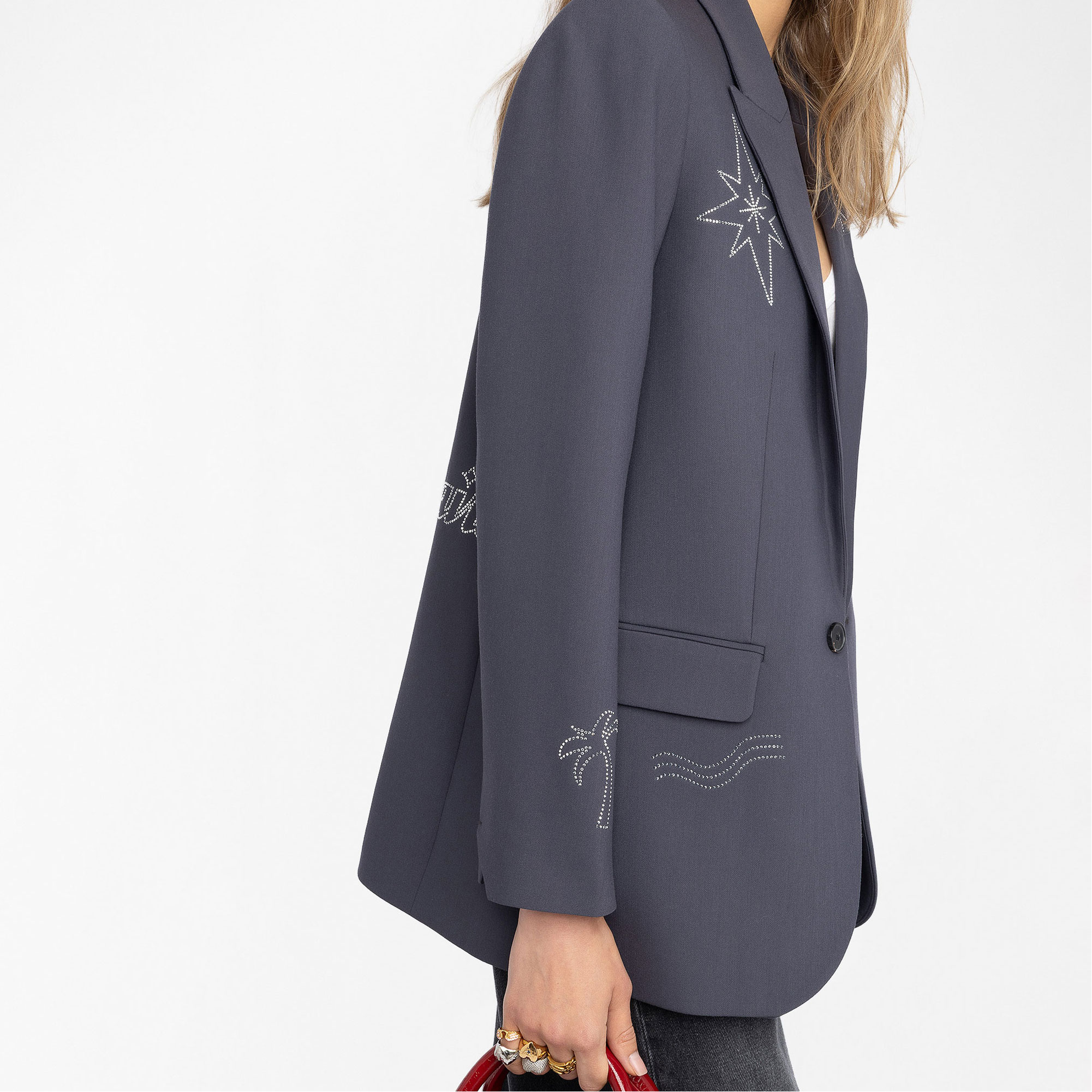 - Structured style, button closure, multi-rhinestone details