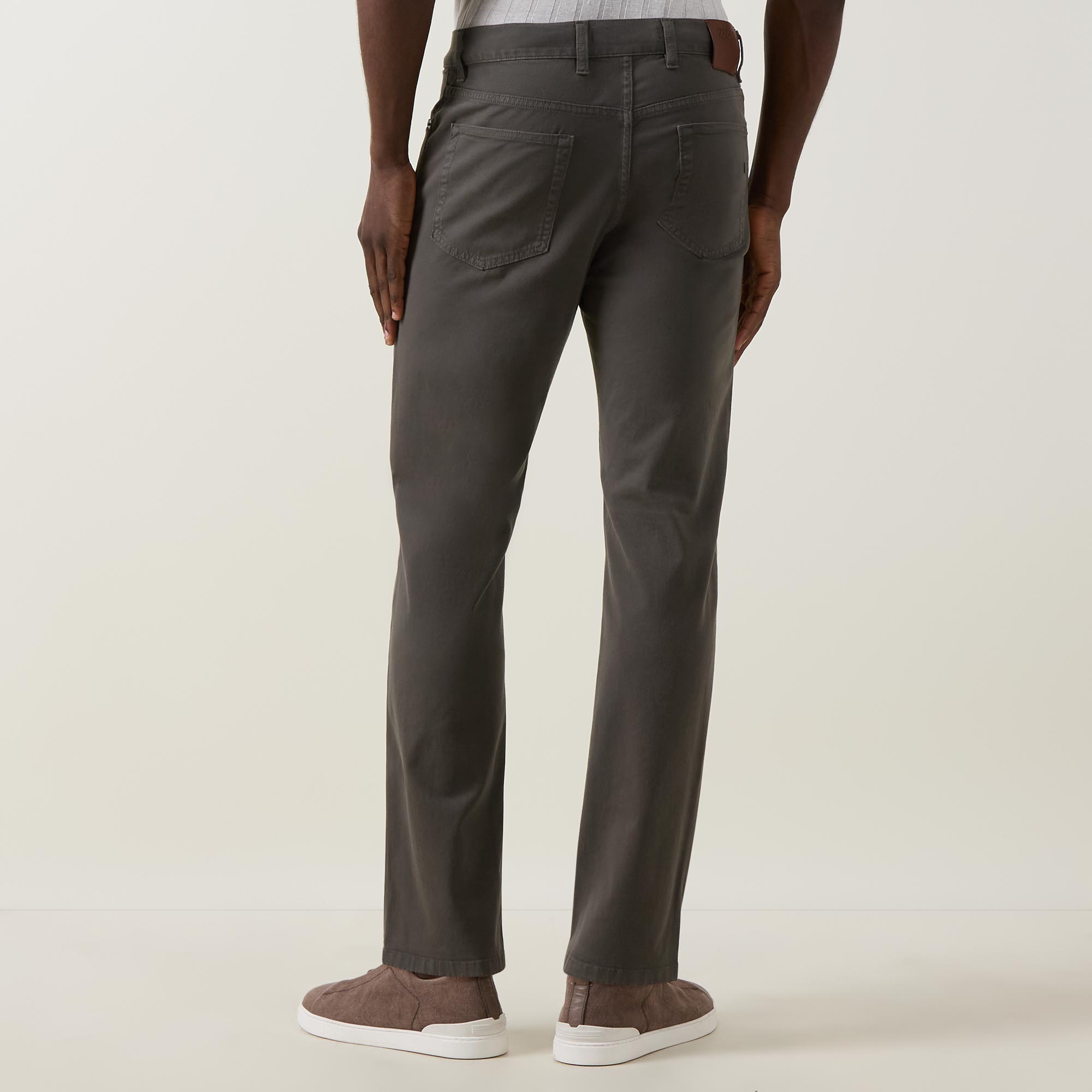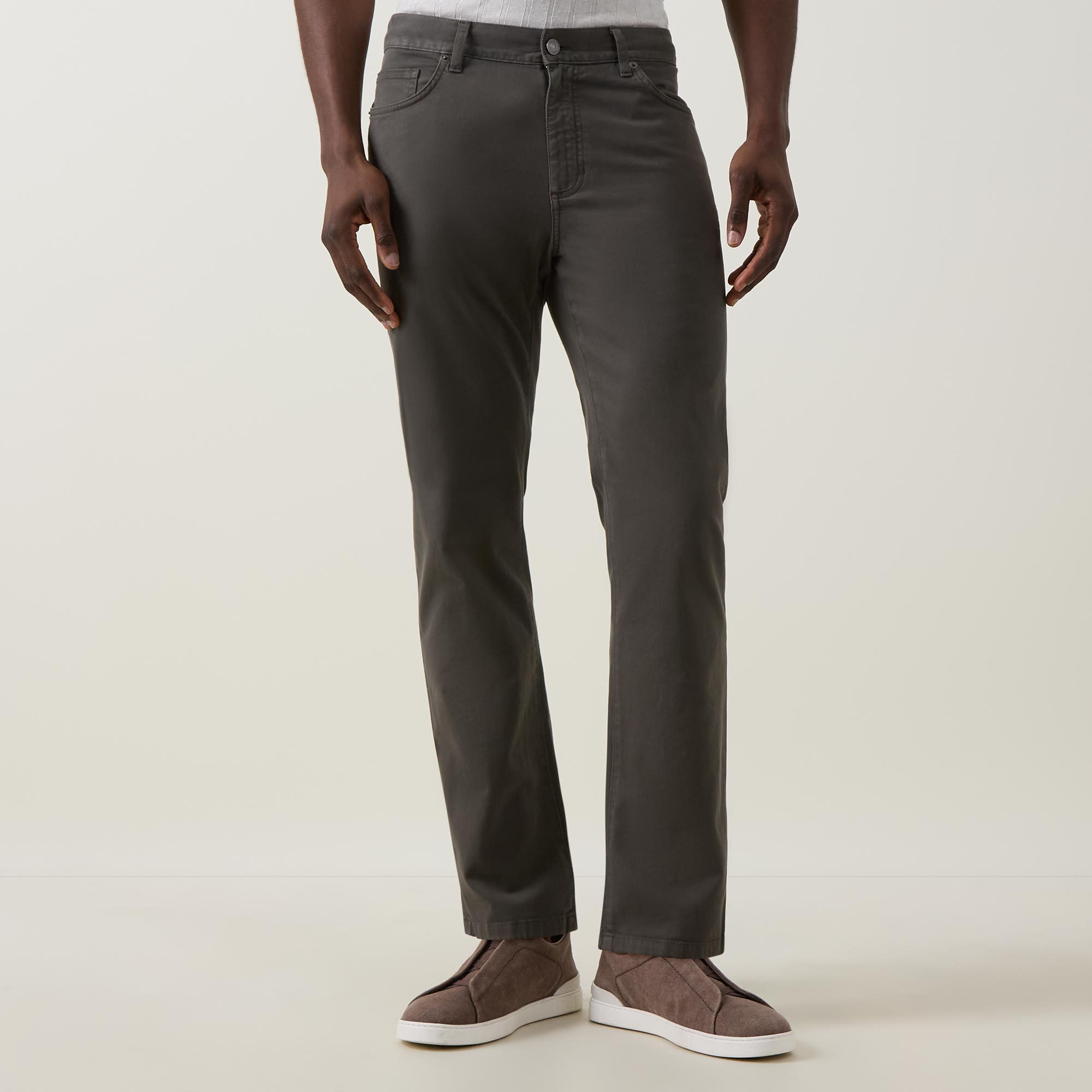 - Button and fly zip fastening, belt loops, five-pocket style, logo badge, straight cut legs