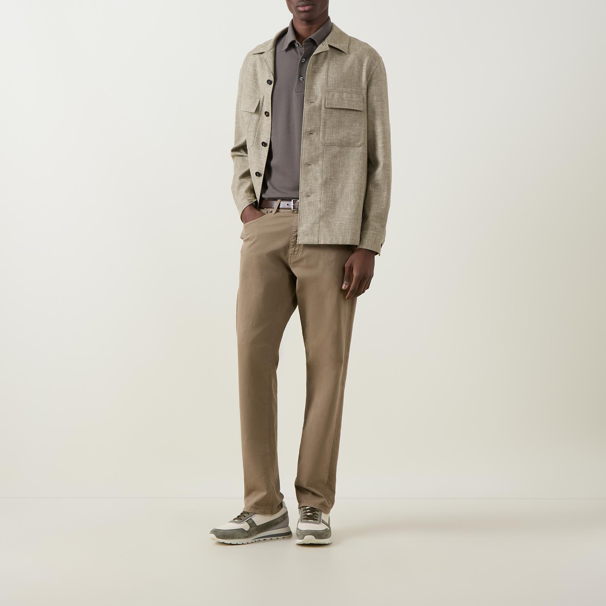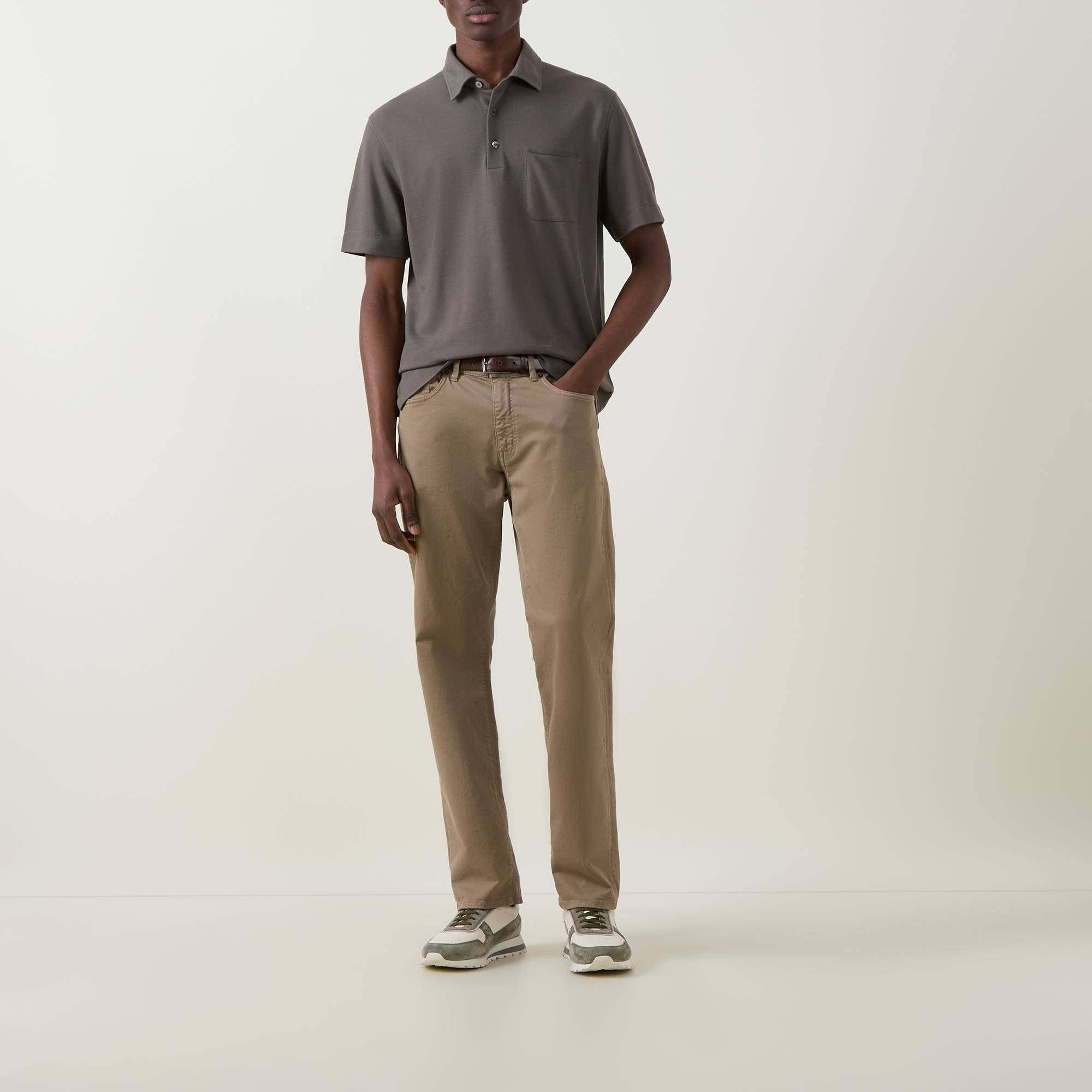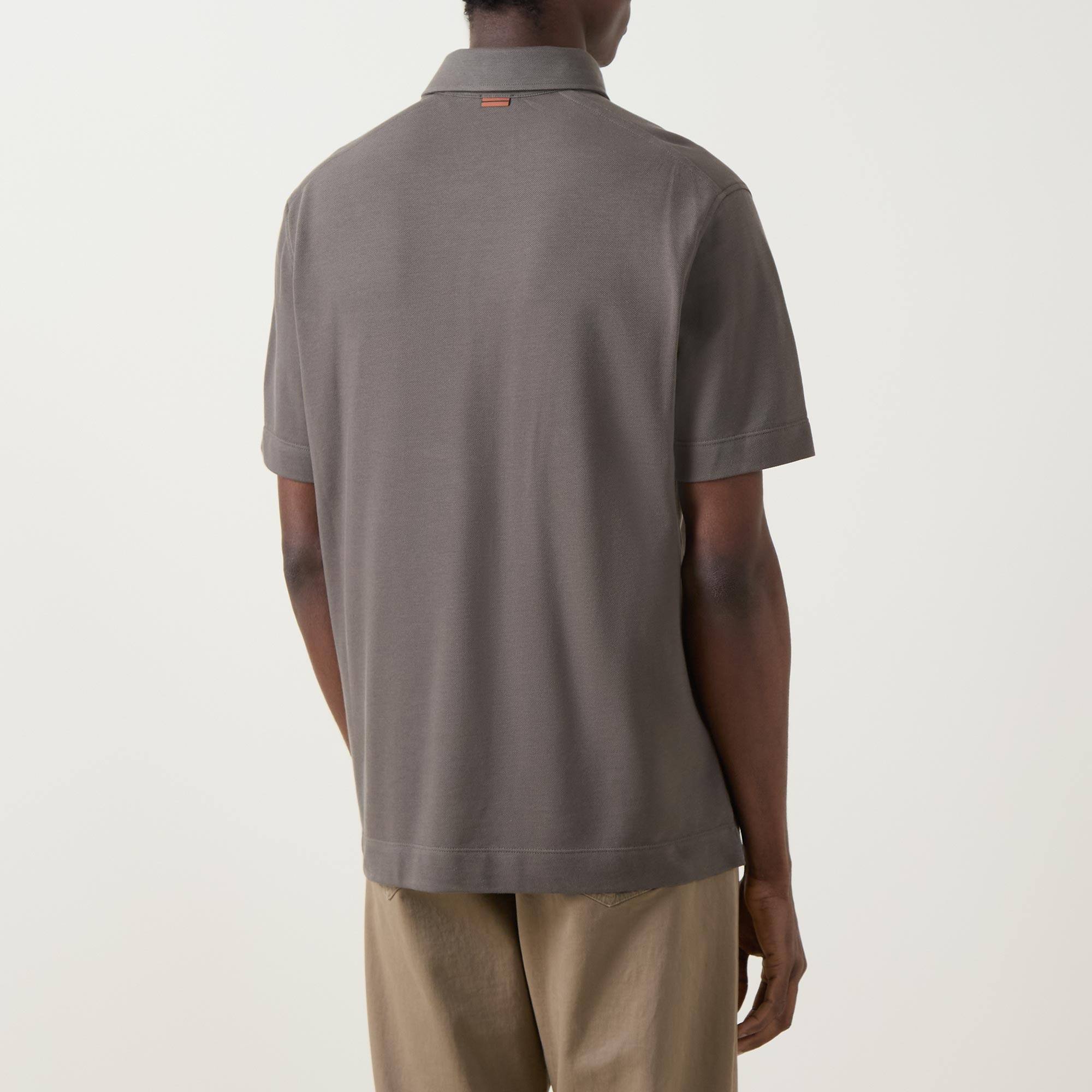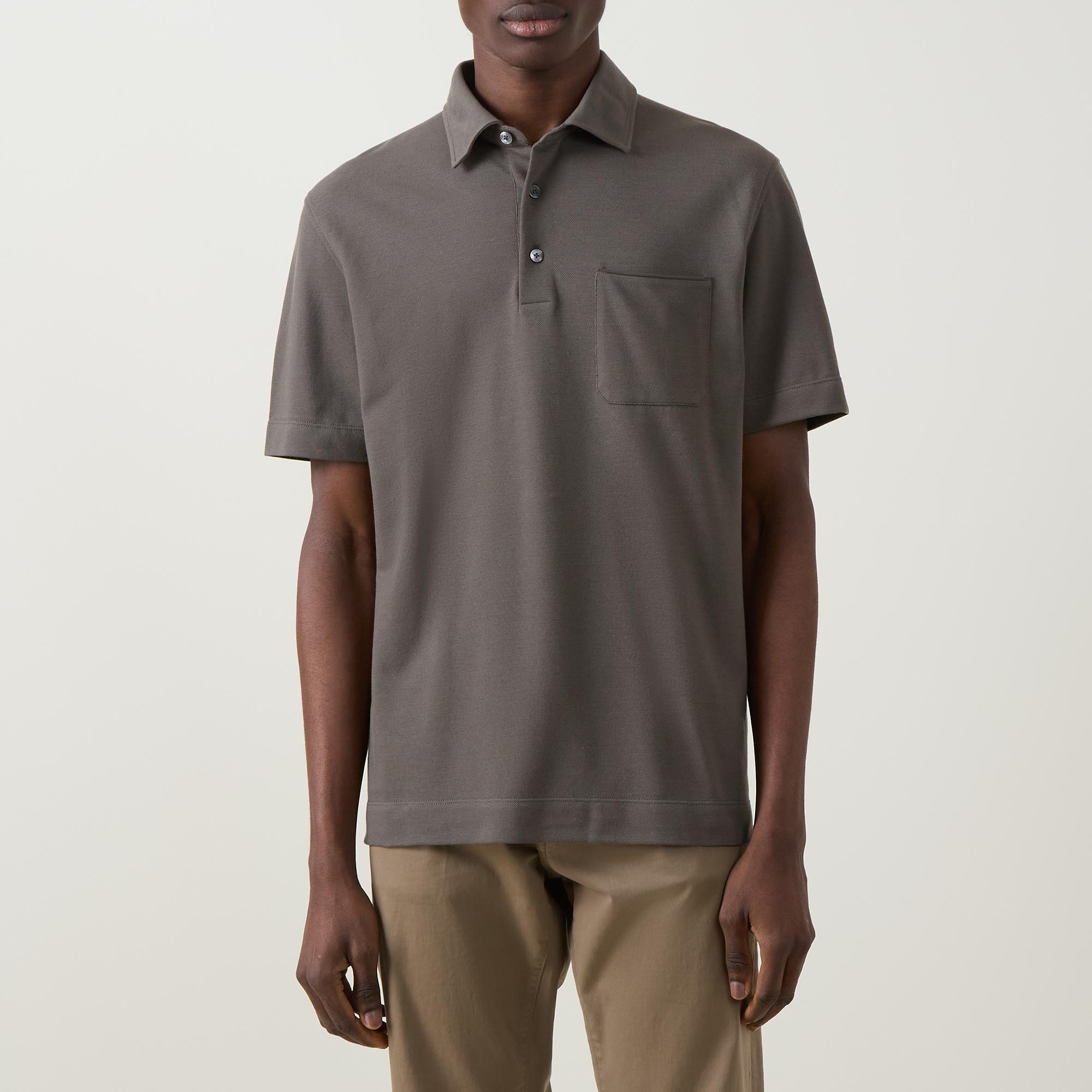 • Polo collar, three button placket, short sleeves, patch pocket on the chest, straight hem, side split detailing, rear logo tag, tonal stitching, smooth finish
