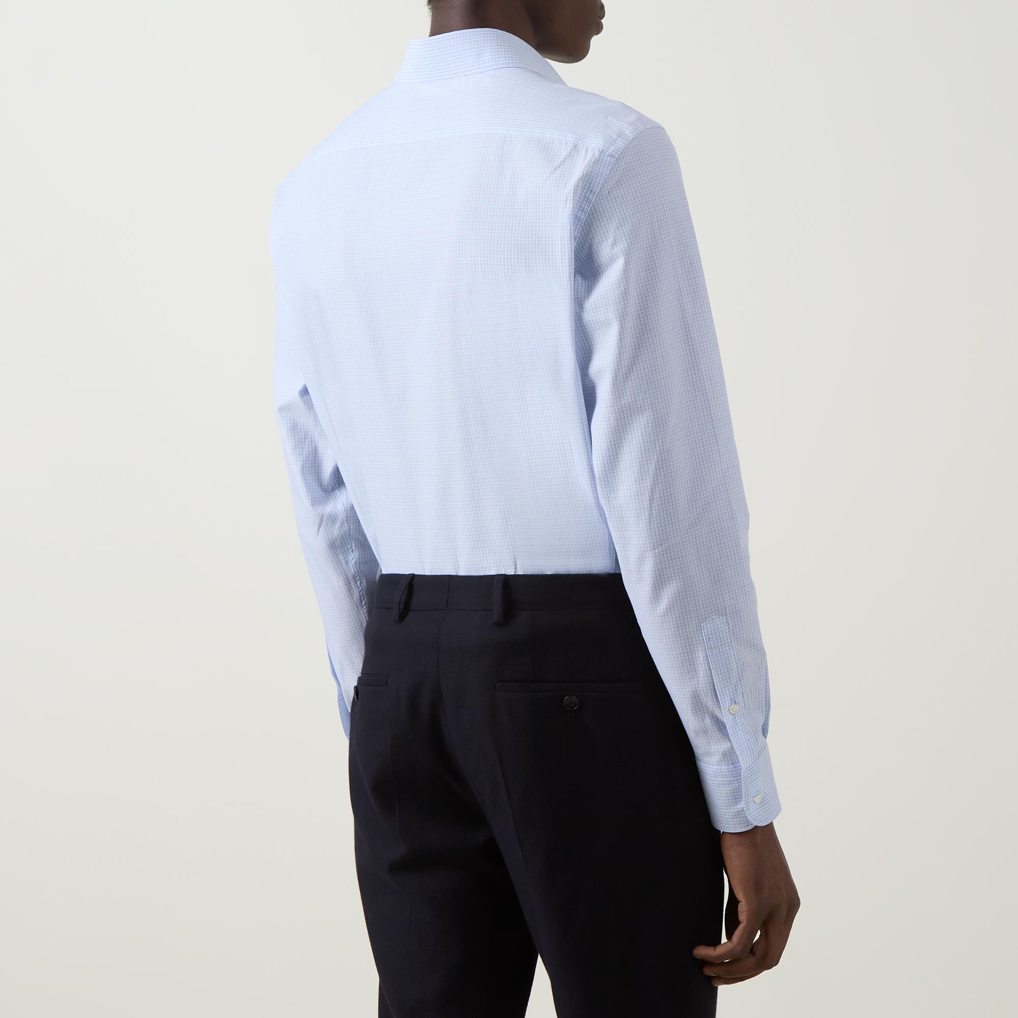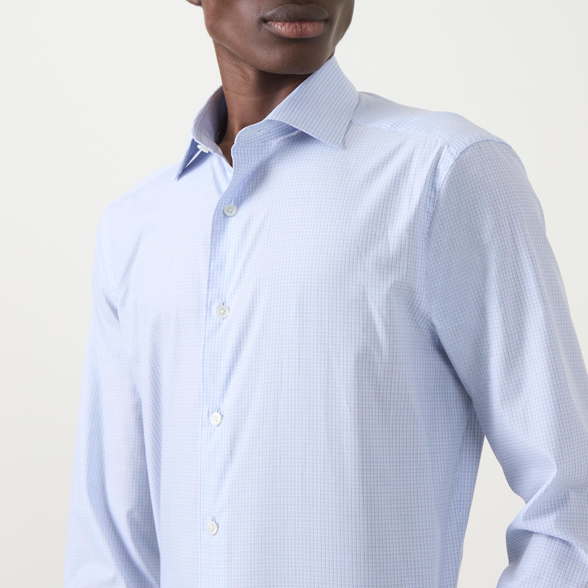 - Spread collar, long sleeves, buttoned cuffs, front button fastening, curved hem, micro check print