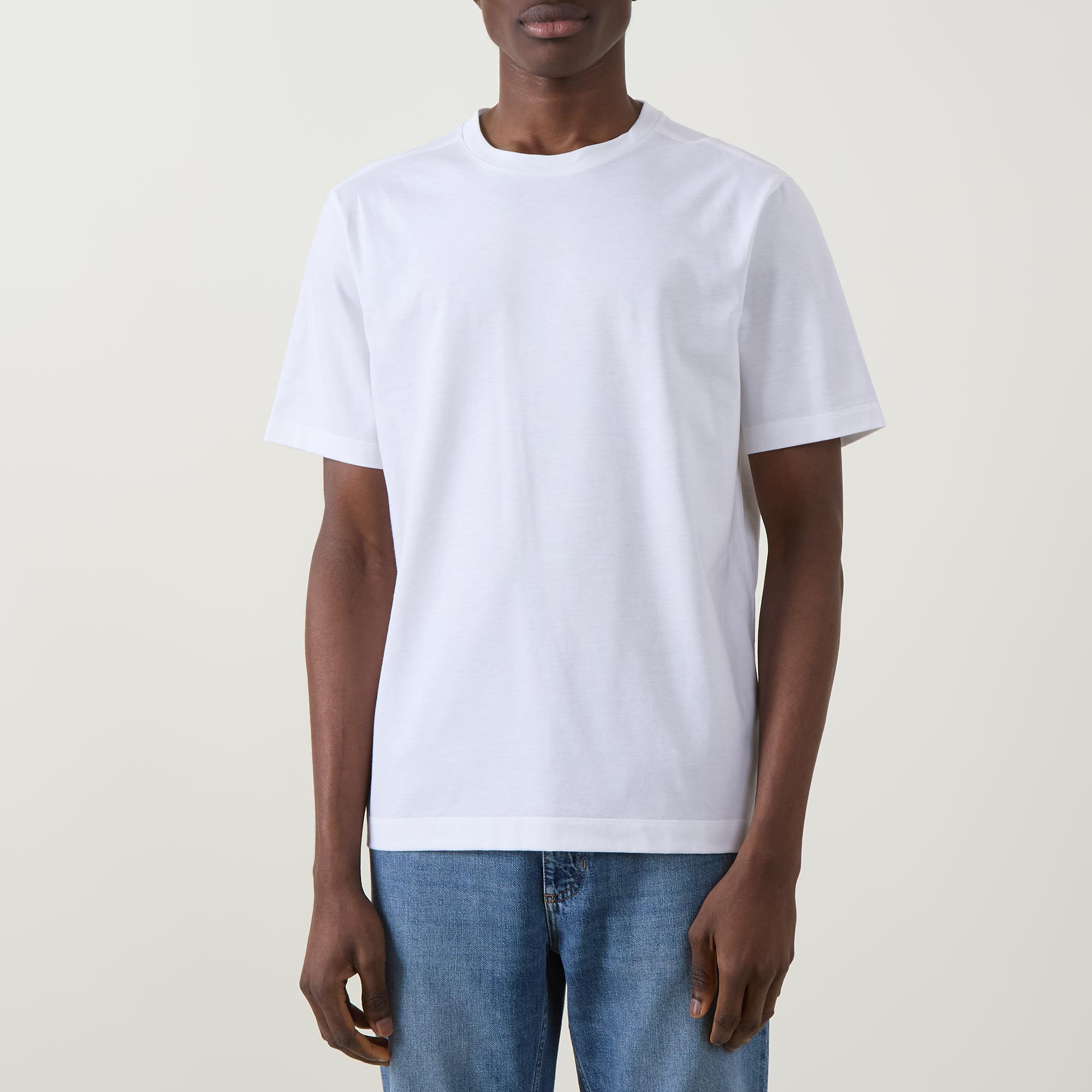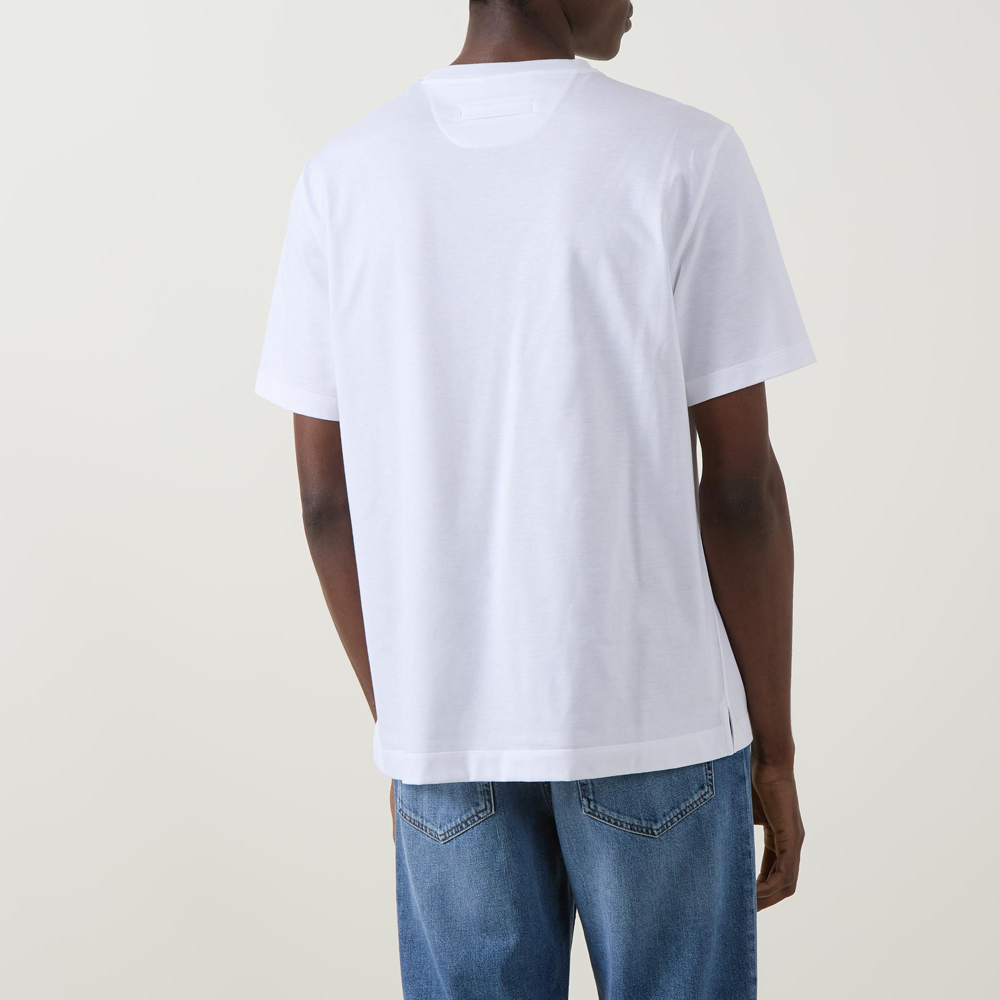 - Crew neck, short sleeves, straight hem, tonal stitching, rear logo detail at the back of the neck, smooth finish