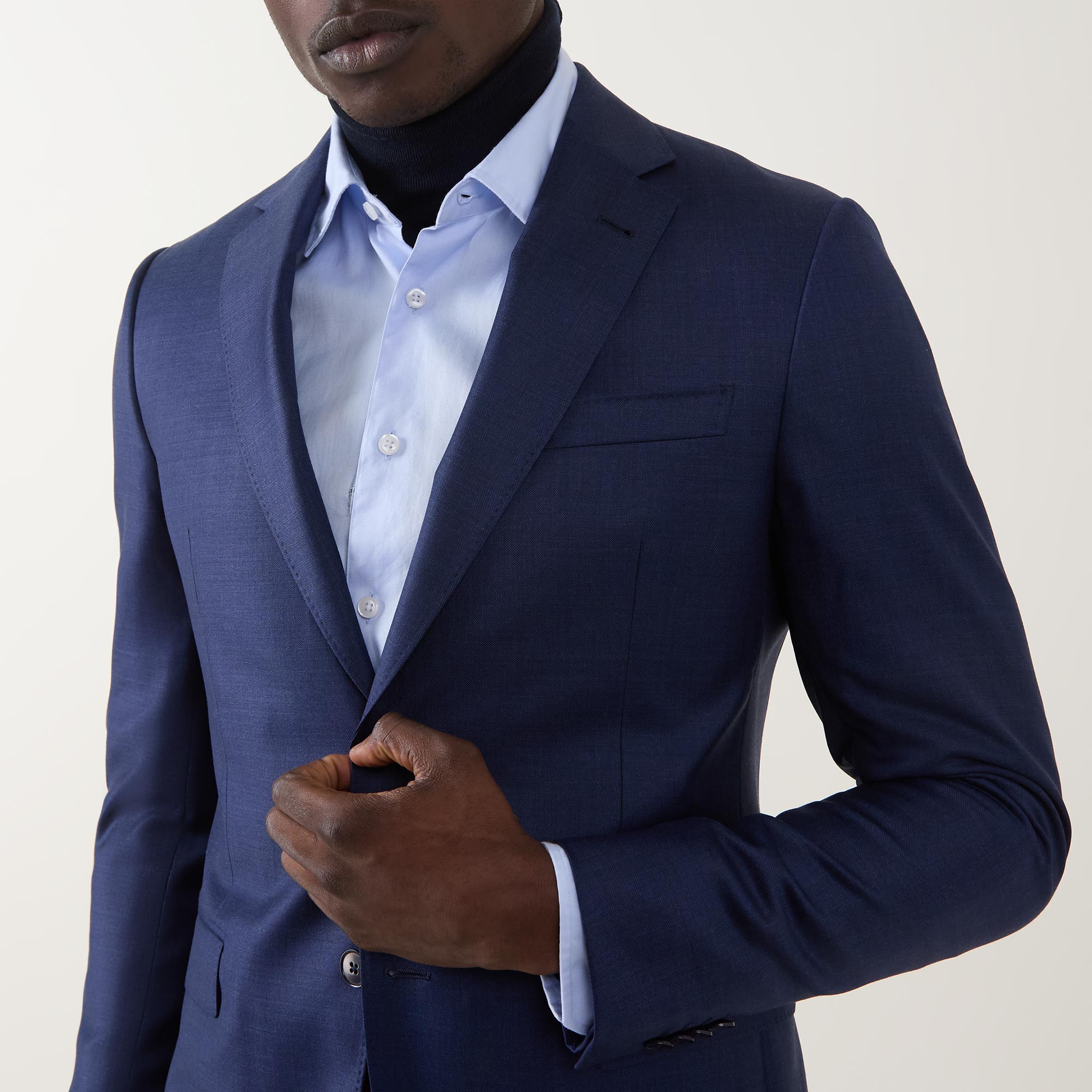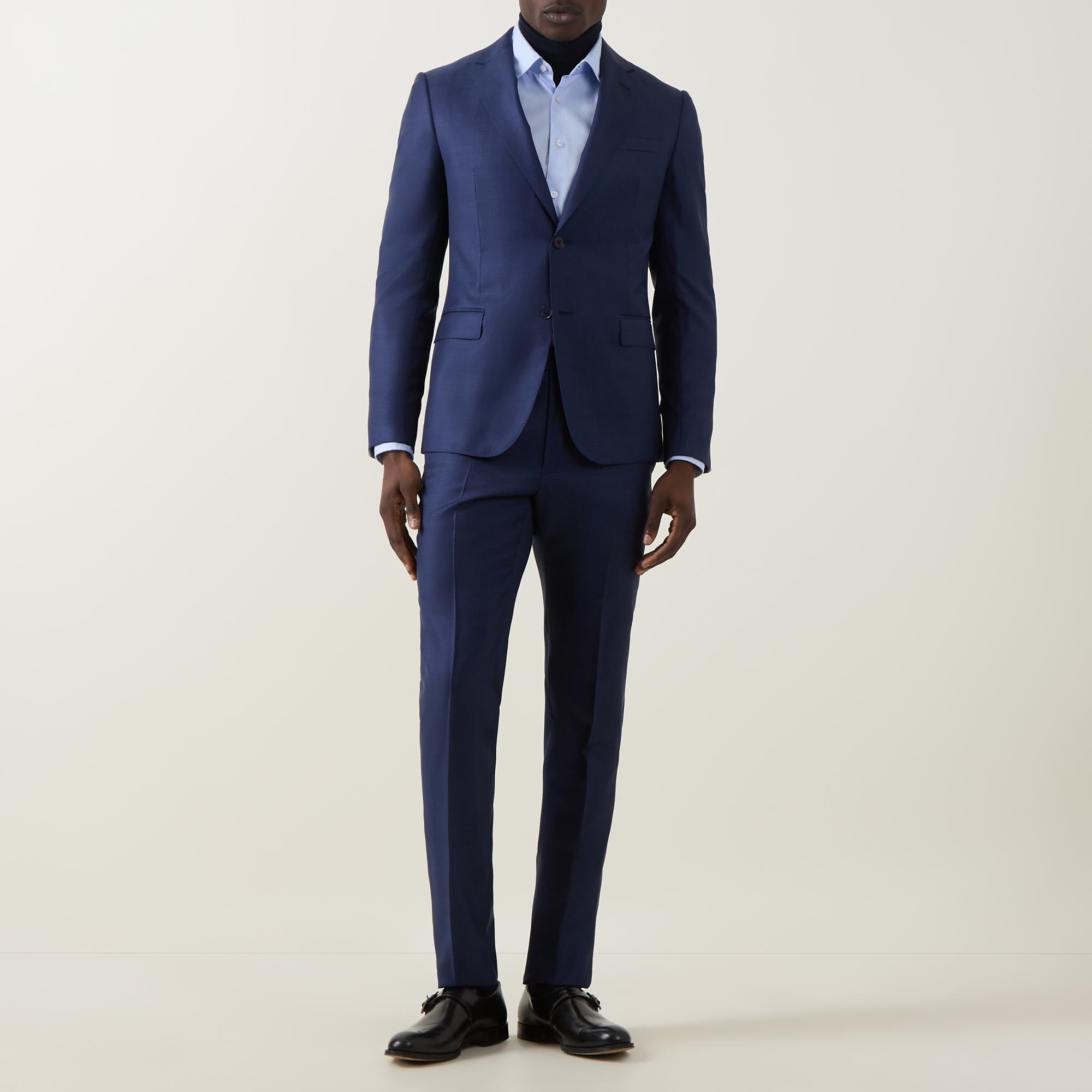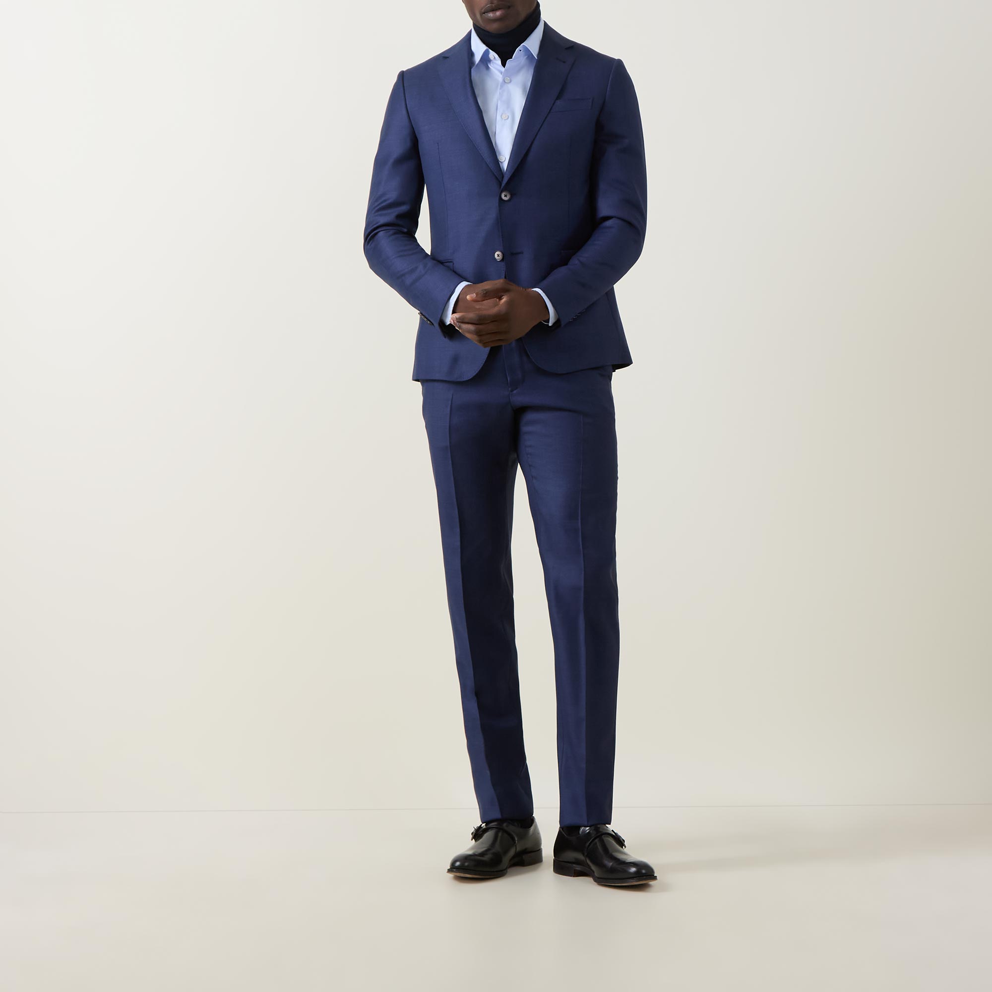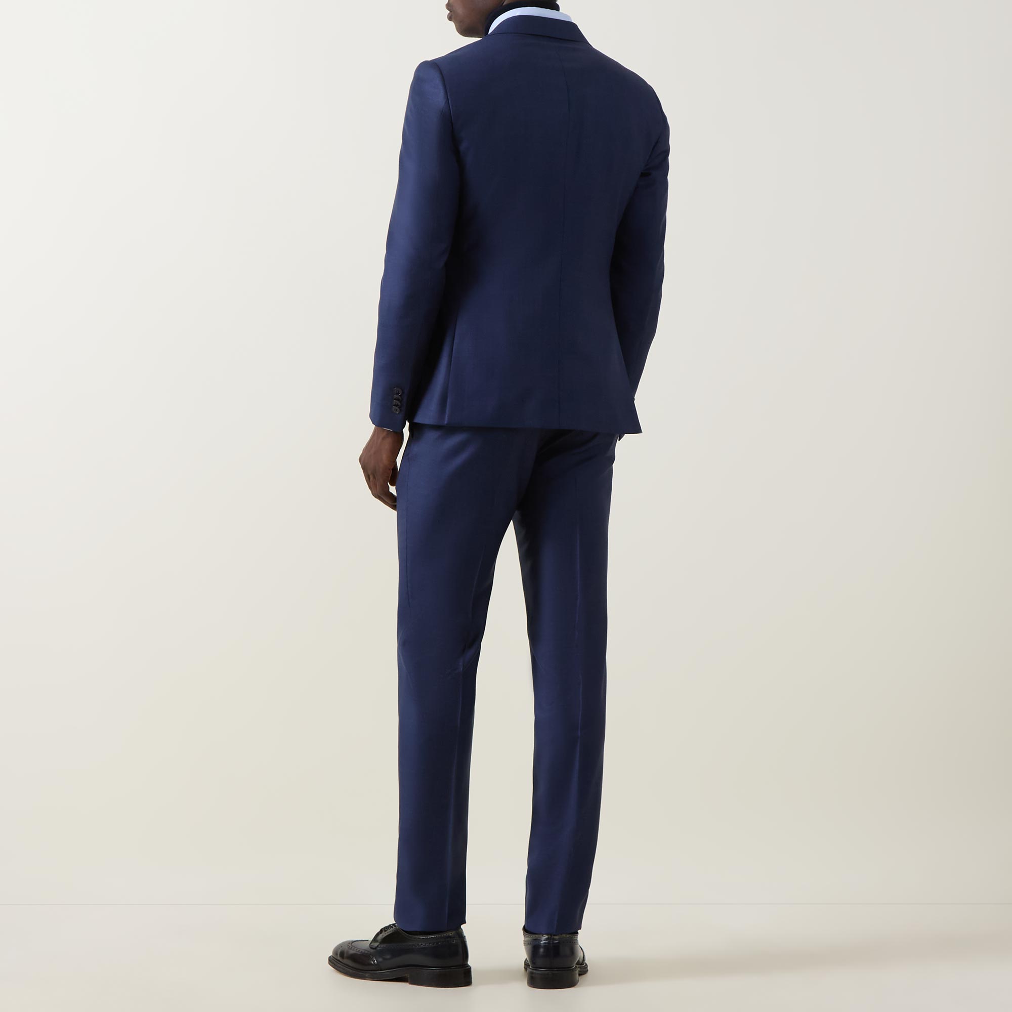 - Two-piece: Jacket: Single breasted, notch lapel collar, long sleeves, buttoned cuffs, front button fastening, one chest welt pocket, two front patch pockets, rear vents, lined; Trousers: Mid rise, slim leg, belt loops, concealed fly with hook and bar fastening, selection of pockets, clean hems, pressed creases, textured design with sateen finish throughout