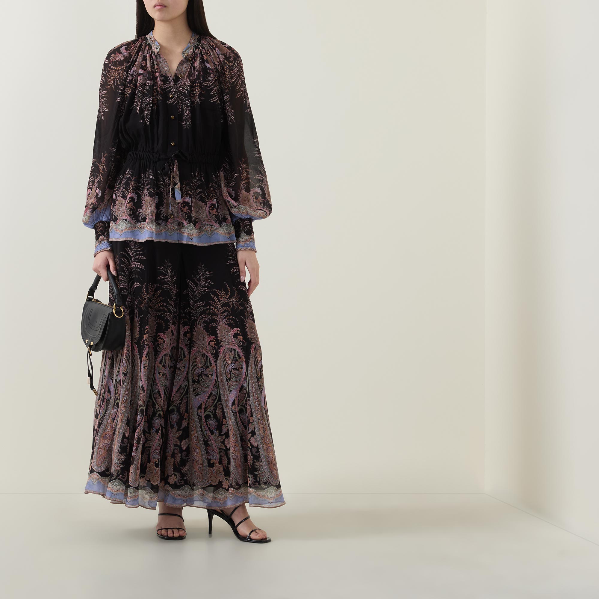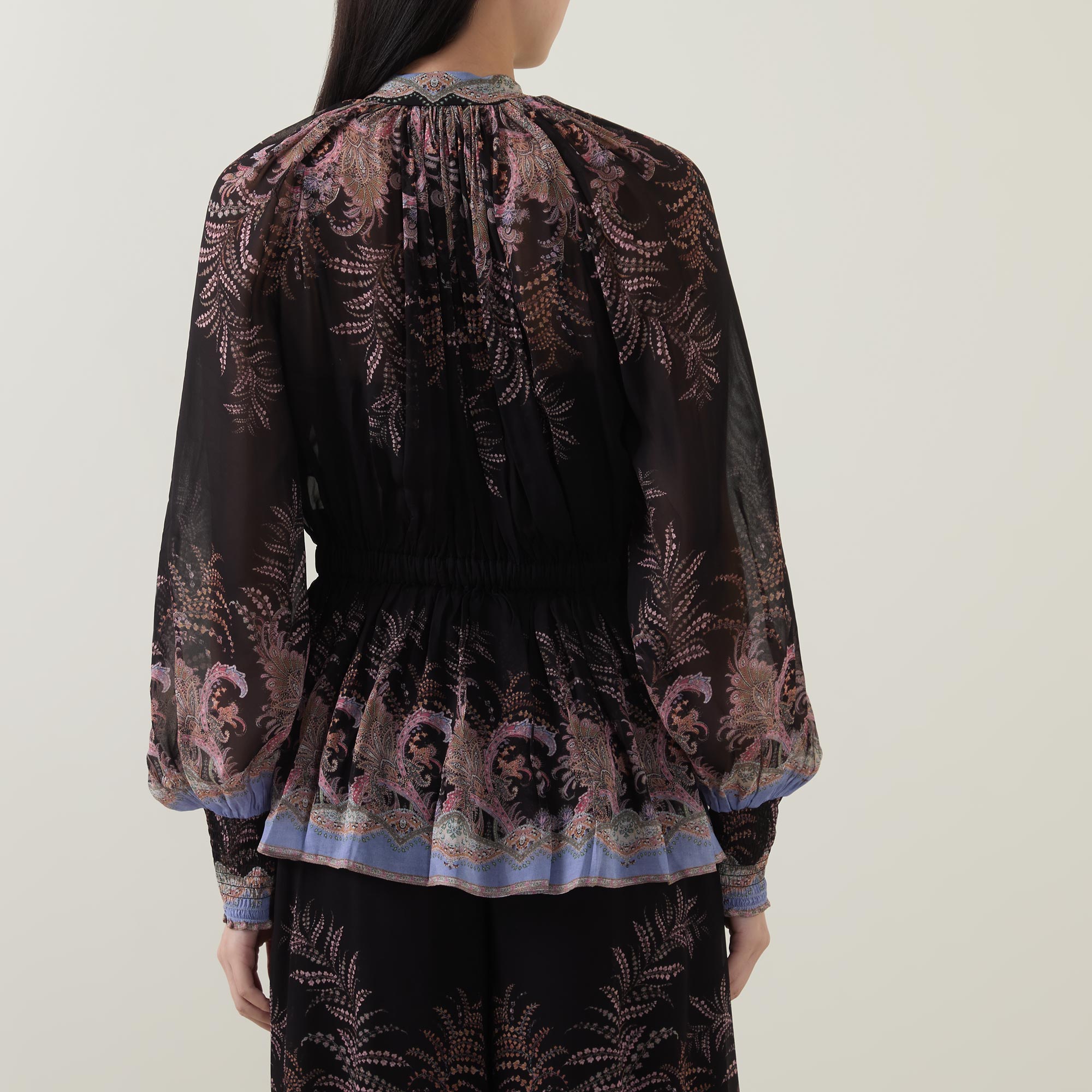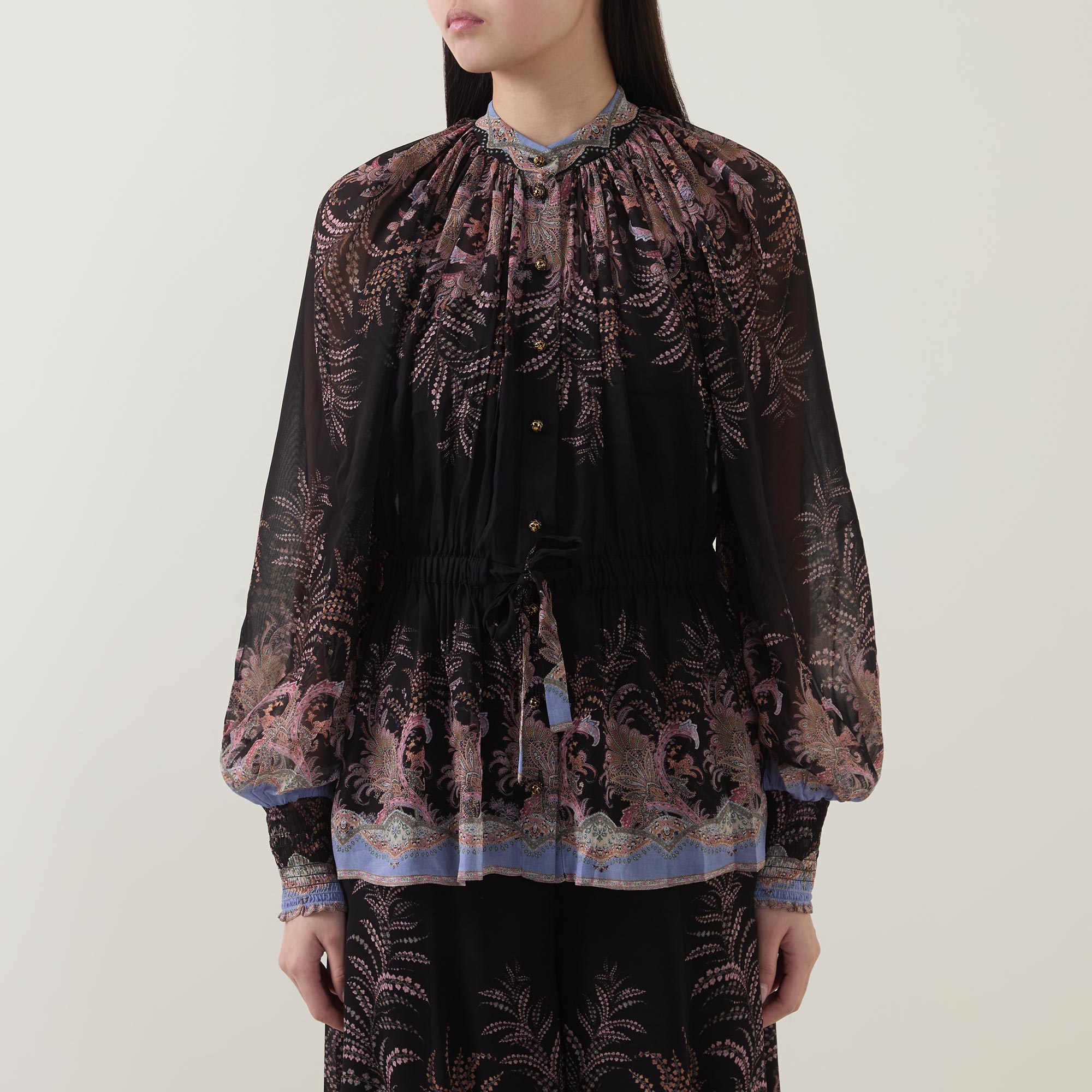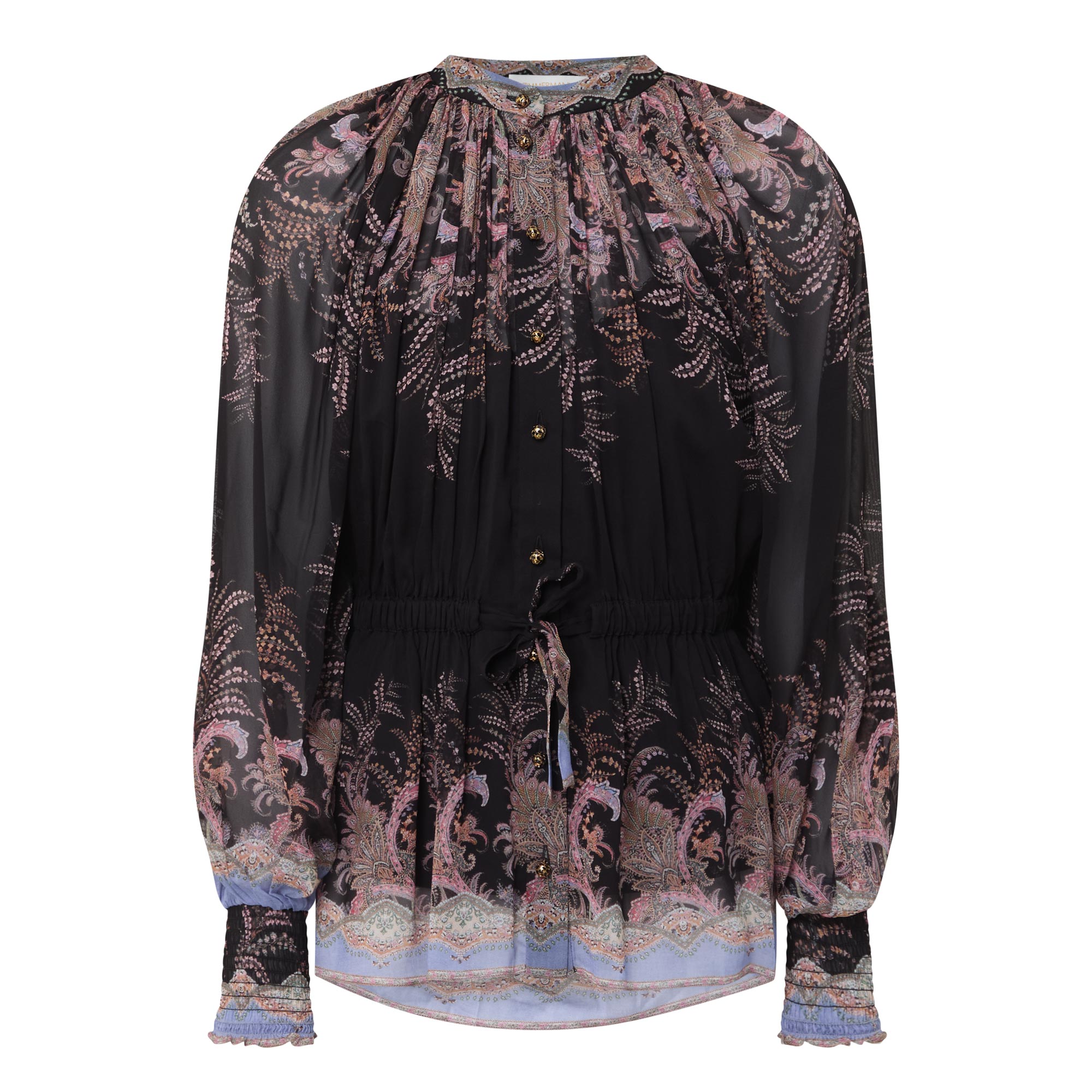 Many of the styles across the Zimmermann Spring 2026 Collection, Kindred Spirit, feature a paisley print, seen here adorning the Alchemy Drawn blouse. Framed with a standing collar and low billowing sleeves, it is finished with heavily gathered details and an elasticated drawstring to the waist.
