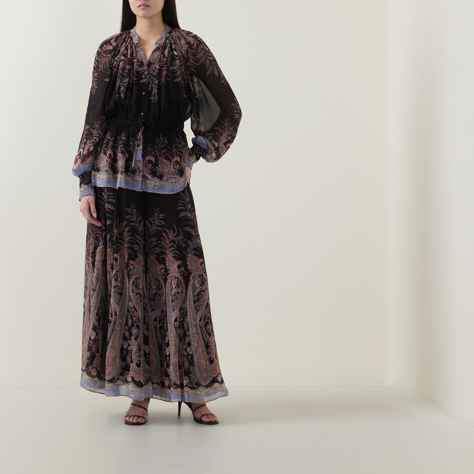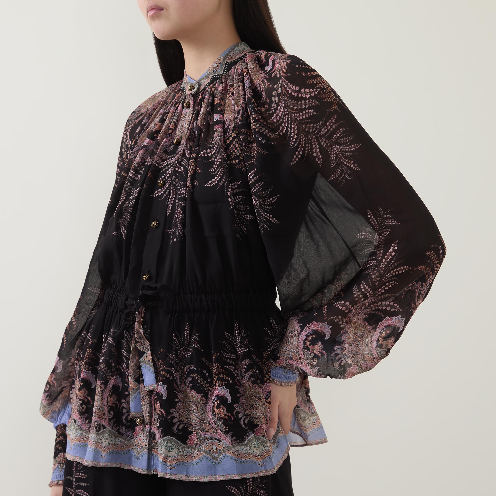 • Standing collar, long billowing sleeves, elasticated cuffs, button fastening, elasticated waist with self-tie adjustable fit, separate slip cami, paisley pattern