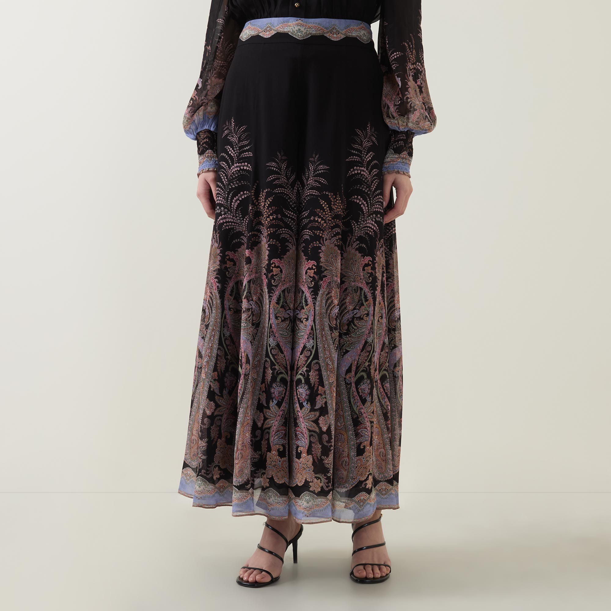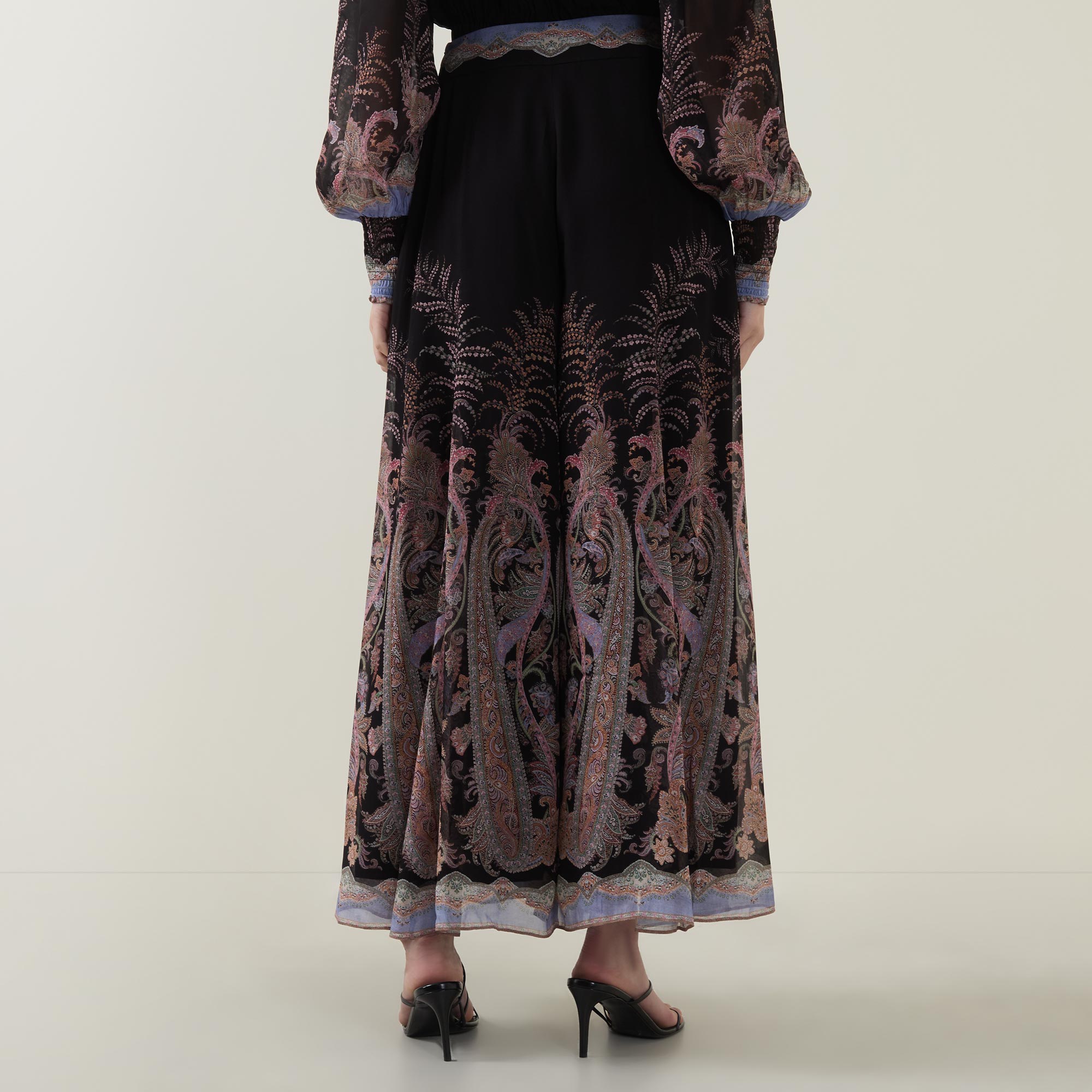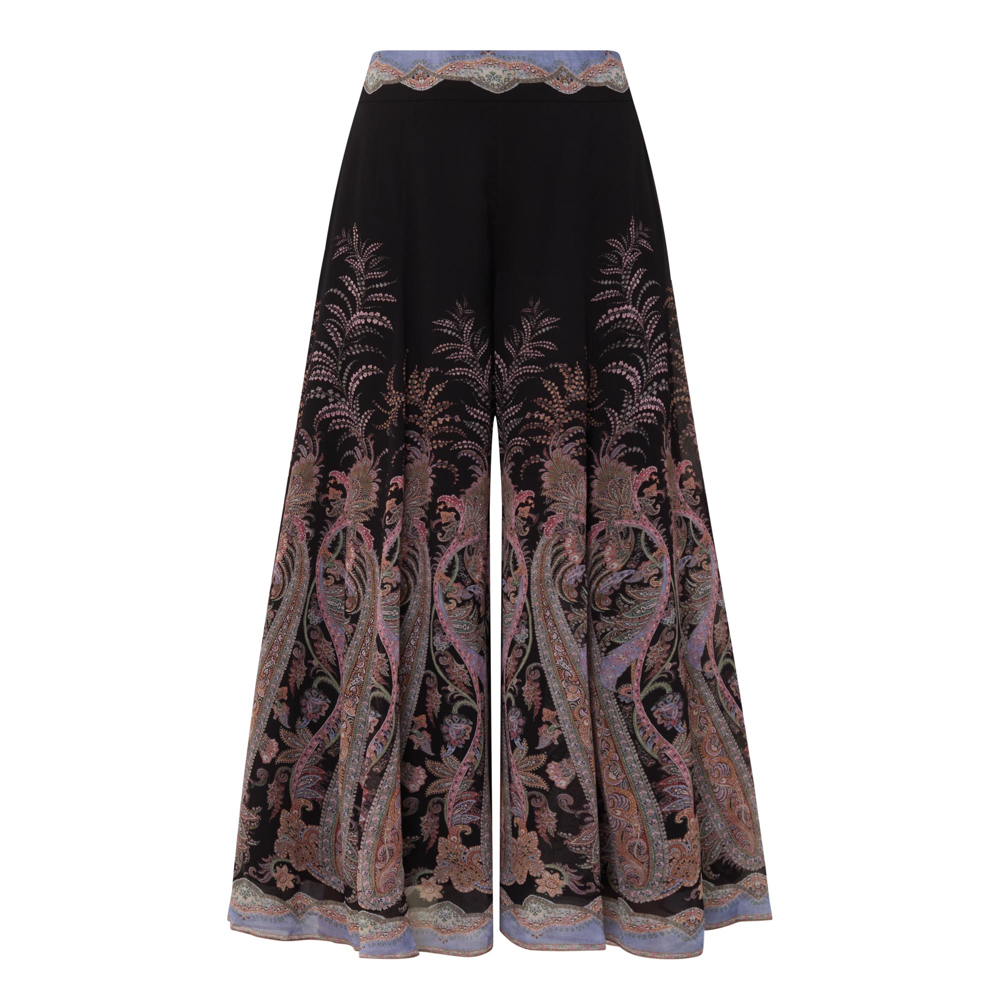 - Fixed waistband with invisible side seam zip fastening, gathered details though the legs, wide flared hems, lined, paisley patter
