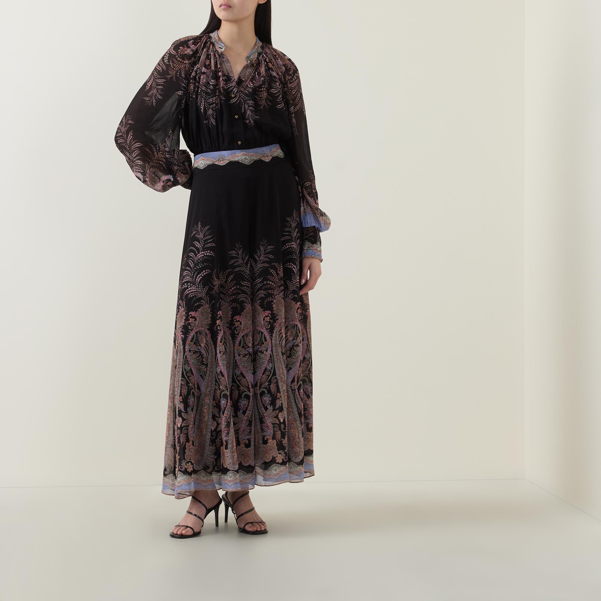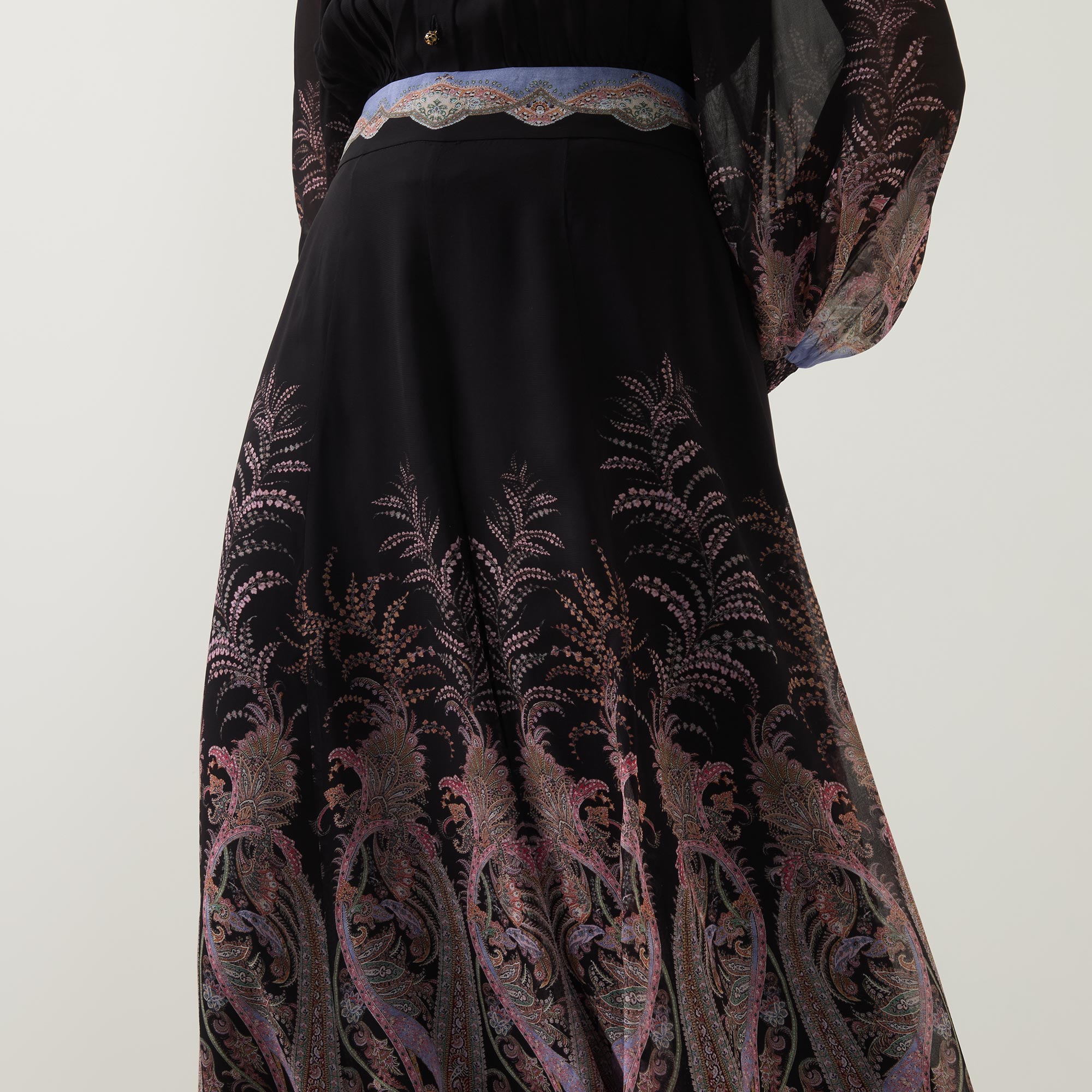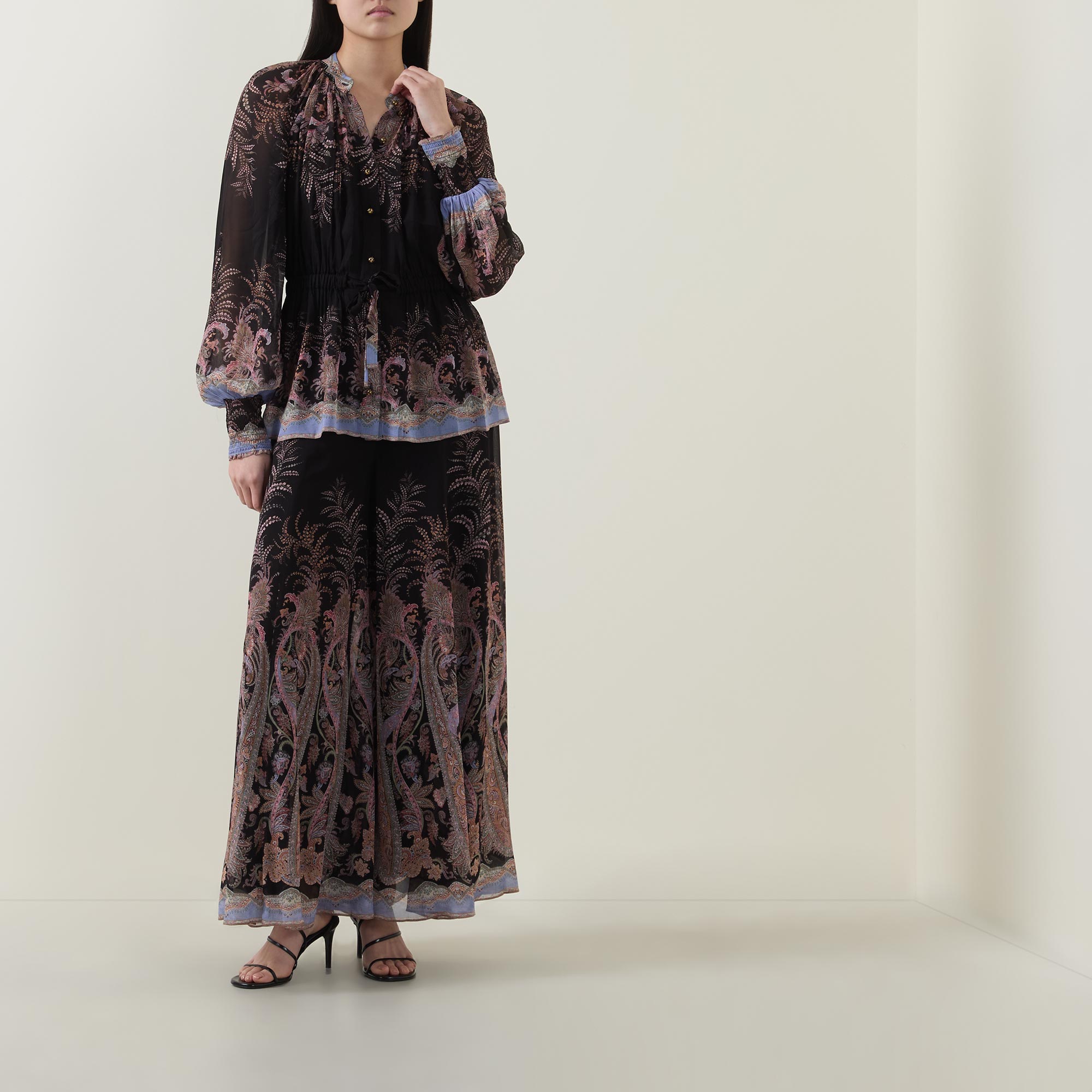 - Fixed waistband with invisible side seam zip fastening, gathered details though the legs, wide flared hems, lined, paisley patter