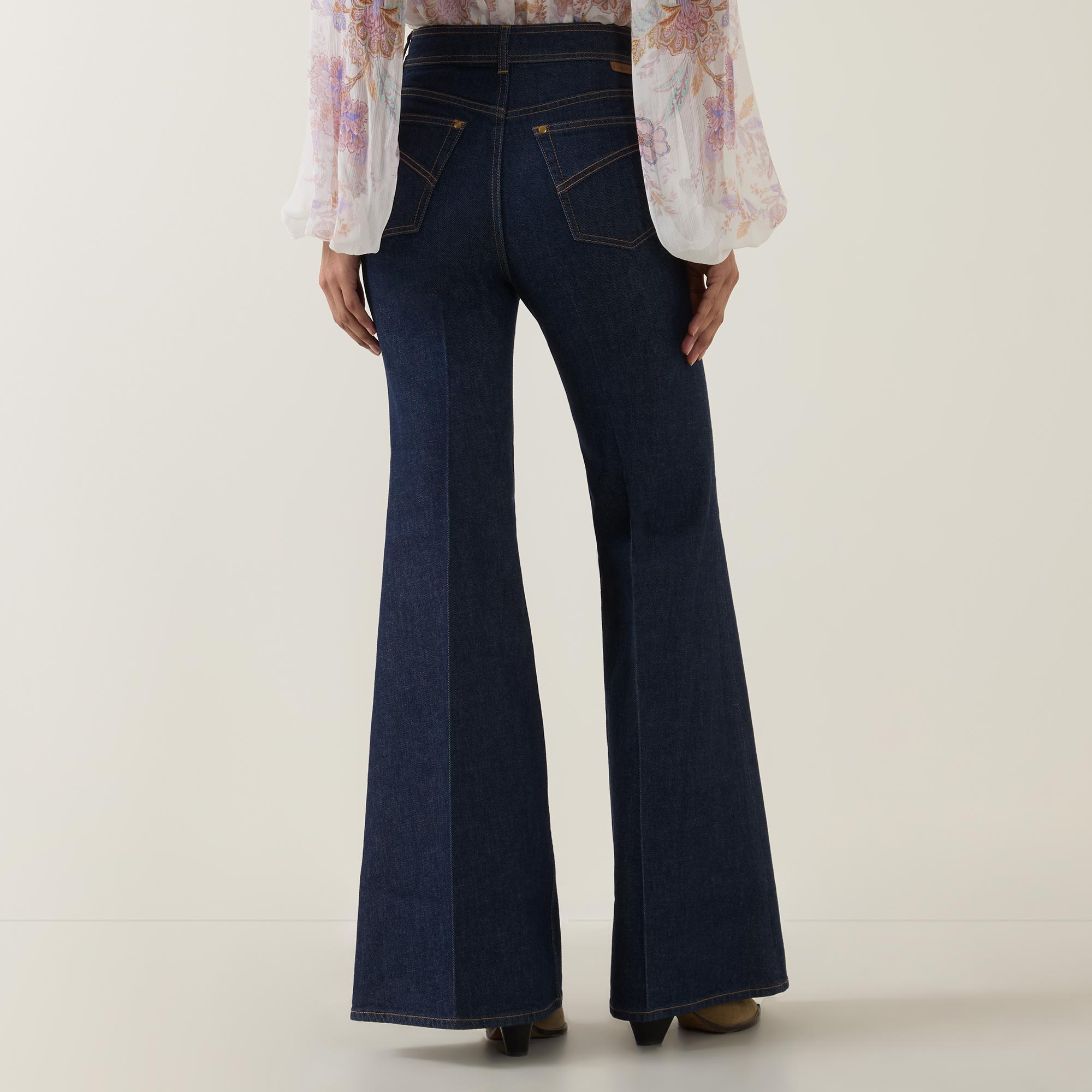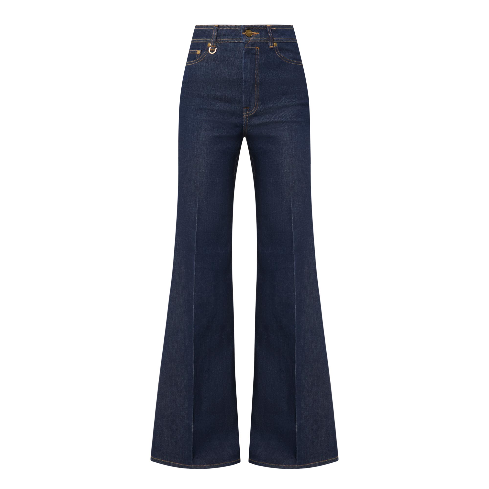 - Mid rise, flared leg, full length, belt loops, concealed fly and button fastening, two side seam pockets, two rear patch pockets, clean hems, topstitching throughout, dark wash finish