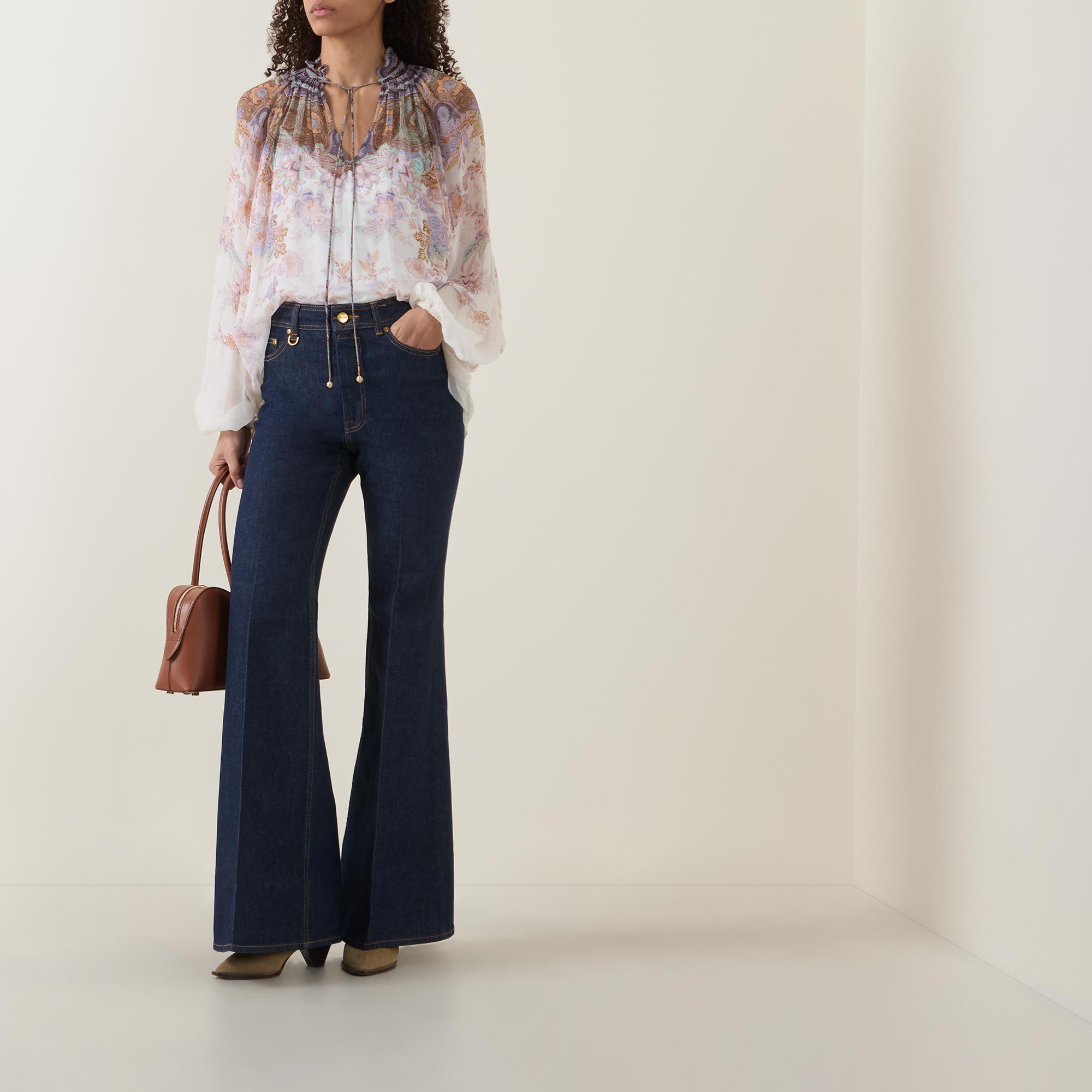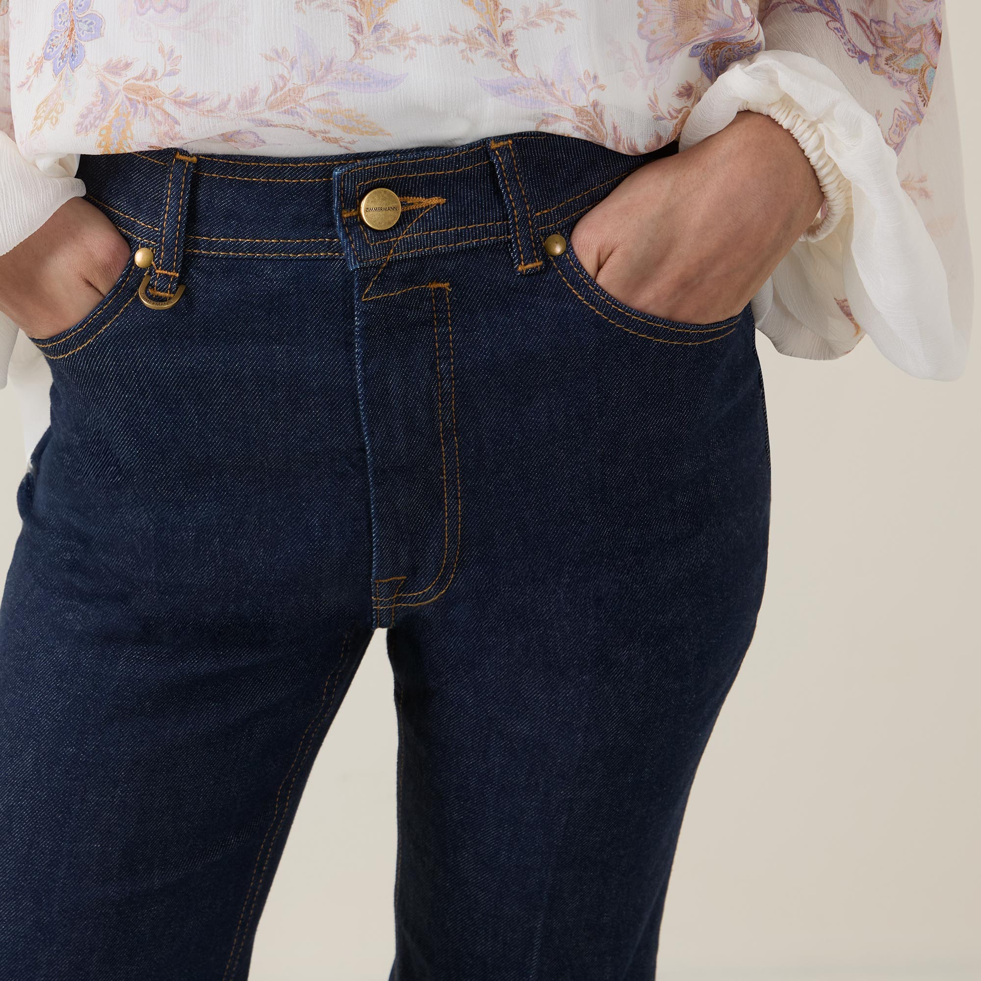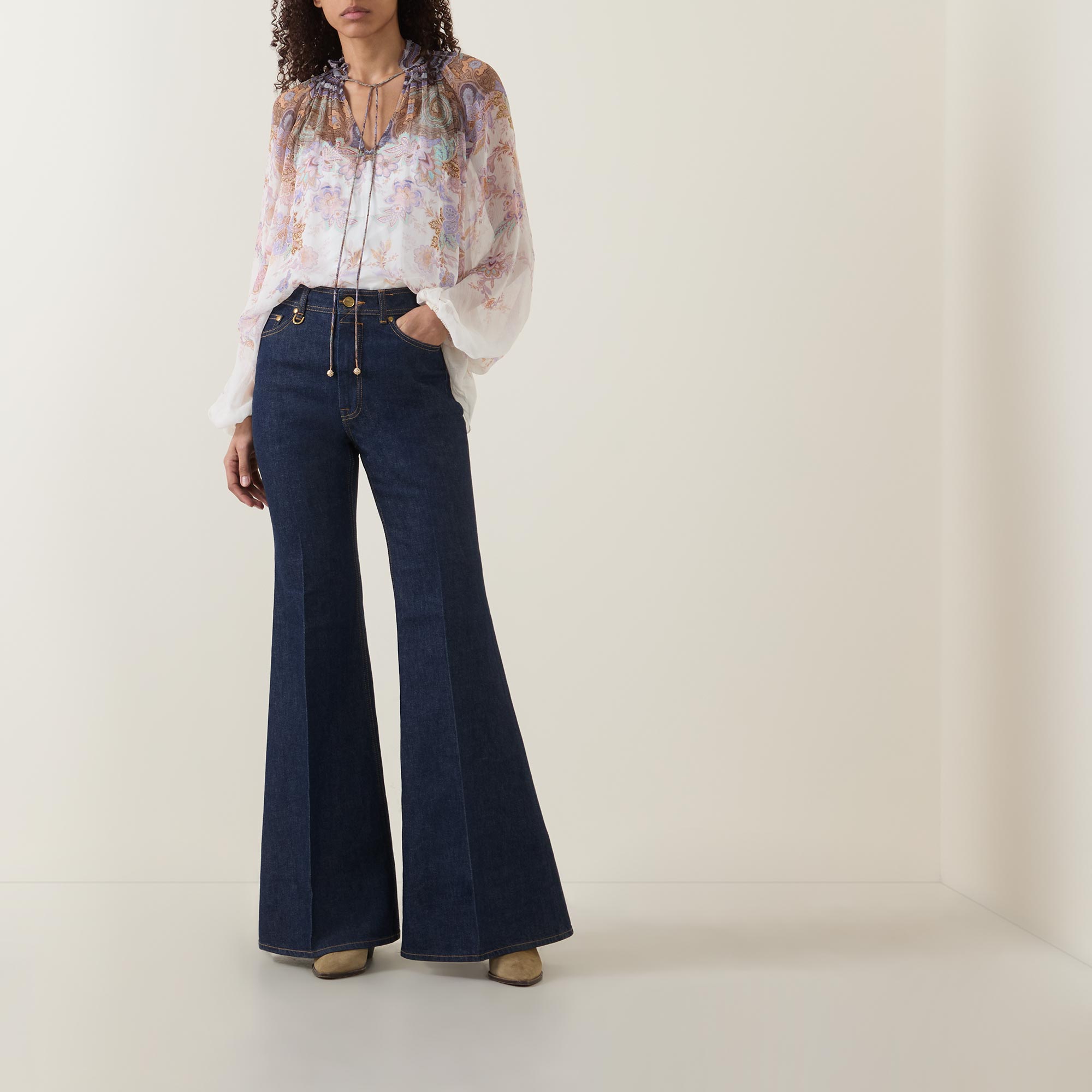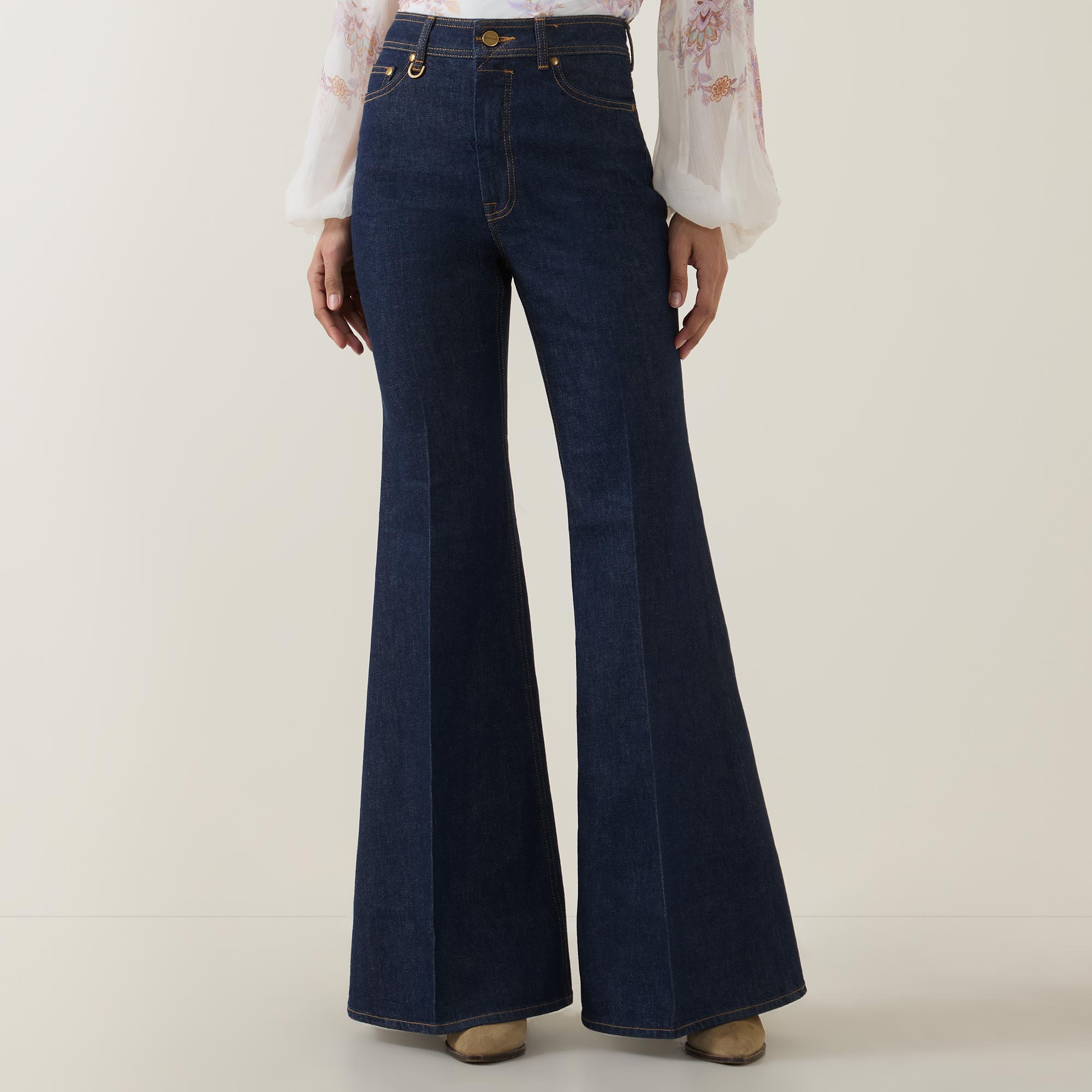 Denim plays a central role in Zimmermann's Spring 2026 Kindred Spirit collection, from utility minis to flared jeans, grounding the brand's latest offering in wearability and structure. Take these jeans — sitting mid rise on the waist and cut to a flared leg silhouette, they feature belt loops for an adjustable fit and a selection of pockets to store your essentials, while finished with pressed creases for a polished edge.
