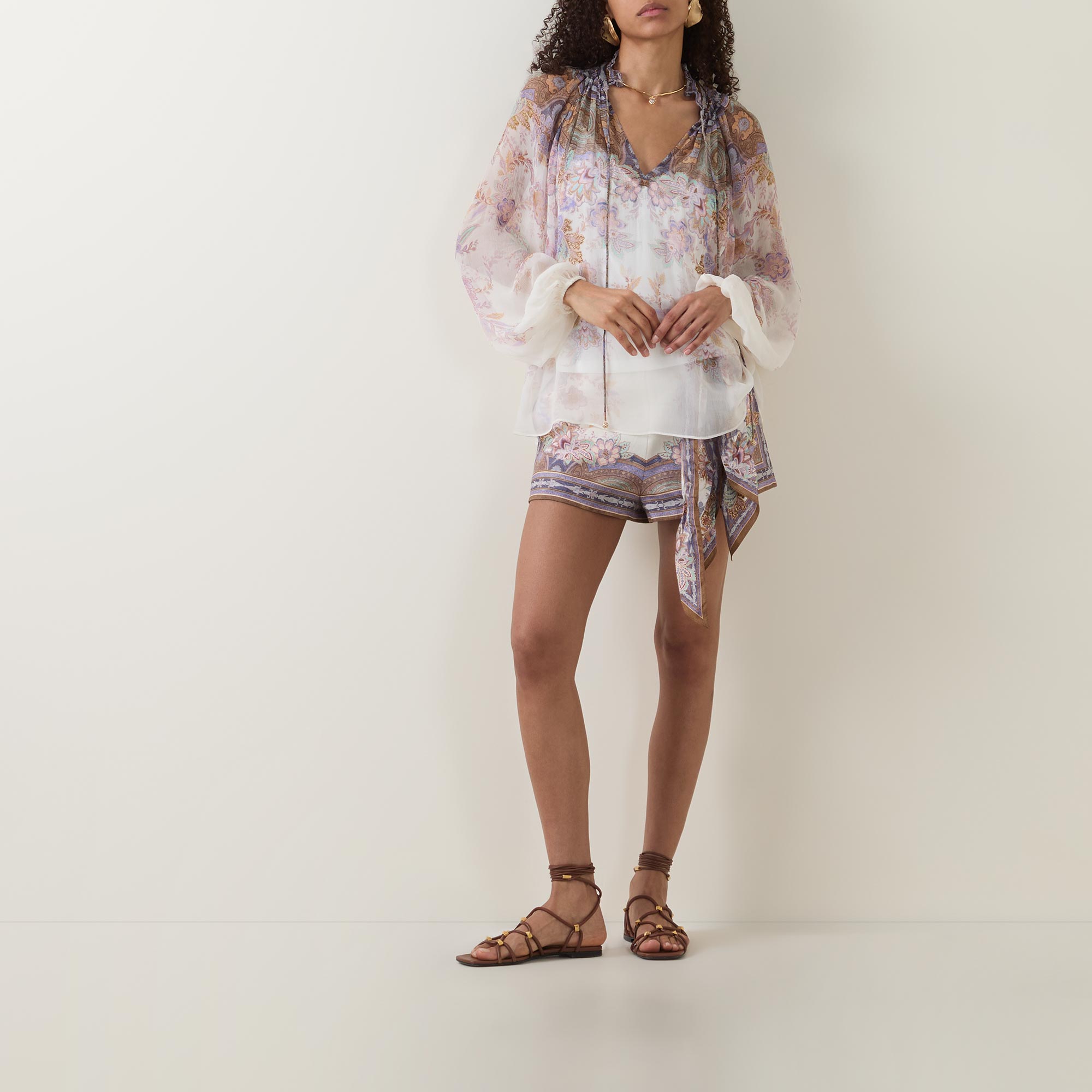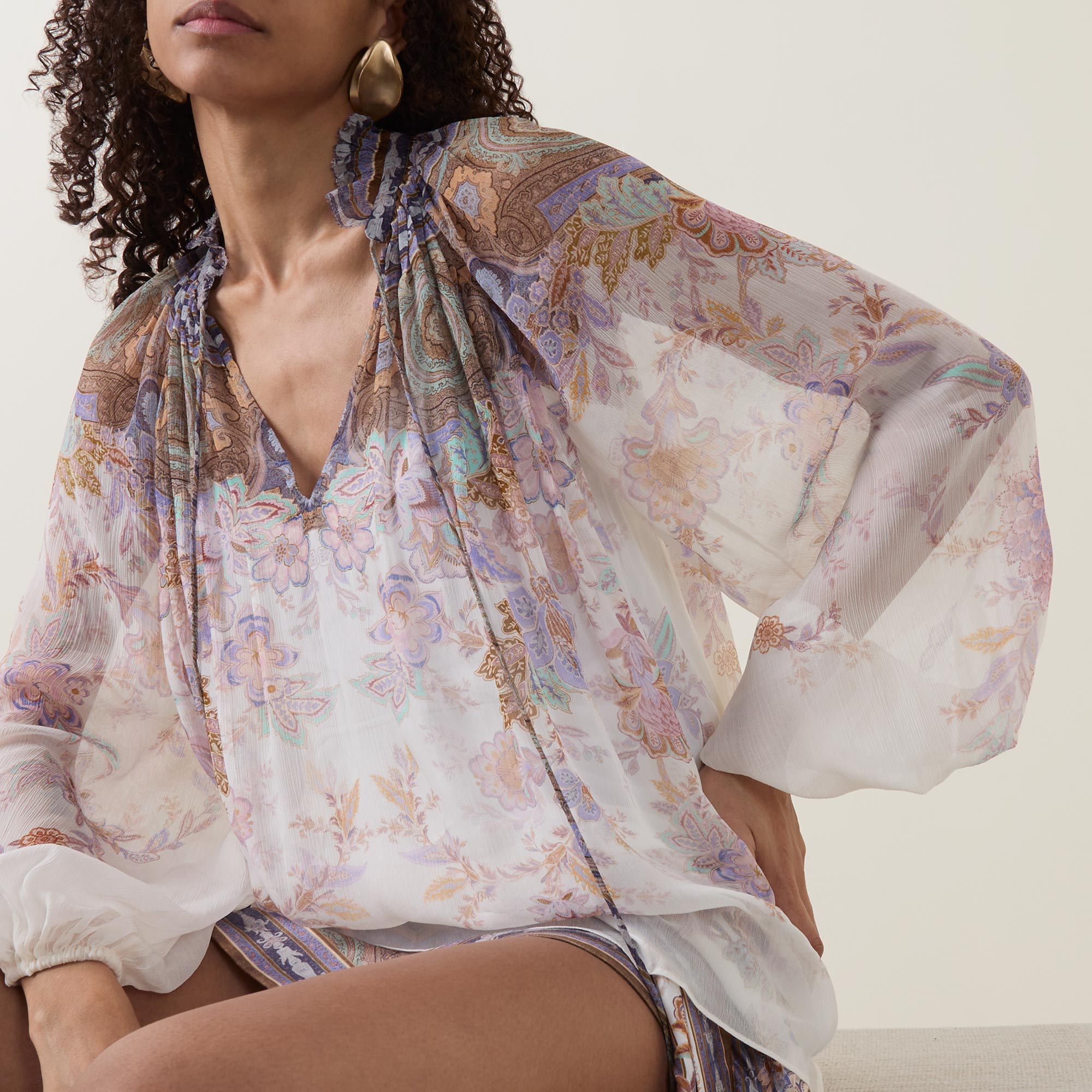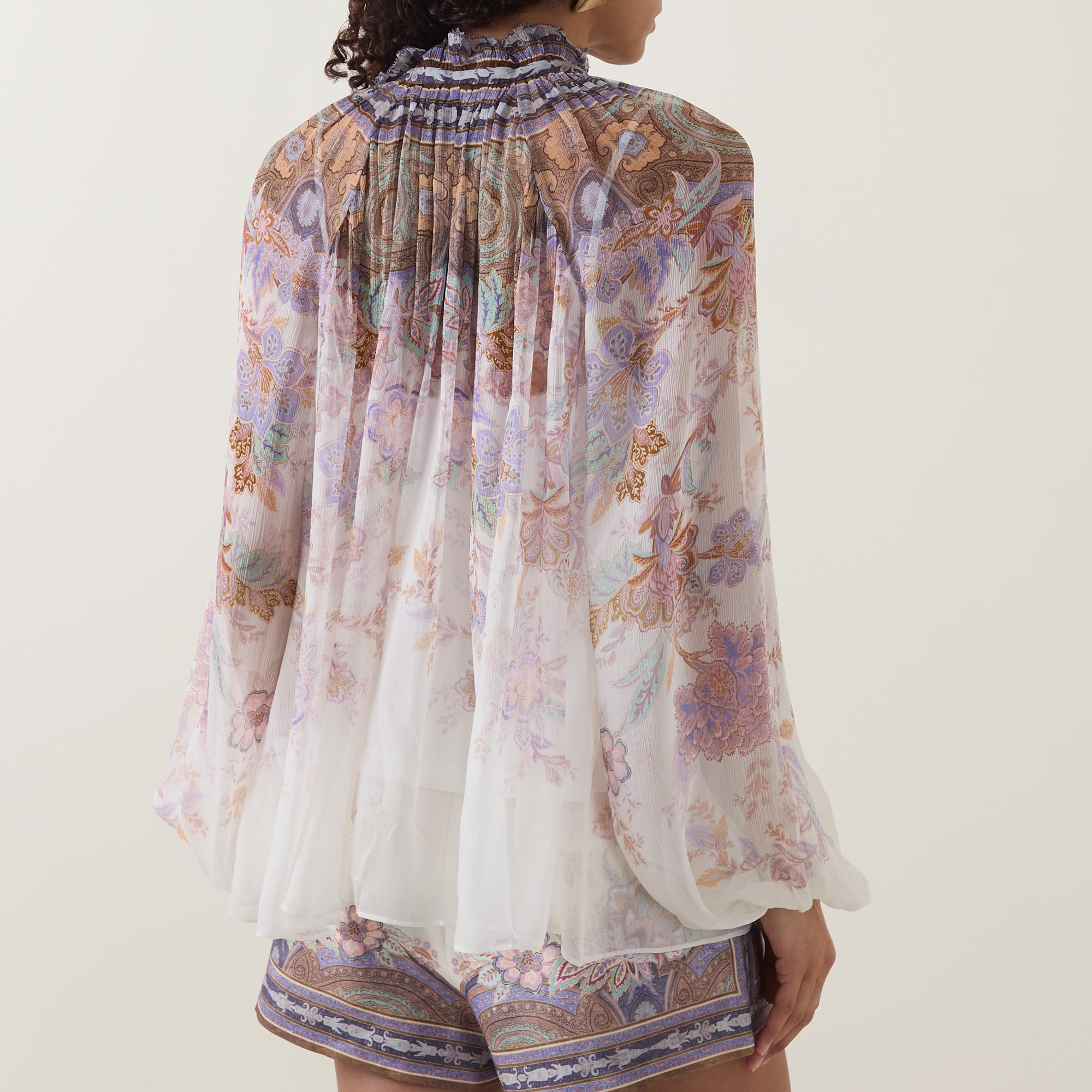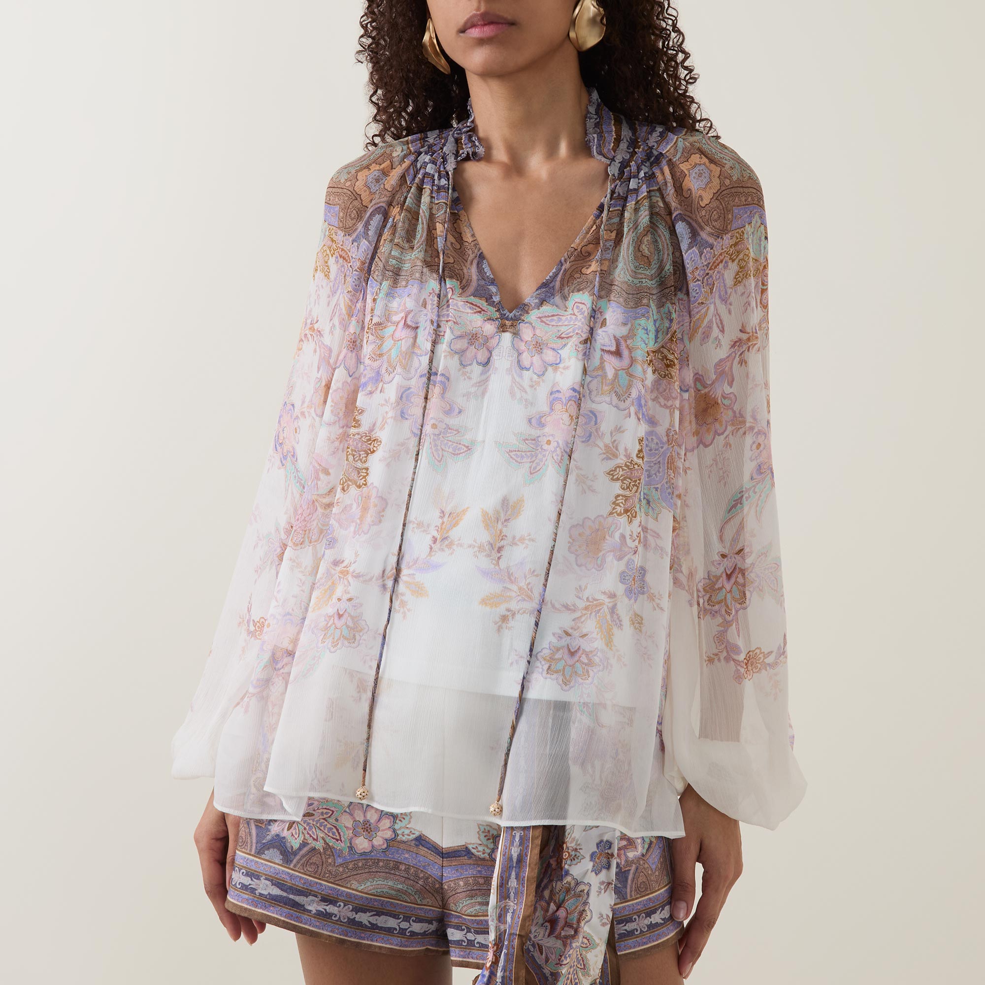 The Kindred Spirit Spring 2026 collection from Zimmermann is defined by graphic florals and soft yet structured designs, take the Luna blouse. Framed by a rouleau neckline and tie fastening, it features long billow sleeves with elasticated cuffs for versatile styling. The semi-sheer design is adorned in the brand's signature Cream Blue Paisley print and includes a separate slip for layering.