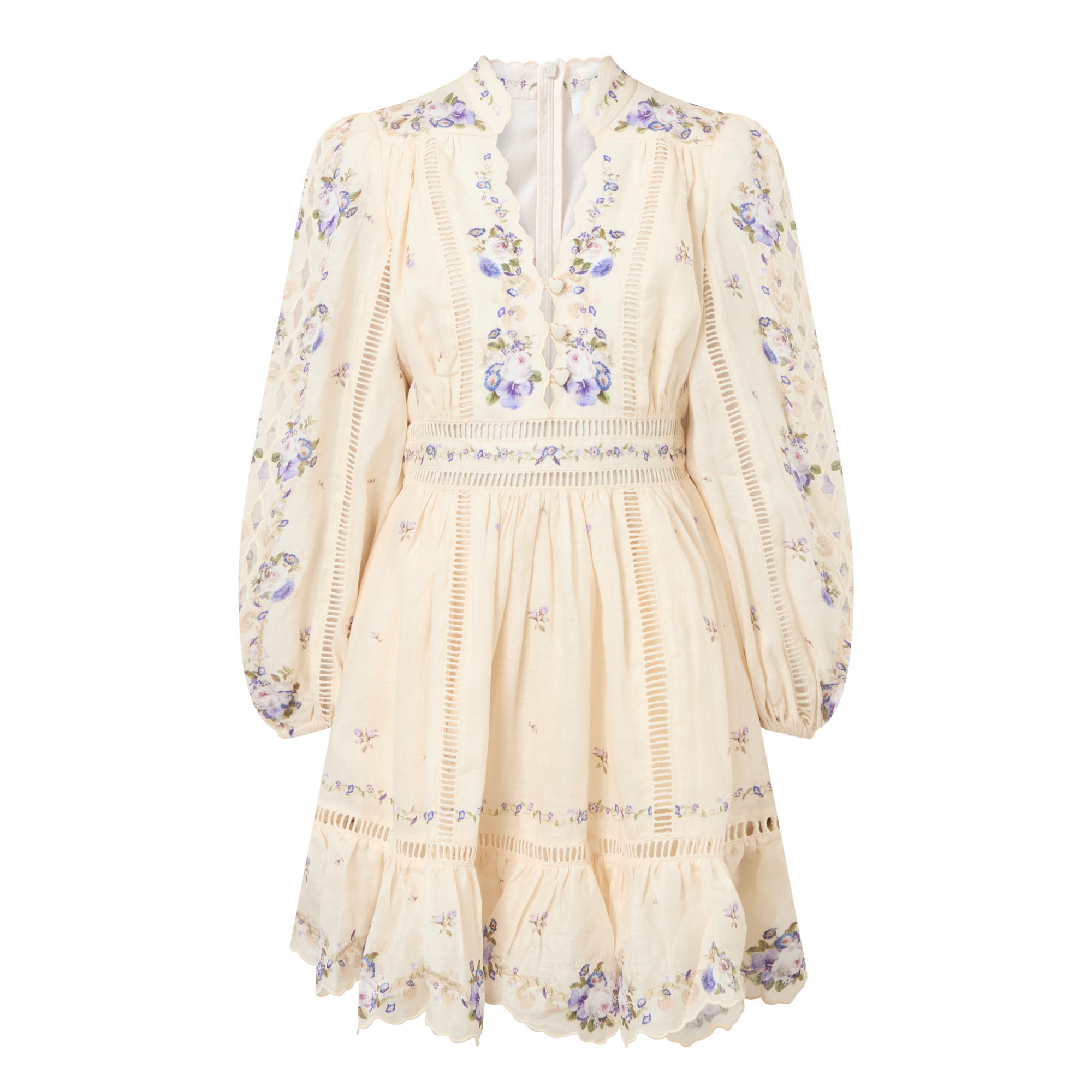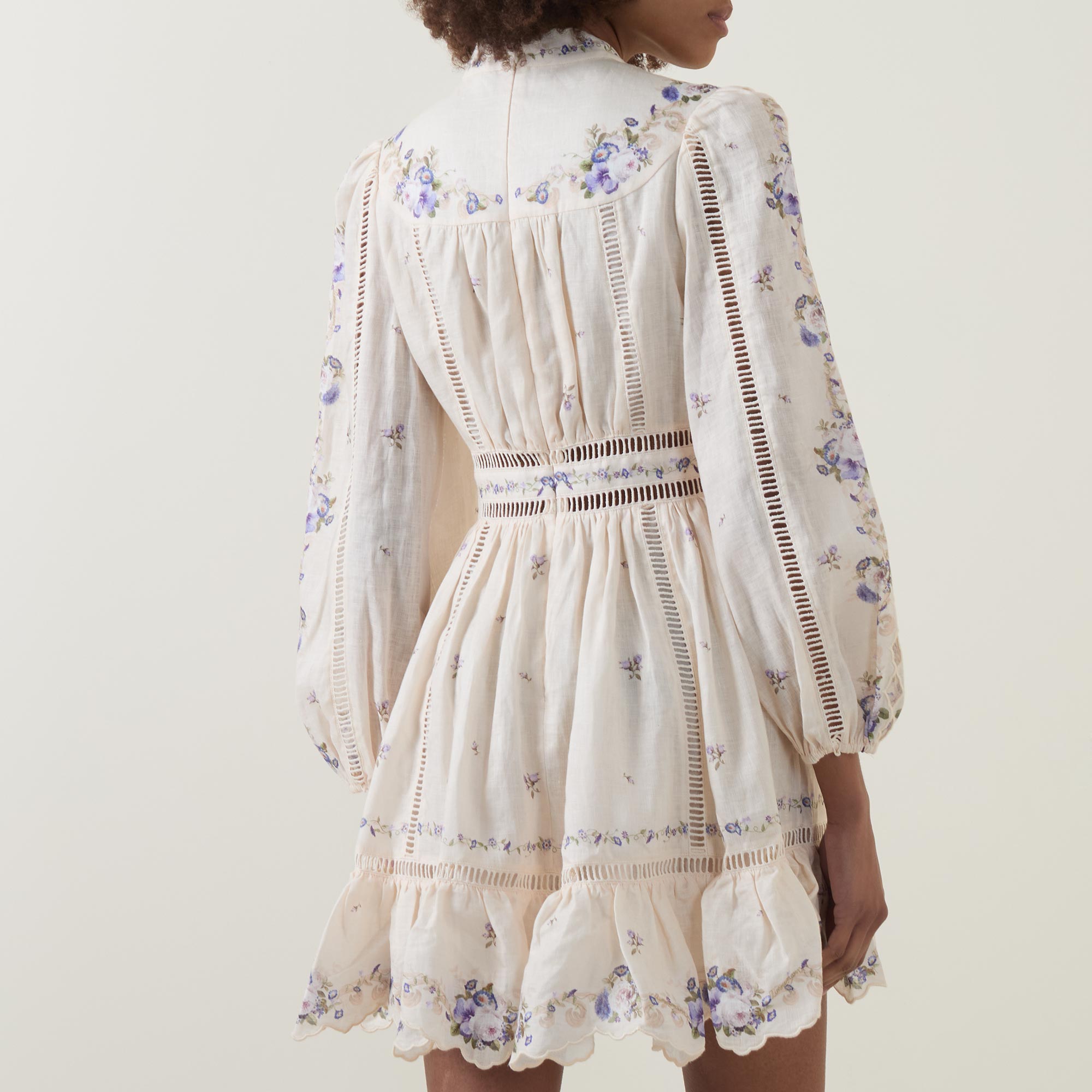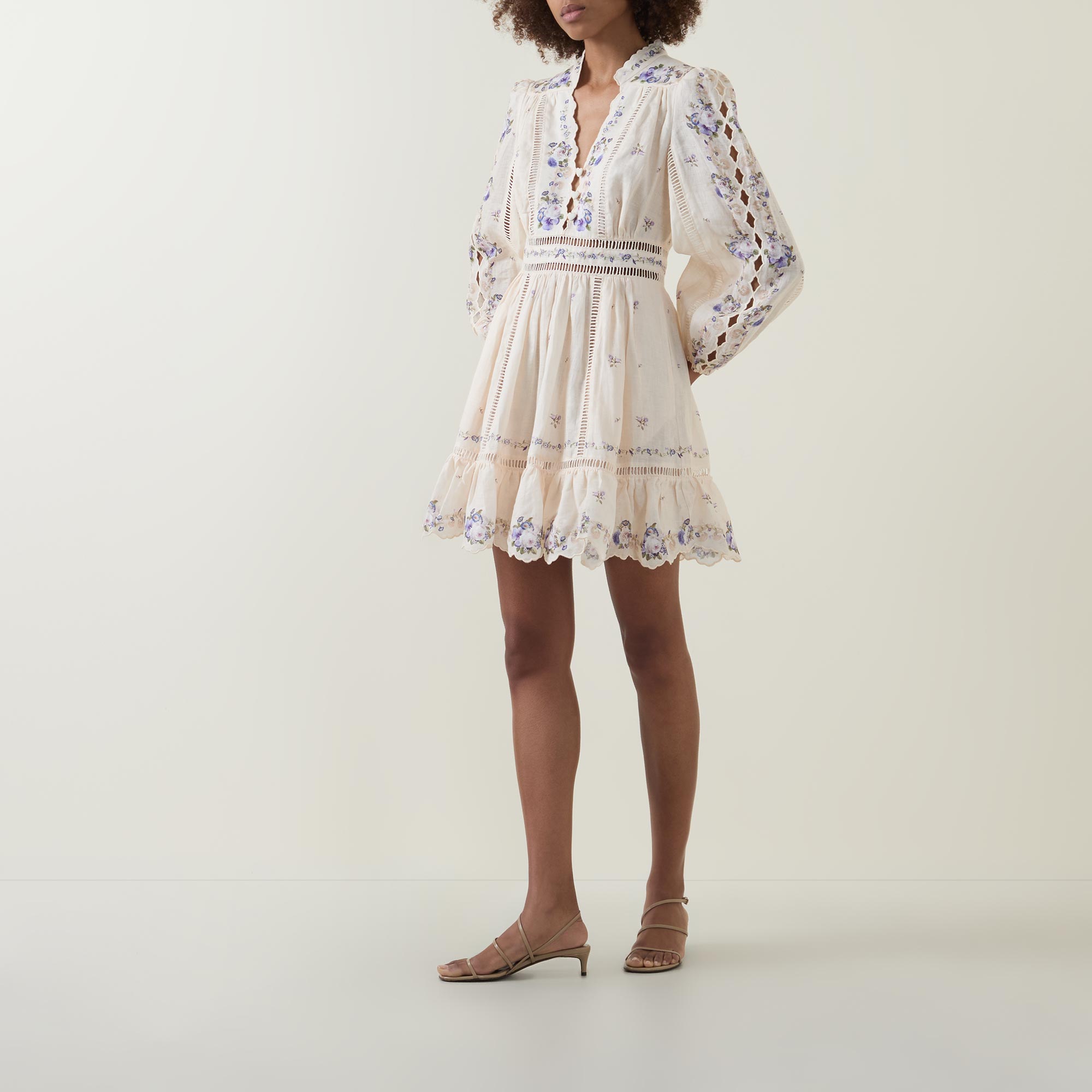 Zimmermann's Twisted Romance Cruise 2026 collection is inspired by maritime fantasy and seaside adventure, seen here in the Rebellion dress. Crafted from breathable linen and lined in cotton, it's framed by a stand collar and long blouson sleeves, while securing with a concealed fastening and rouleau half placket, before falling to a playful mini length and adorned in the brand's Cream Purple Rose design throughout.