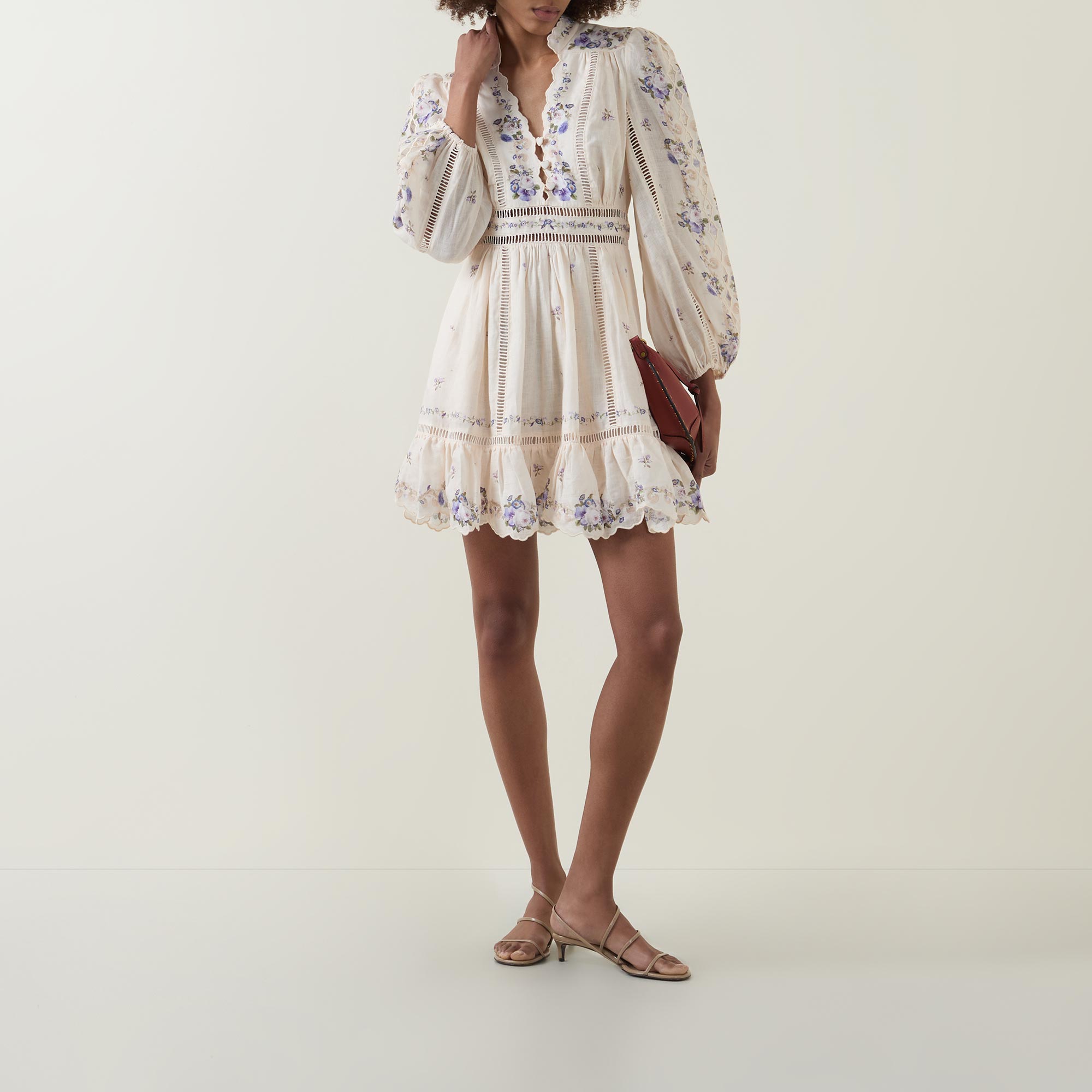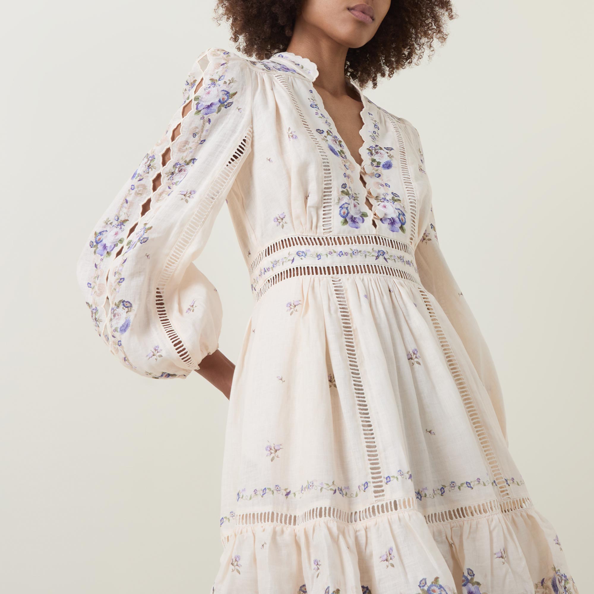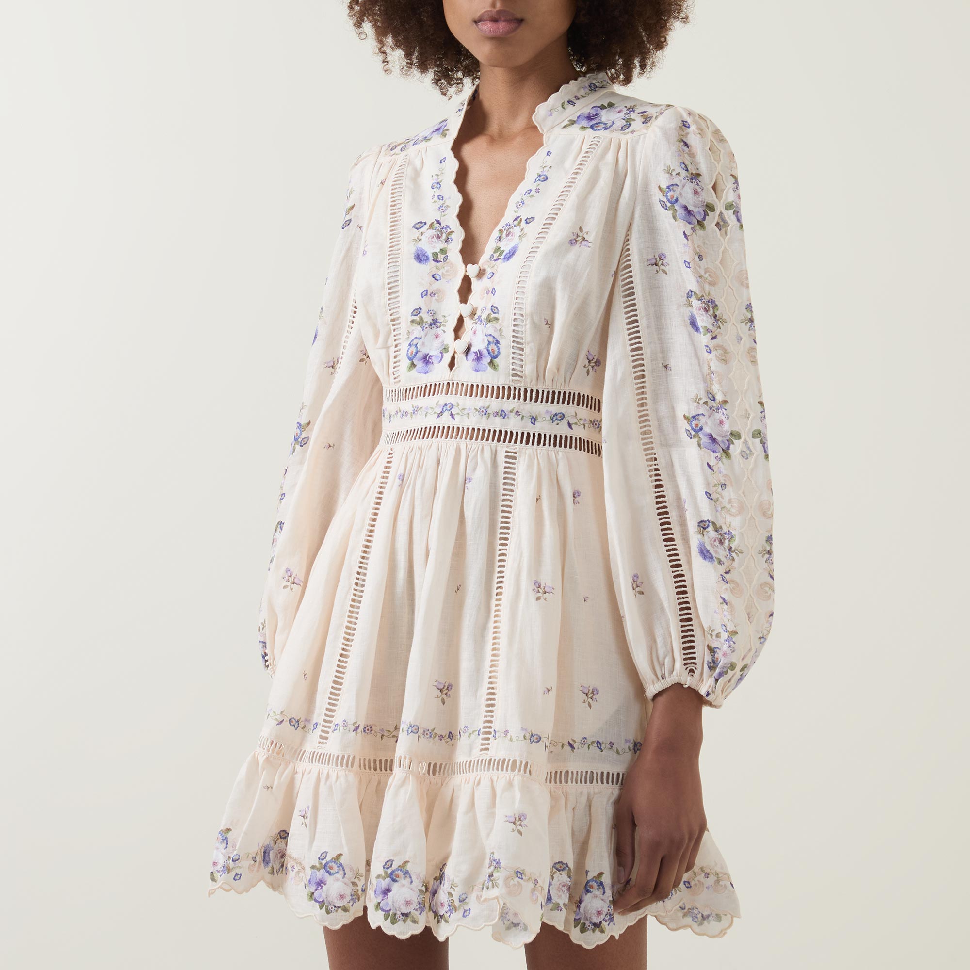 Zimmermann's Twisted Romance Cruise 2026 collection is inspired by maritime fantasy and seaside adventure, seen here in the Rebellion dress. Crafted from breathable linen and lined in cotton, it's framed by a stand collar and long blouson sleeves, while securing with a concealed fastening and rouleau half placket, before falling to a playful mini length and adorned in the brand's Cream Purple Rose design throughout.