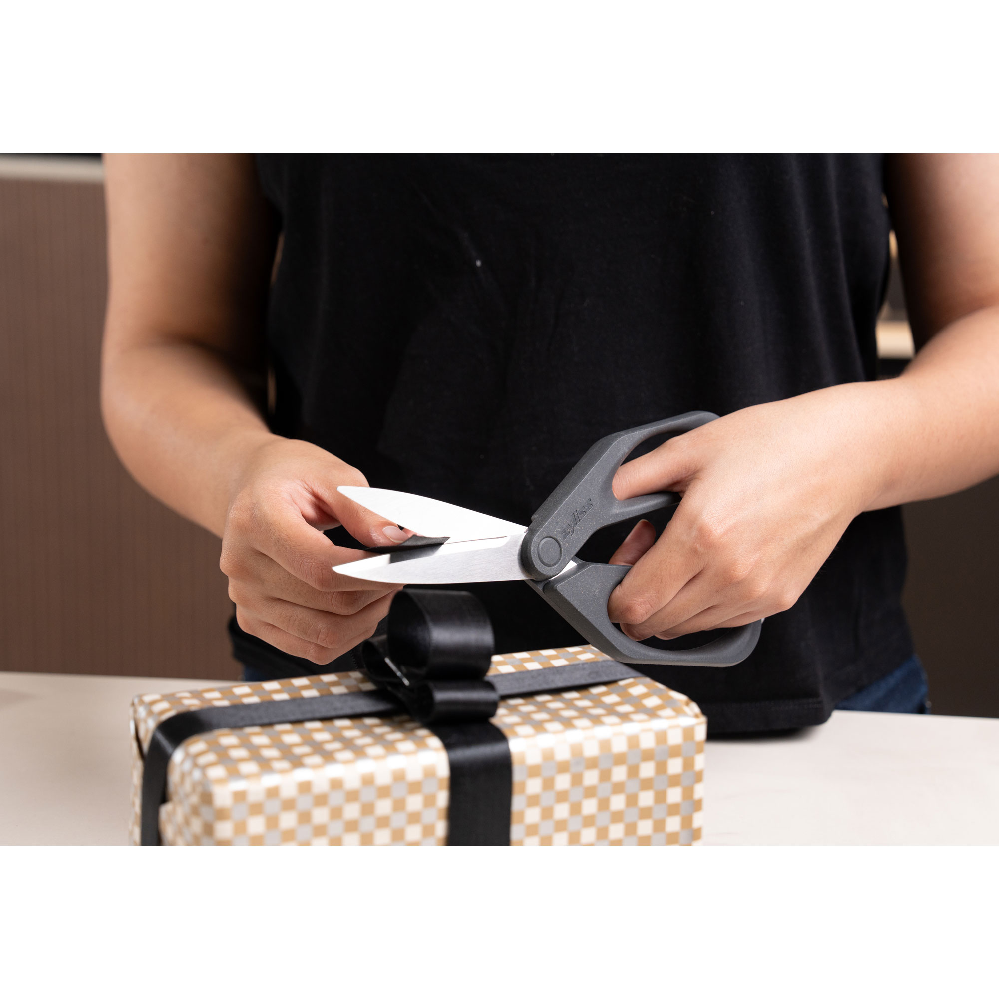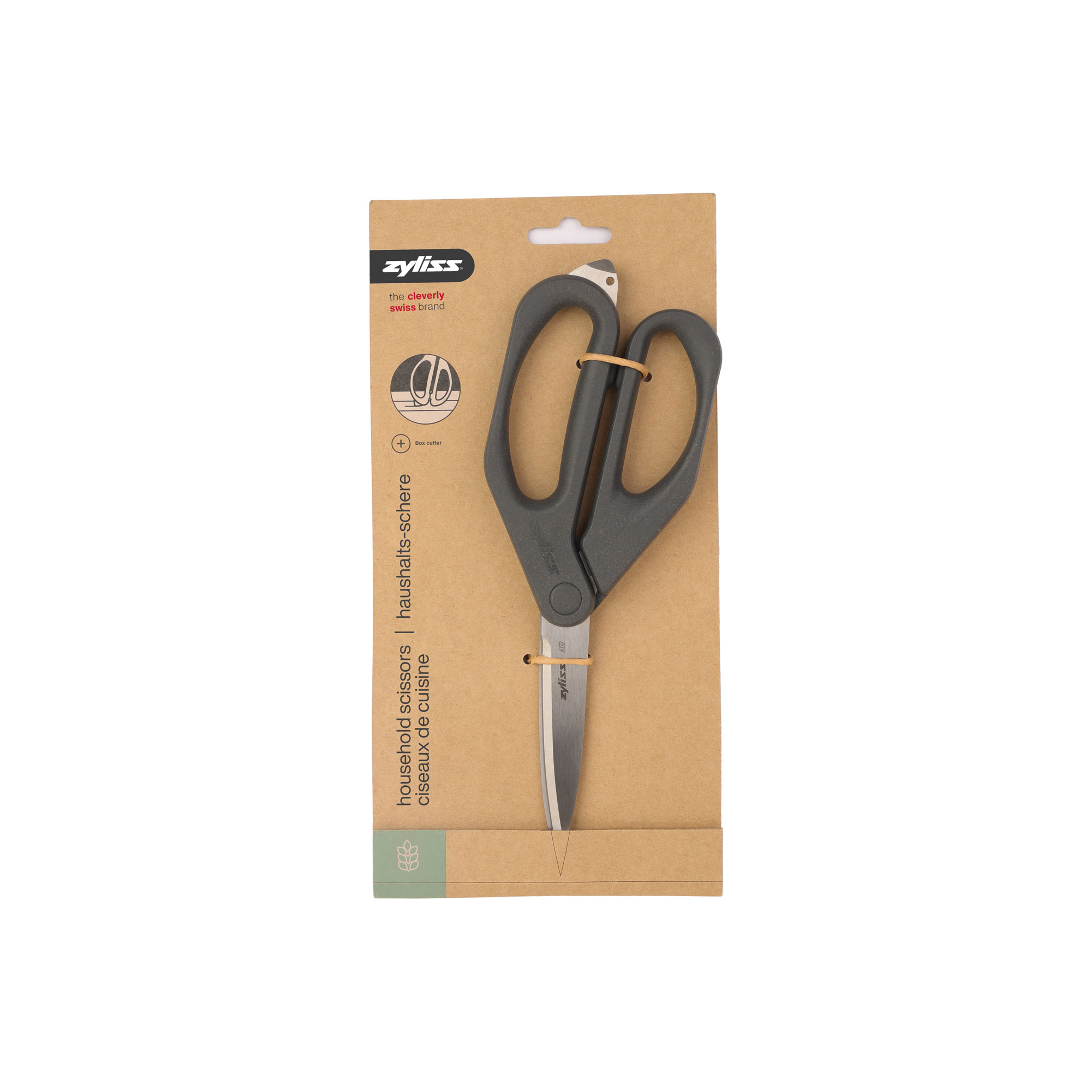 The Zyliss Household Scissors are built for everyday tasks with a thoughtful, sustainable design. Featuring precision stainless steel blades, they deliver smooth, reliable cuts through packaging, paper, string, and more. A sturdy hinge provides long-lasting durability, while the integrated box cutter easily opens sealed cartons and boxes- no need to reach for another tool. Designed with an ergonomic handle made from eco-friendly wheat straw material, these scissors offer a comfortable grip that feels secure and easy on the hands. Whether you're working in the kitchen or tackling chores around the house, these scissors are made to perform. Dishwasher safe and backed by a 5-year guarantee, they're a dependable, sustainable addition to your everyday essentials.