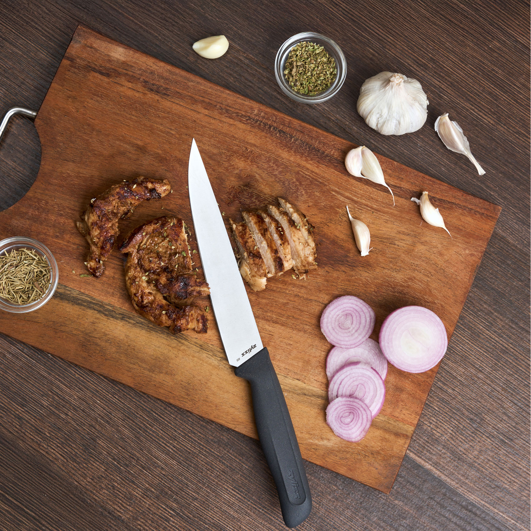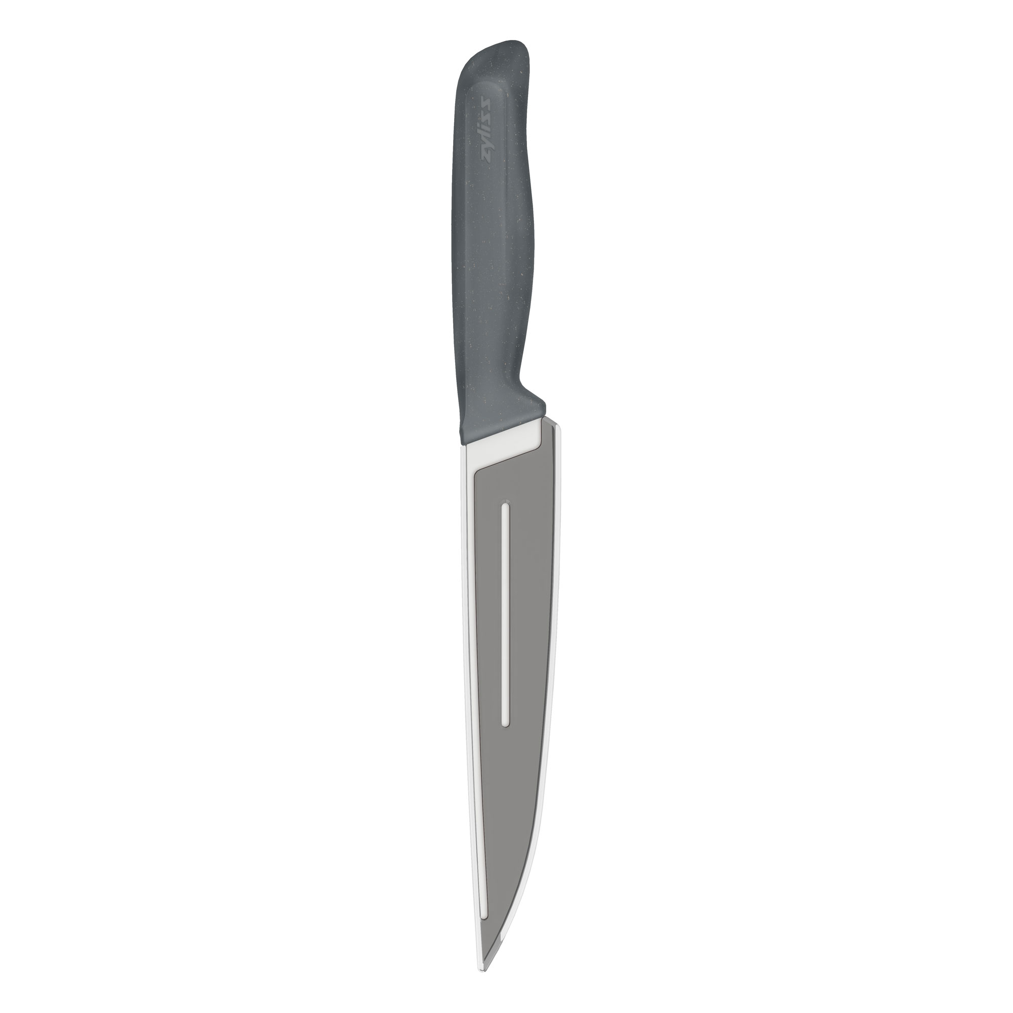 The Zyliss Carving Knife L is designed for smooth, precise slicing of roast meats, poultry, and large cuts. Its long, narrow stainless steel blade features a tapered edge, allowing for clean, thin slices without tearing or shredding fibres. The ergonomic handle, made from a sustainable wheat straw material, helps reduce plastic use by up to 20% while offering a lightweight, comfortable grip for controlled carving. Includes a protective blade guard. Dishwasher safe.