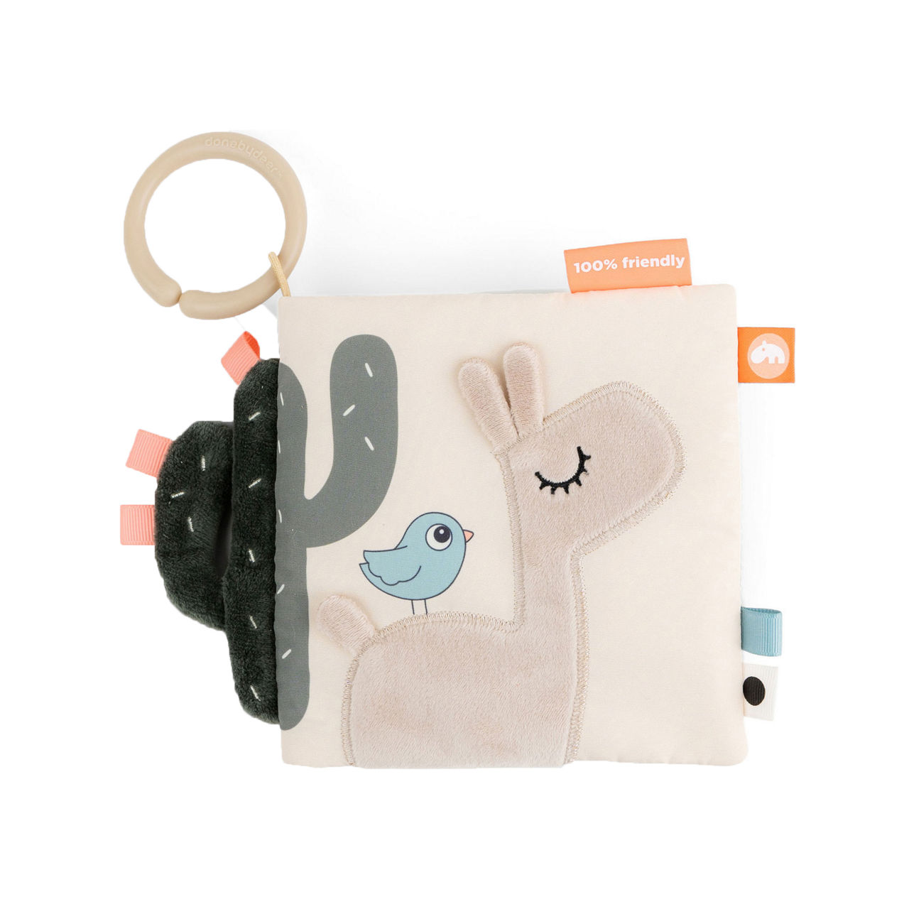 - Round hanging loop, fabric style, filled with stimulating features including Done by Deer characters Lalee and Antee, a baby mirror, a green cactus and a teether, finished with logo details