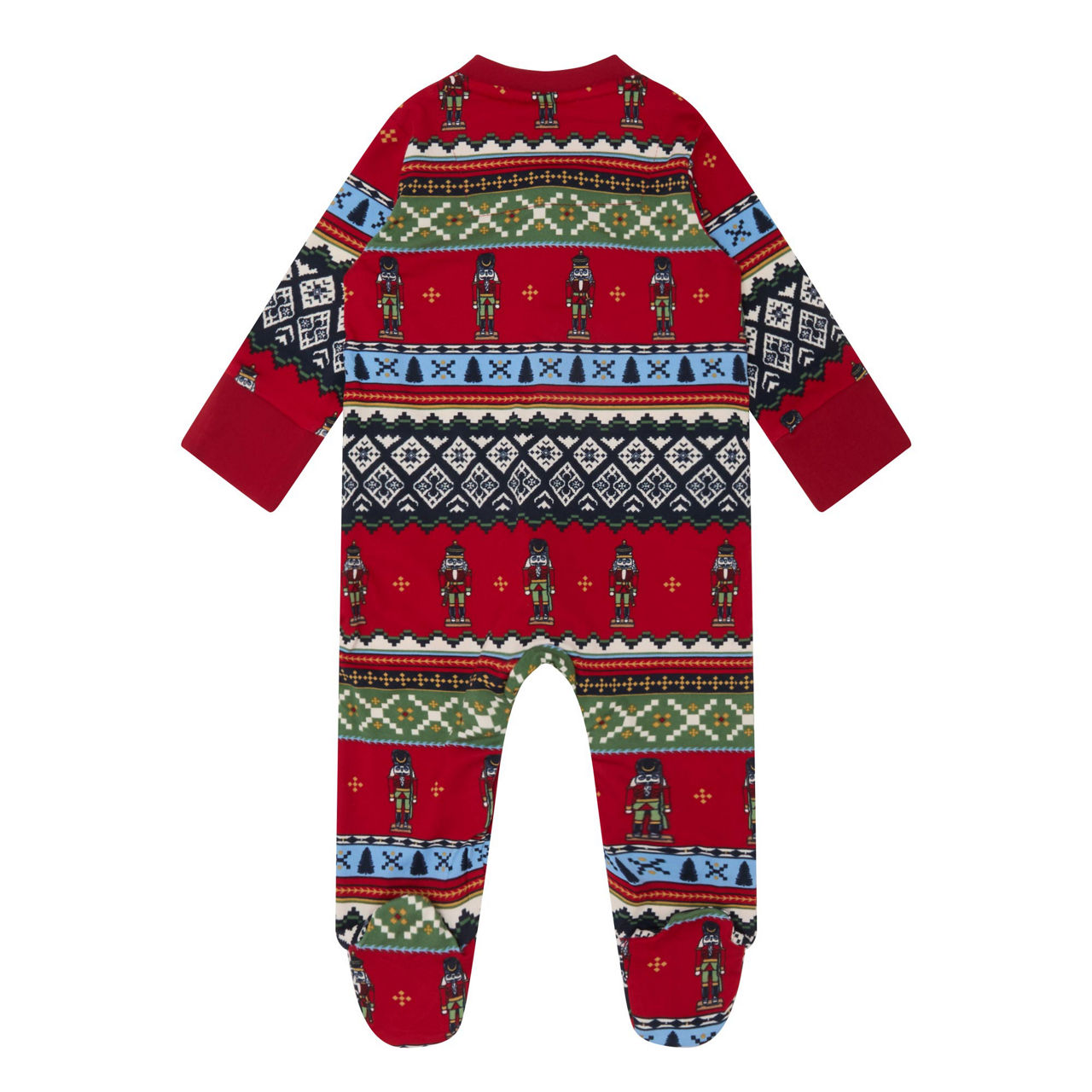 - Round neckline, long sleeves, front snap button fastenings, enclosed feet, striped Christmas design
