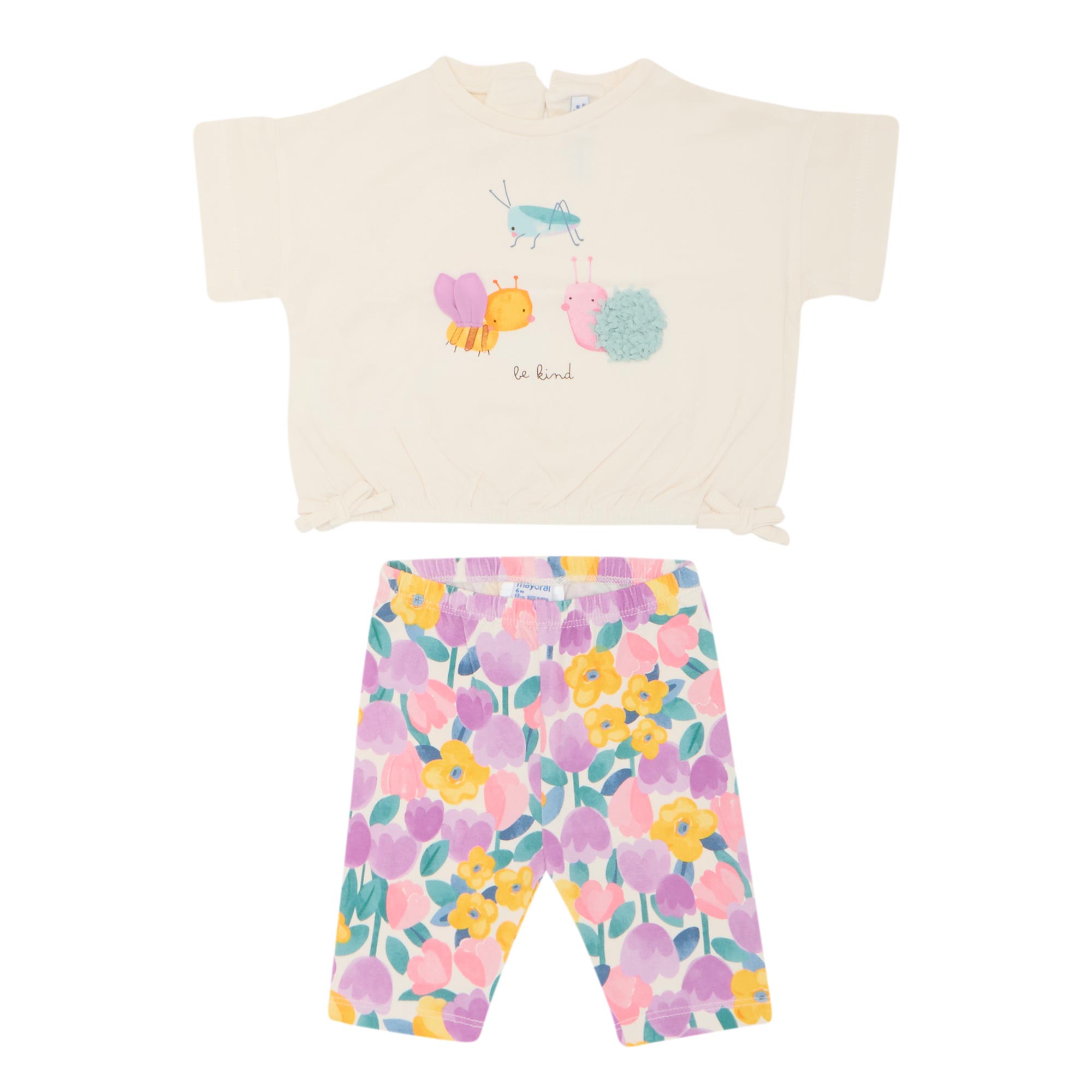 - Two-piece set: Top: Crew neck, rear keyhole and button fastening, short sleeves, elasticated hem, bow appliqué detailing, textured bug graphic print on the front; Leggings: Slim-leg, elasticated waistband, clean hems, tonal stitching, floral print