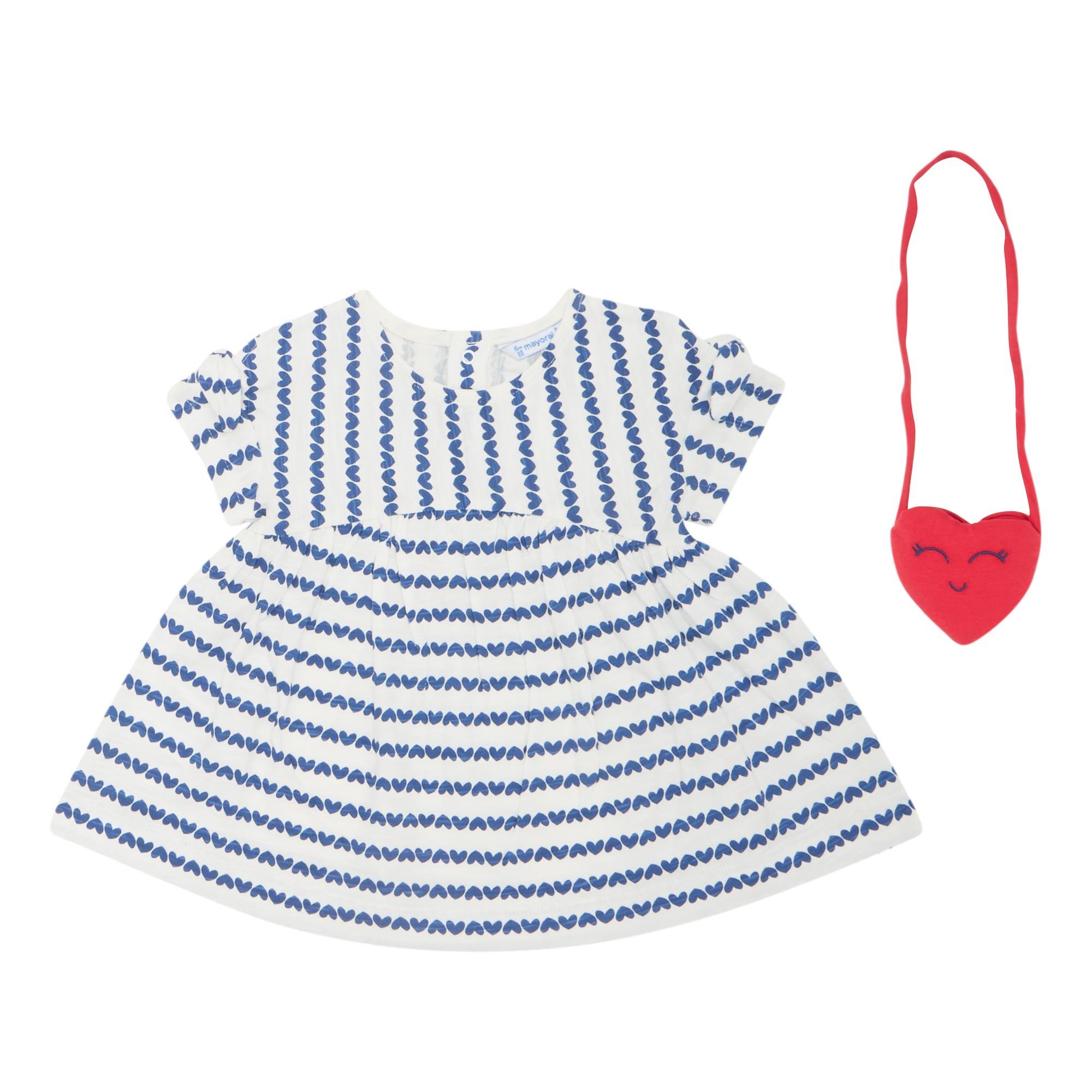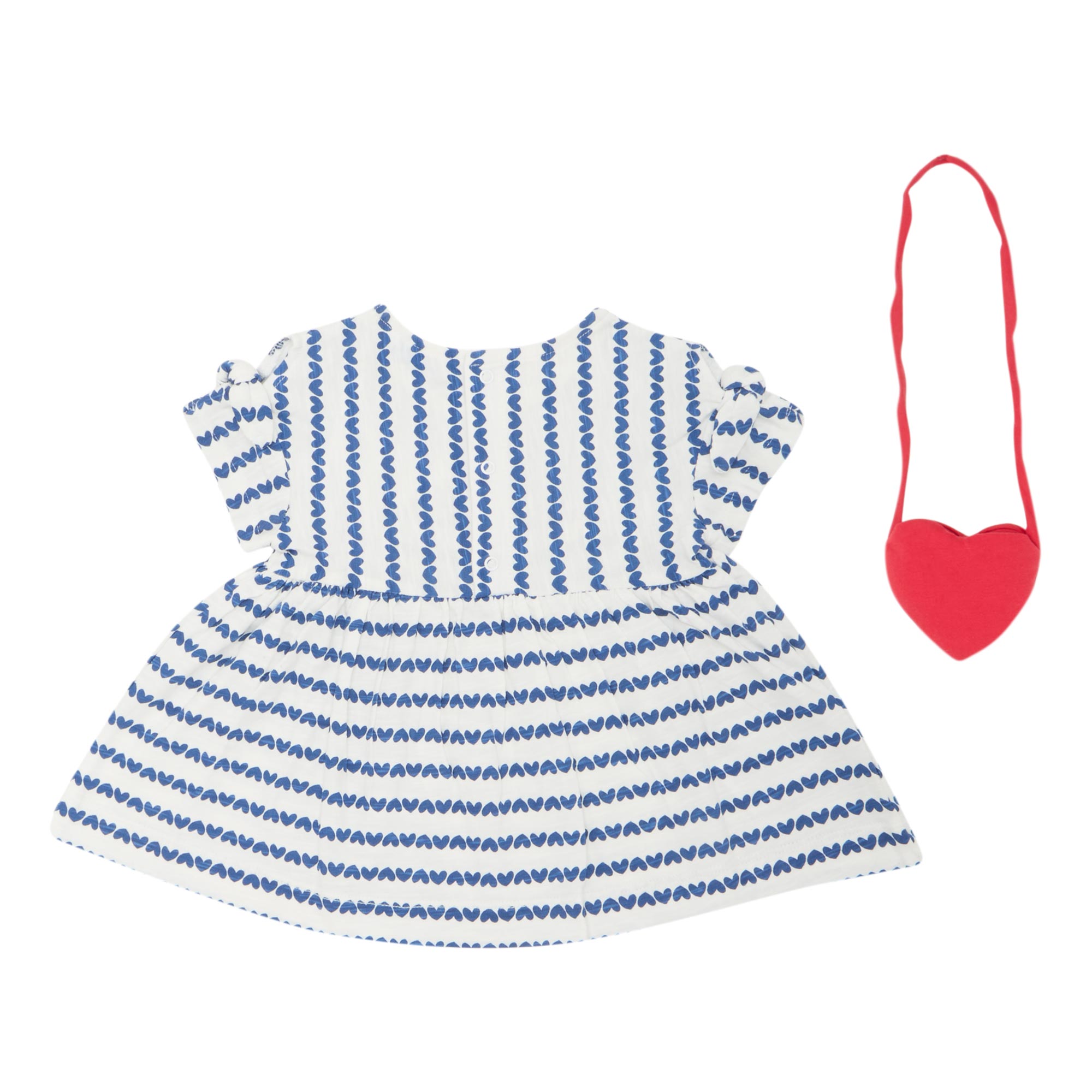 - Two-piece set: Dress: Crew neckline, rear snap button fastening, short sleeves, bow appliqué detailing, fitted through the waist, flared skirt, heart print pattern throughout; Purse: Heart-shaped design, long strap that can be worn across the body