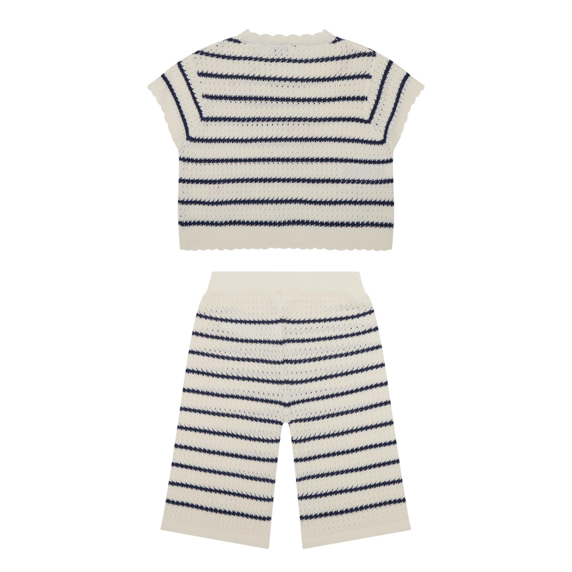 • Top: Round neckline, short sleeves, scalloped trims, stripe pattern, knit structure, heart details