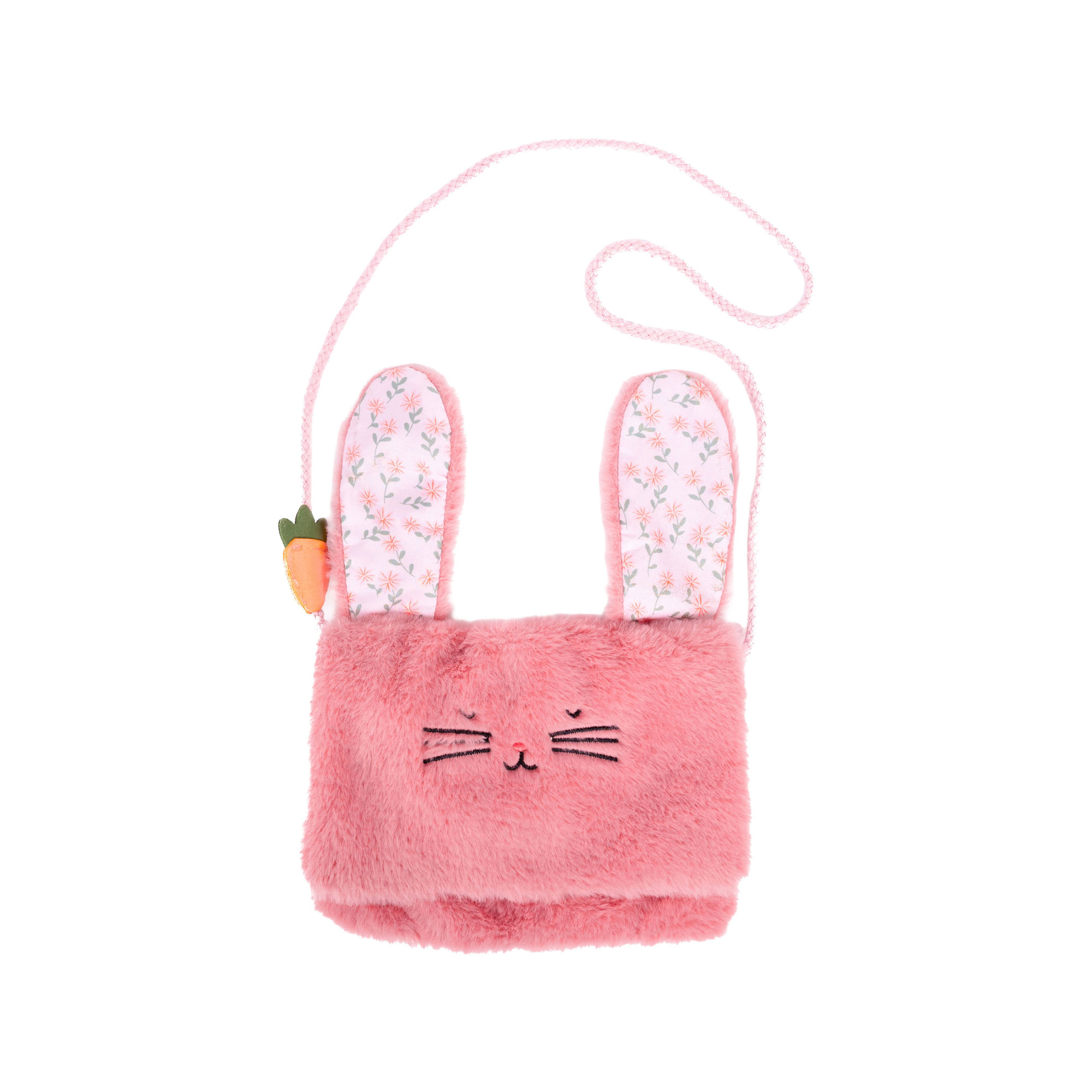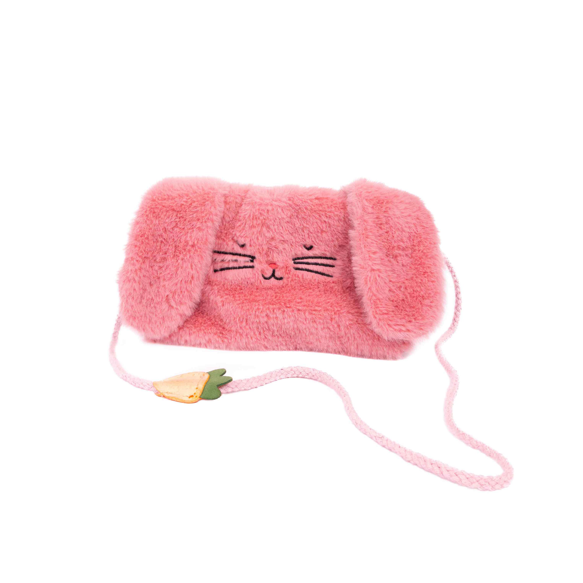 • Bunny-shaped design, fluffy texture, adjustable ears, patterned detailing, braided strap, carrot charm