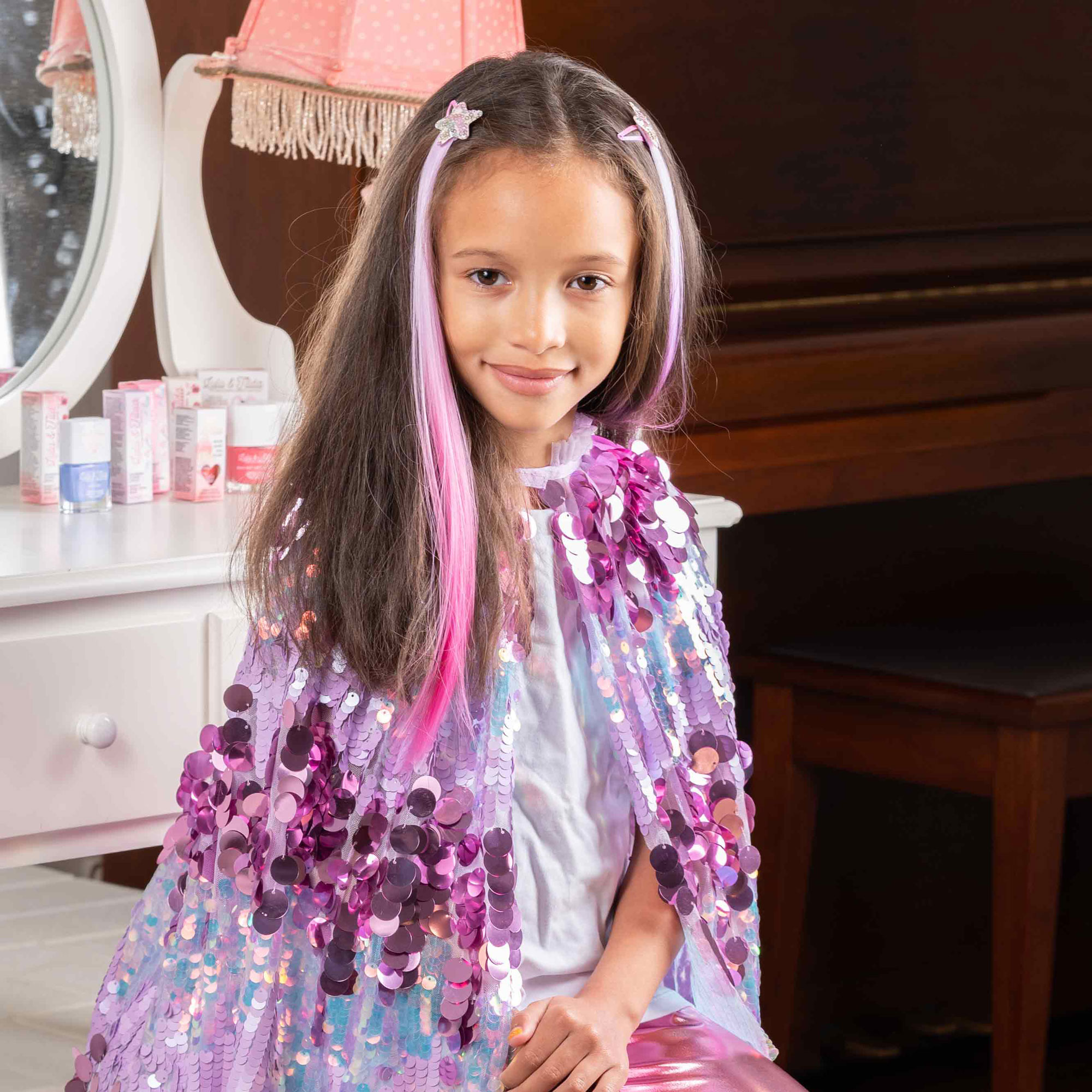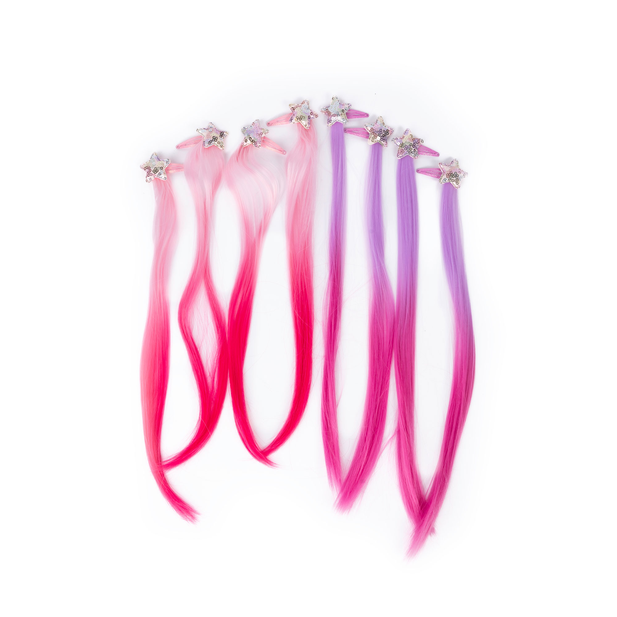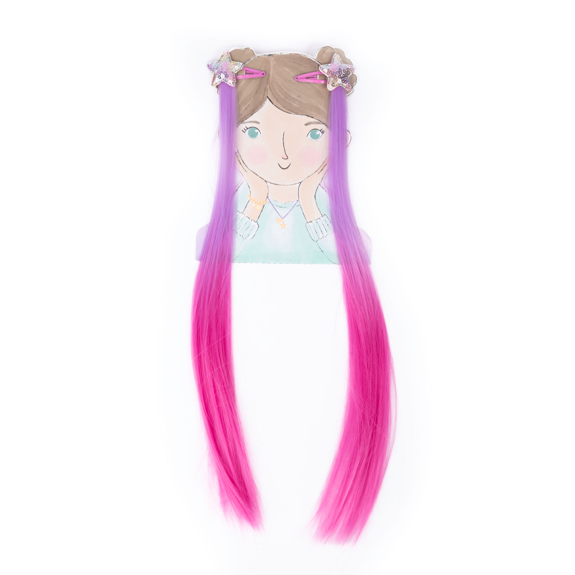 • Eight-piece set, sequin star hair clip detail, four ombre pink extensions, four ombre purple extensions, box packaging