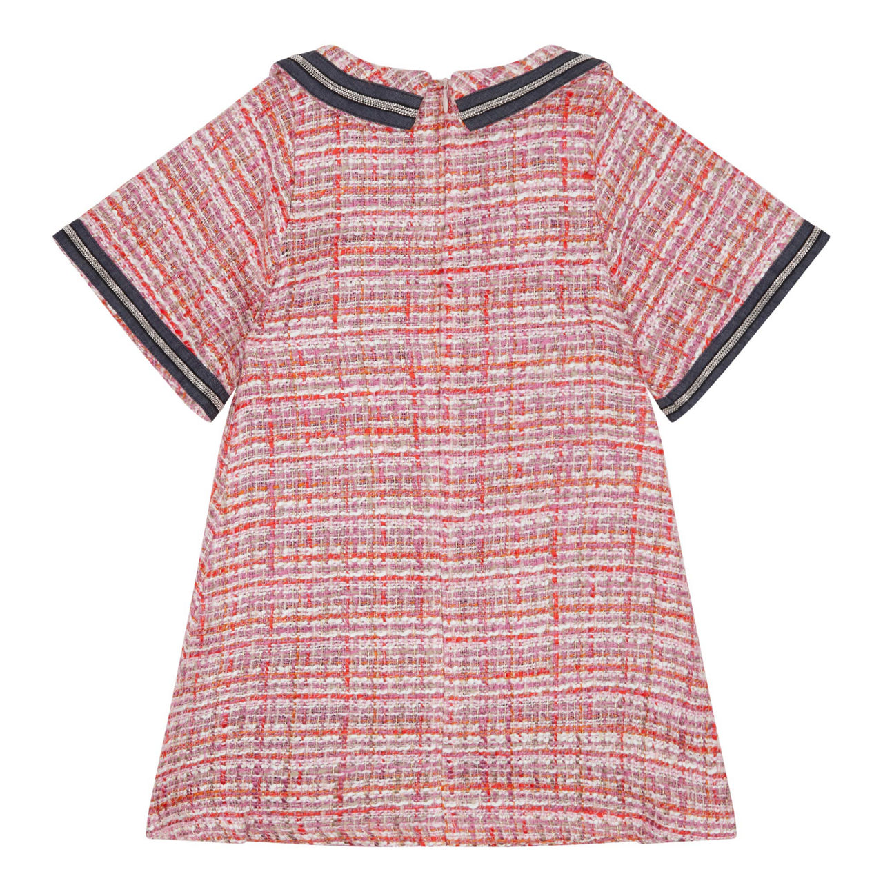 - Short sleeves, pointed collar, back zip-fastening closure, bow detail on front, two patch pockets, contrasting trims, tweed design, textured finish
