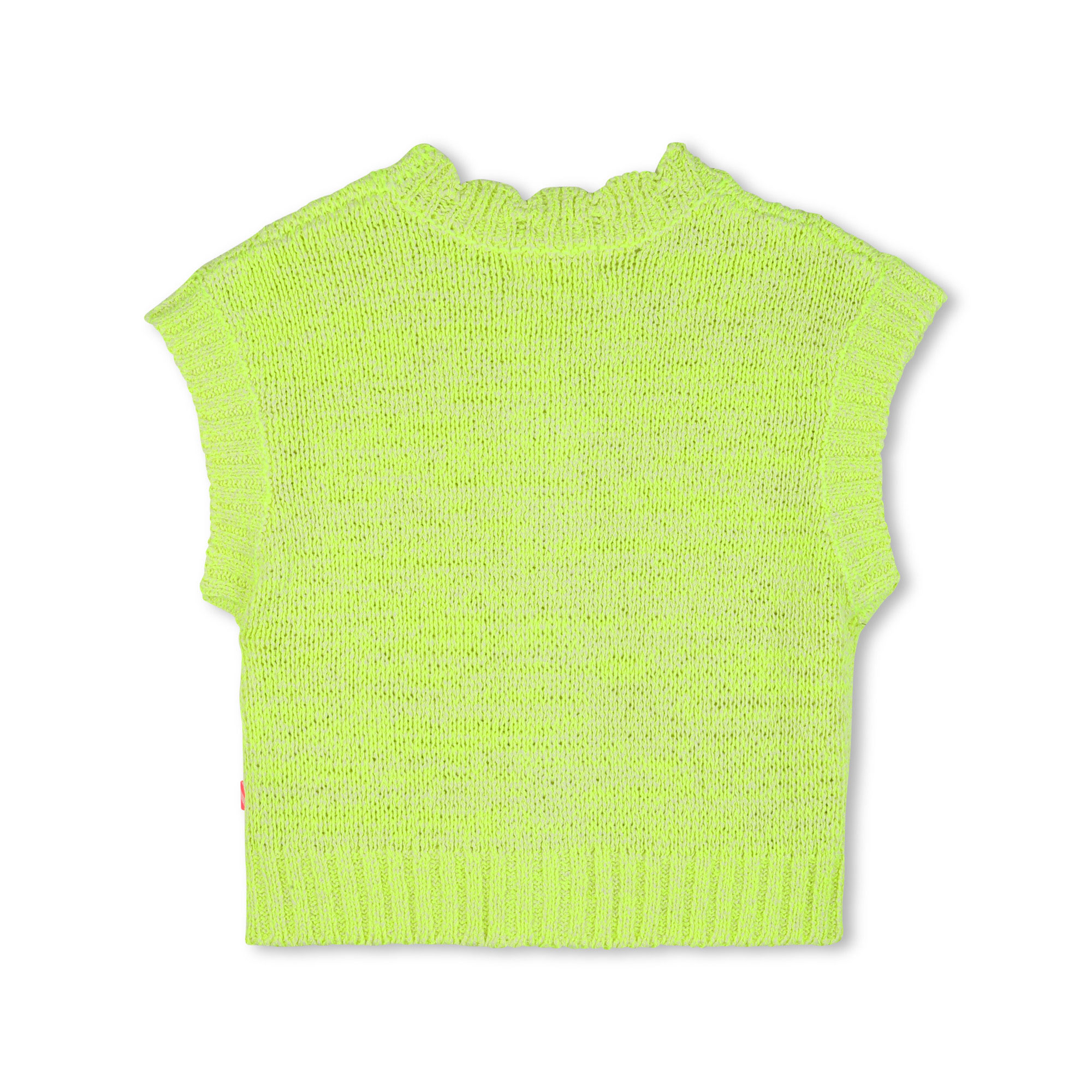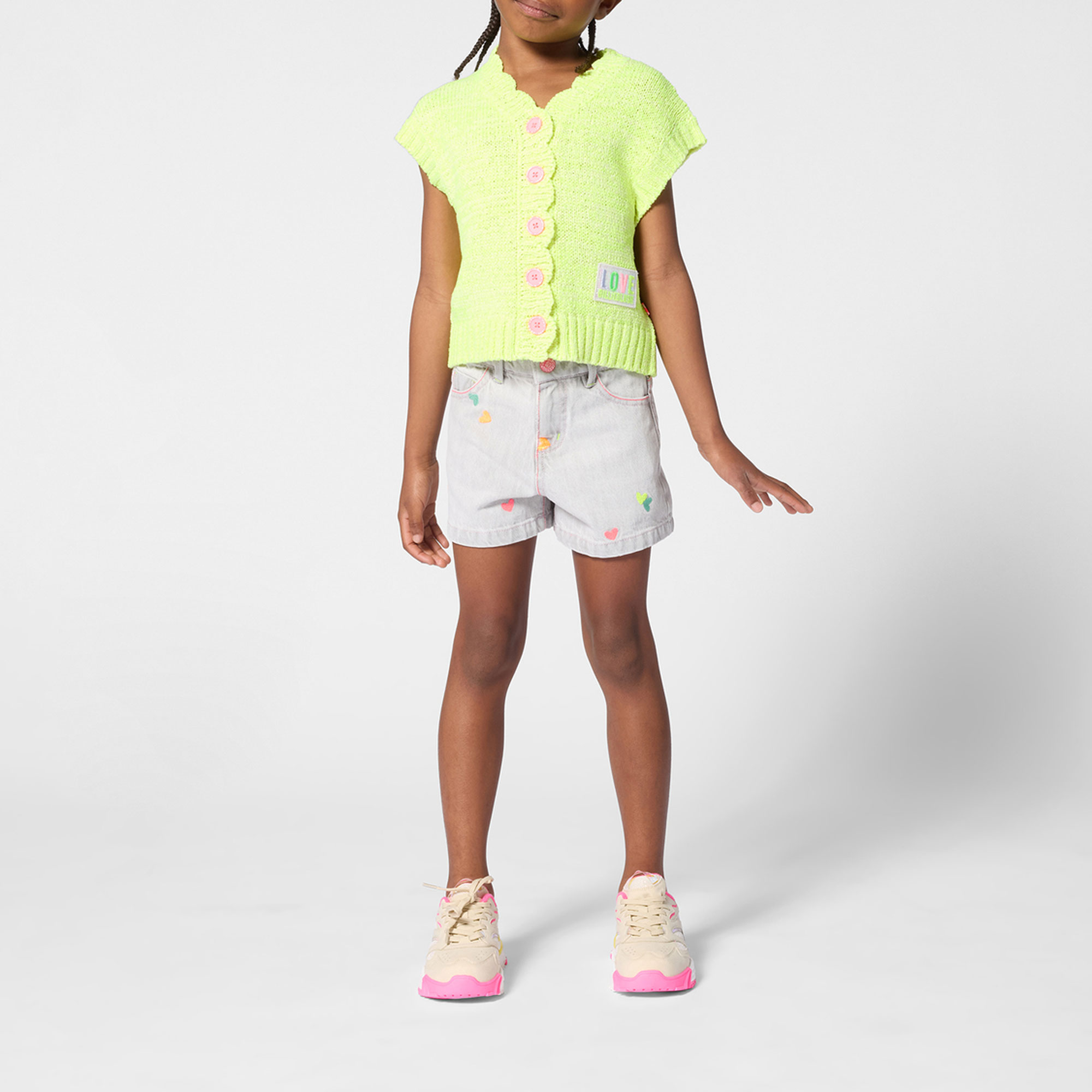 - Sleeveless, cardigan silhouette, glitter detailing, logo badge, front button fastenings, scalloped edges