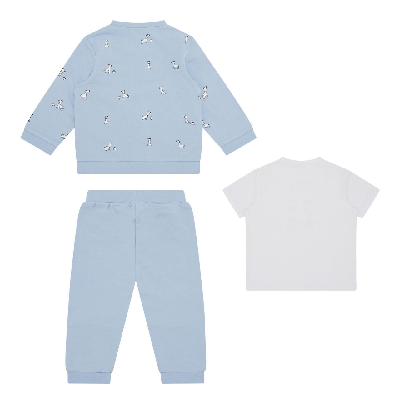 - Three-piece, round neck t-shirt, zip-through hoodie, cuffed sweatpants