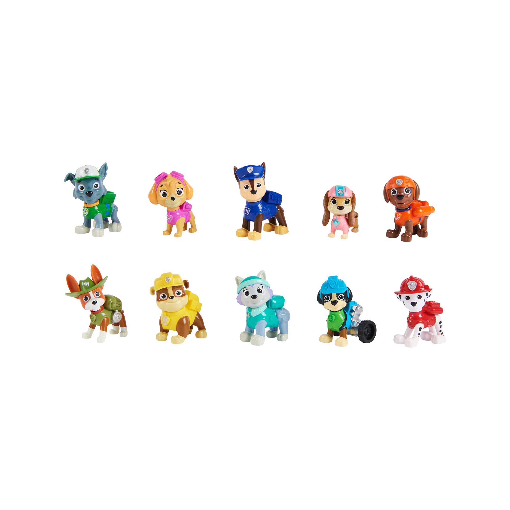Create your own super-charged PAW Patrol adventures with the “All Paws on Deck” Toy Figures Gift Pack. This PAW Patrol figures set includes Chase, Marshall, Rocky, Rubble, Zuma, Skye, Everest, Tracker, Rex and Liberty. The “All Paws on Deck” Gift Pack is the largest PAW Patrol figures gift pack yet, making it the perfect way to collect all your favourite pups at the same time. Each pup is wearing their signature uniforms and feature true-to-show details on each figure. These heroic pups are ready to save the day, so relive your favourite scenes from the show or create entirely new adventures with all the PAW Patrol pups.
