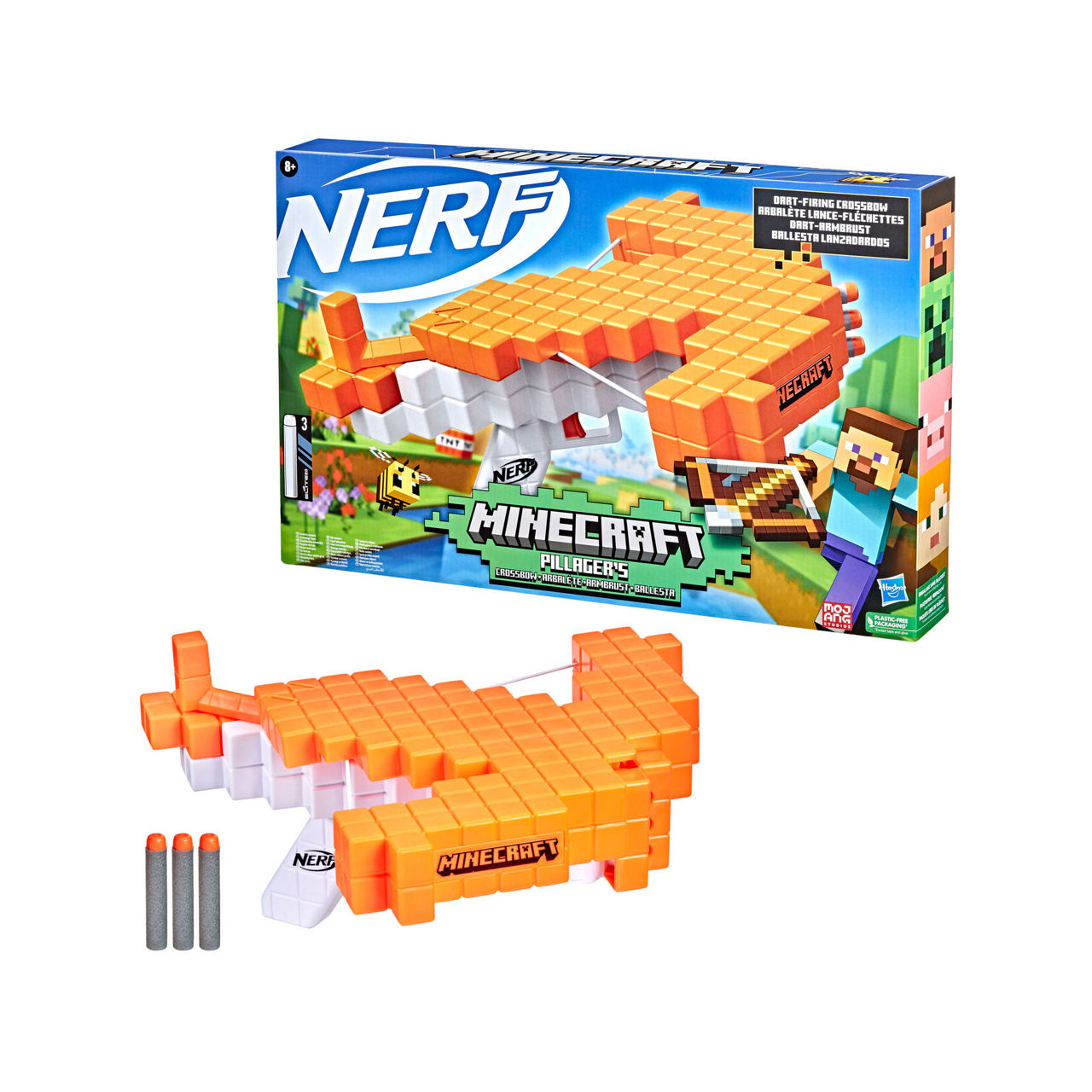 - Includes one dart blasting crossbow, bow arms, 3 foam darts, instructions. Inspired by Minecraft. Assembly required