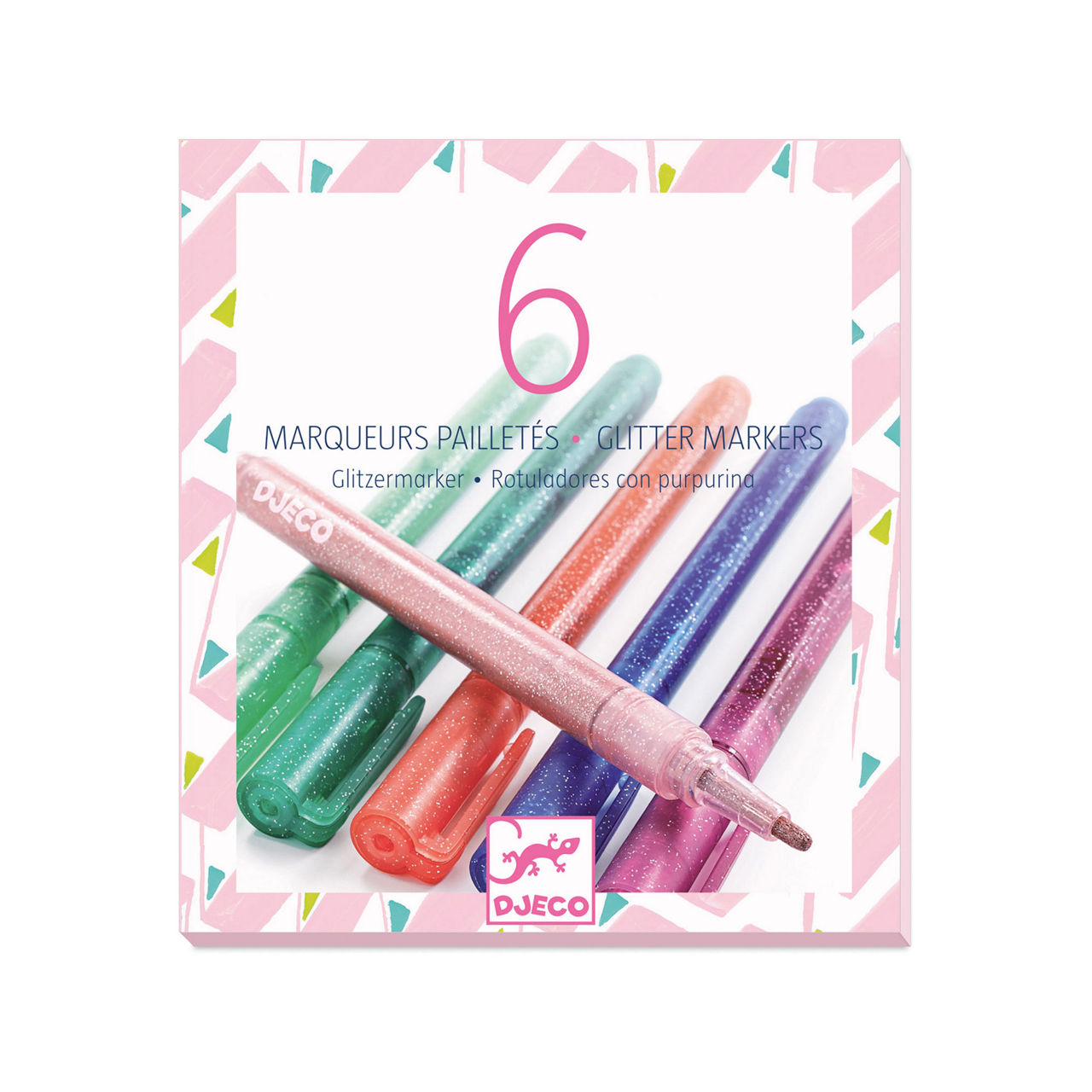 - 6 glitter markers in pale pink, coral, fuchsia, dark turquoise, pale turquoise and indigo