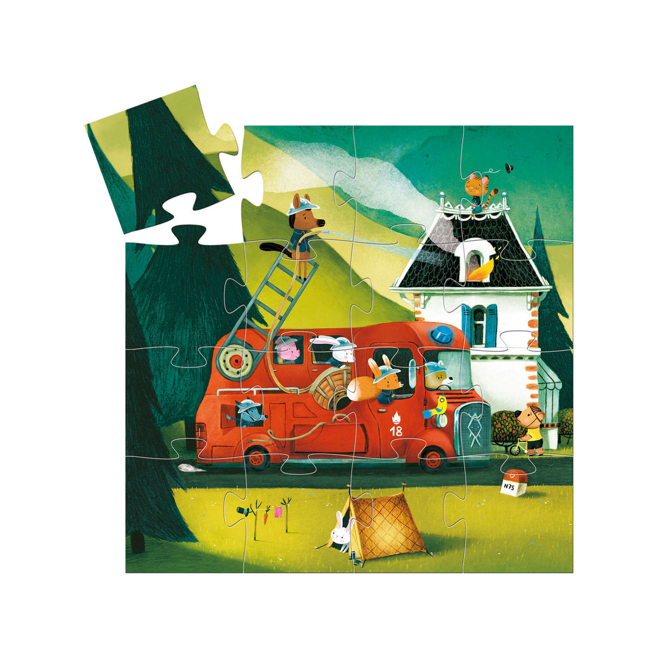Quick! We need the fire engine to save the house from the fire and help the cat off the roof. A beautiful 16-piece puzzle in a stylish fire engine-shaped box.