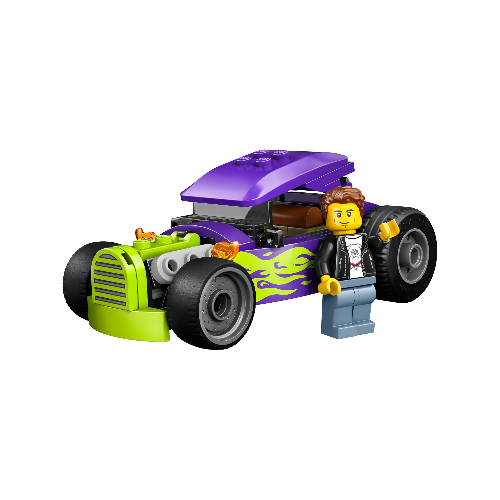 - Set includes: 81 pieces, Classic hot rod race car toy, driver minifigure, oversized rear tyres, purple with neon green flames