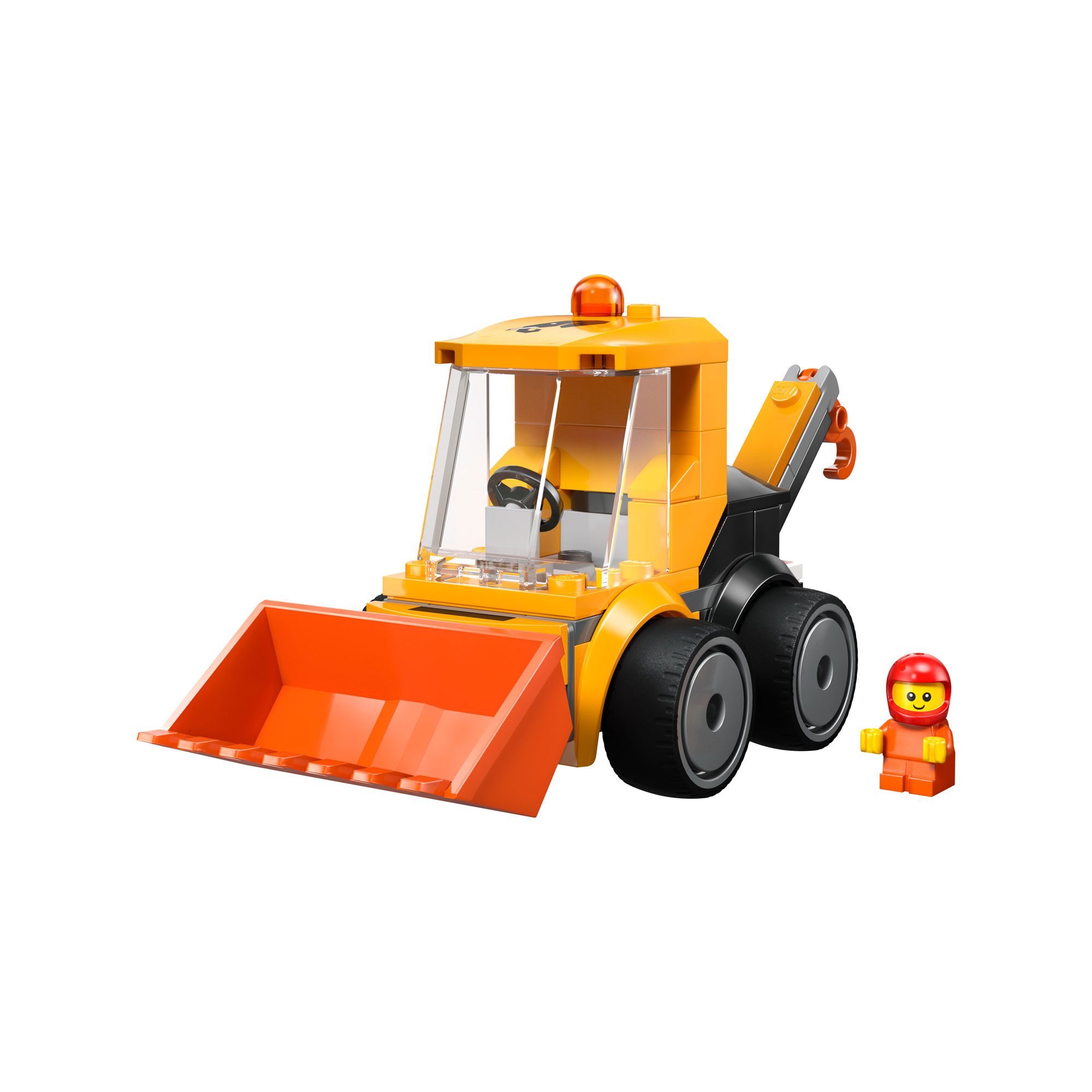 - Set includes: 61 pieces, toy construction truck with rubber tyres, driver's cab, front loader bucket and backhoe, construction worker junior minifigure