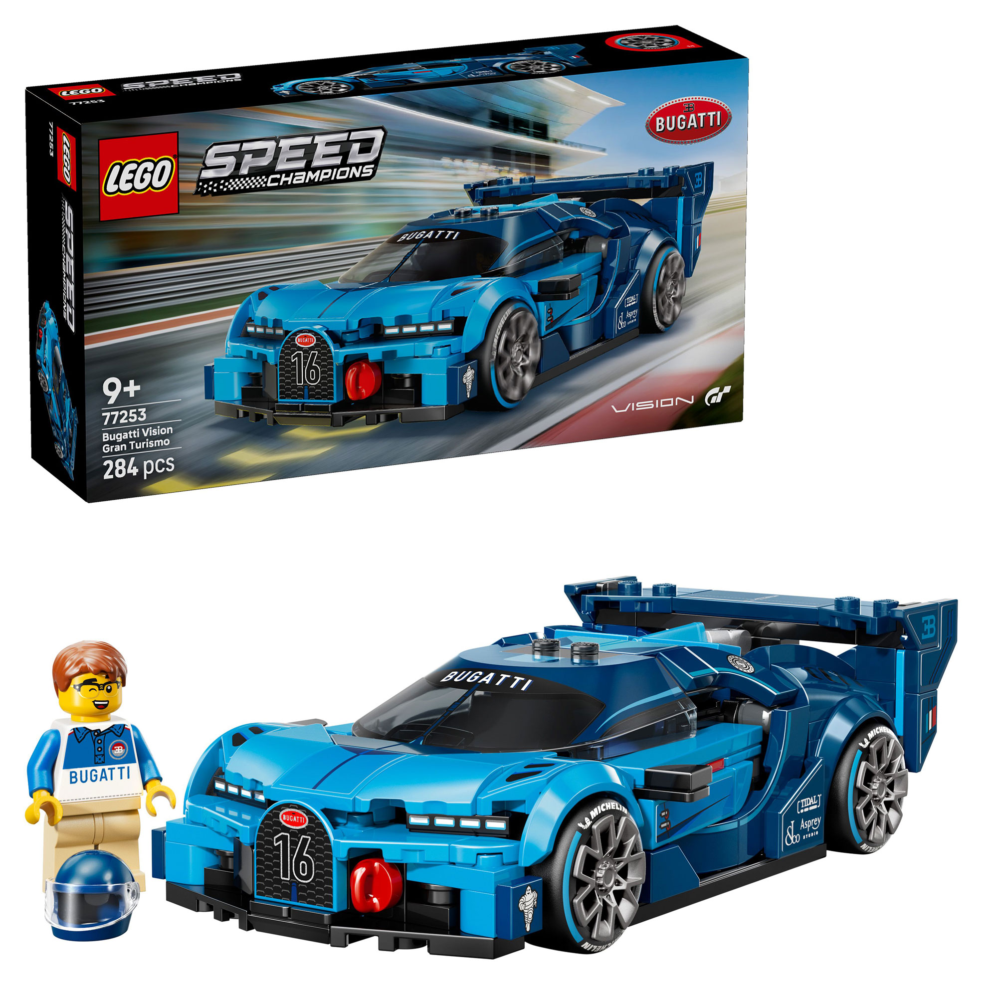 - 284 pieces, Speed Champions theme, Bugatti Vision Gran Turismo Hyper Sports Car, horseshoe front grille, rear wing, distinctive eight-eye headlights, roof fin, wide 'Michelin’ tyres, one minifigure