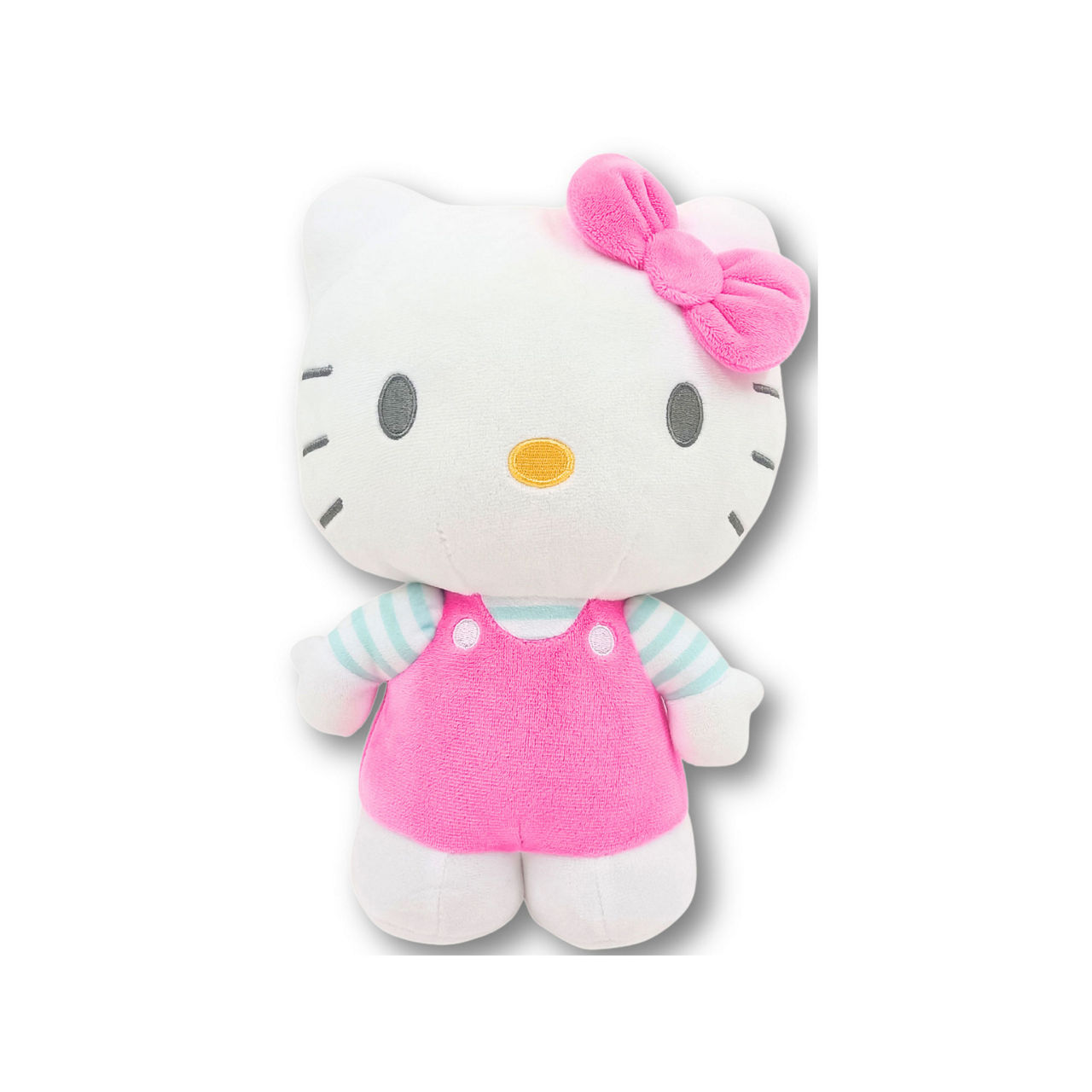 - Standing figure, plush style, Hello Kitty design, pink dress, blue striped shirt, bow, soft, huggable material