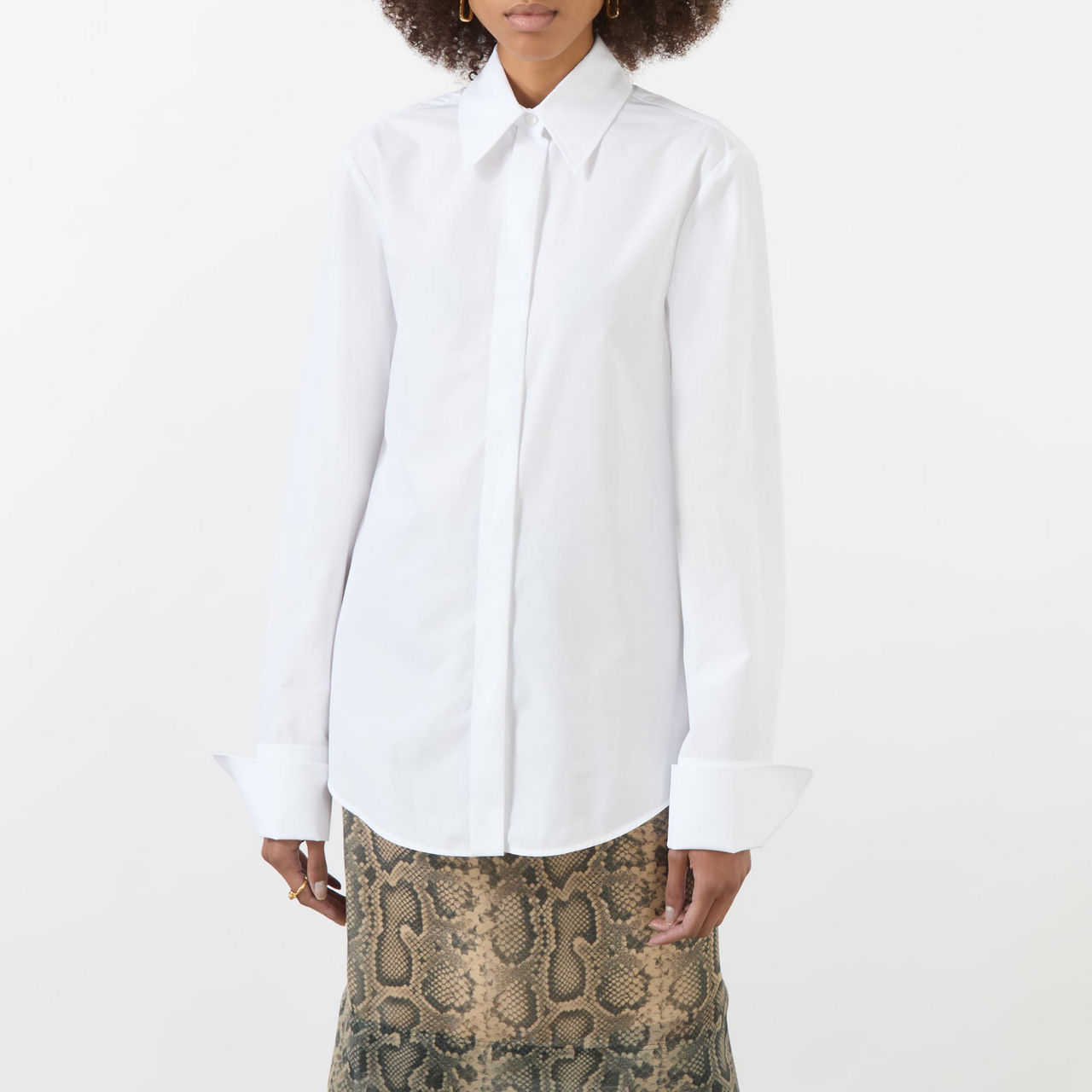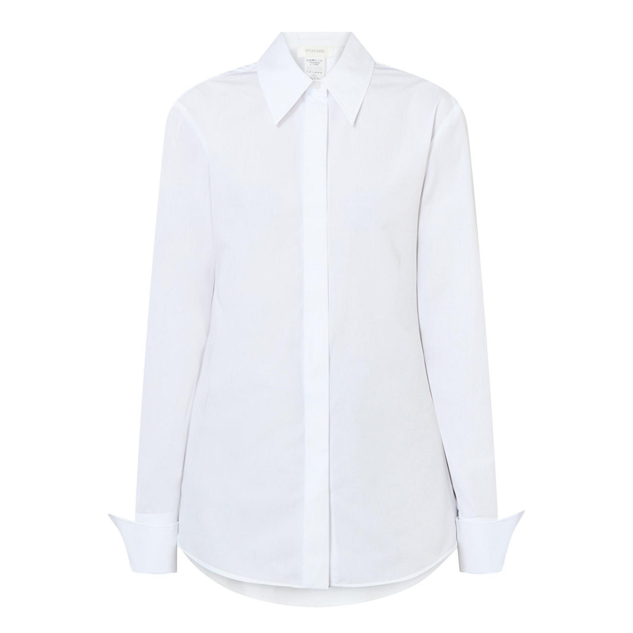 - Oversized point collar, long sleeves, turn-up buttoned cuffs, concealed front button placket, curved hem