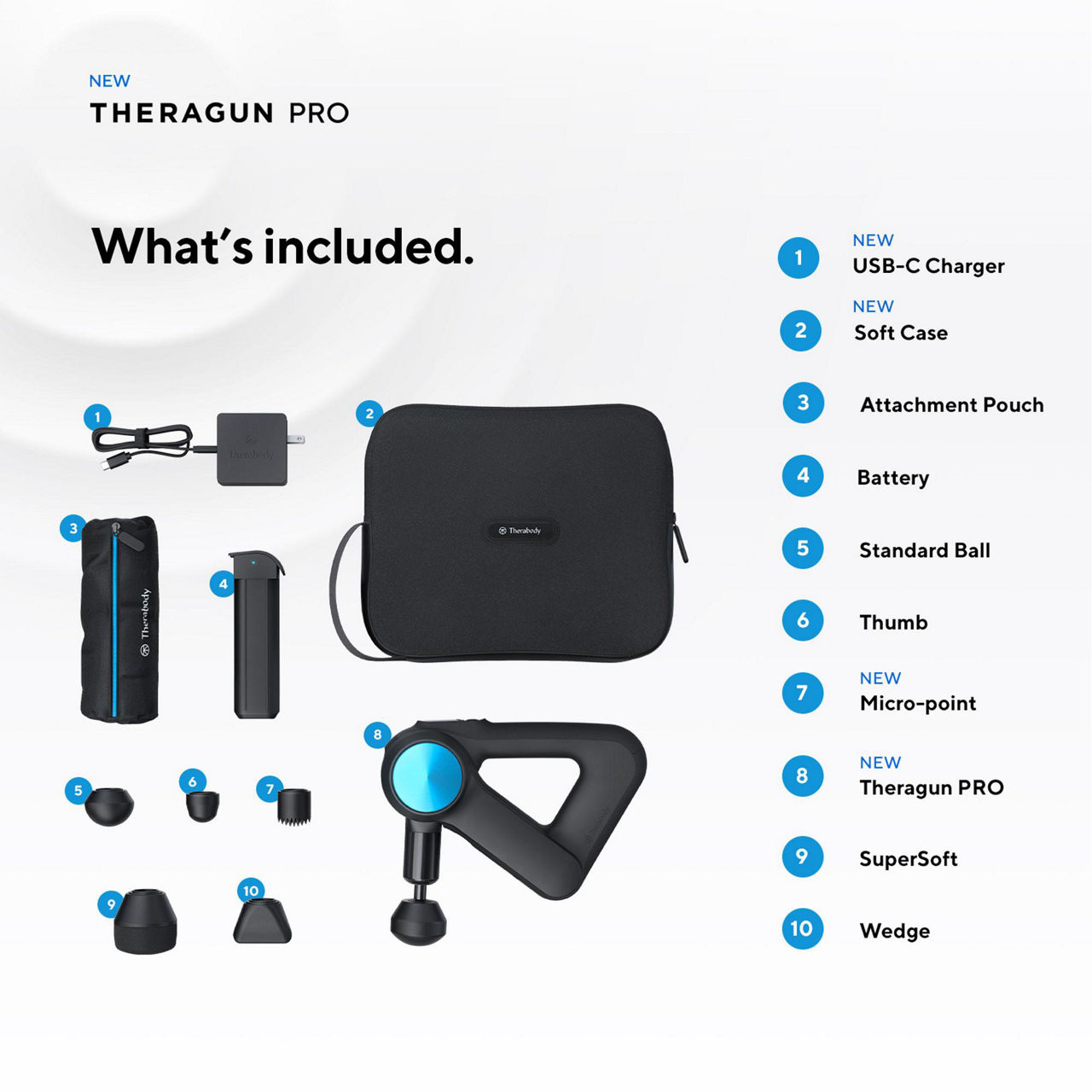 - What’s Included • Theragun PRO handheld percussive therapy device • 6 attachments: Standard, Ball, Dampener, Thumb, Wedge, Supersoft™, Micropoint (Theragun PRO 5th Generation exclusive) • USB-C cable and adapter • 1 Lithium-ion battery (150 minutes) • Soft case • Attachment pouch • 2-year warranty • Complimentary access to the Therabody app