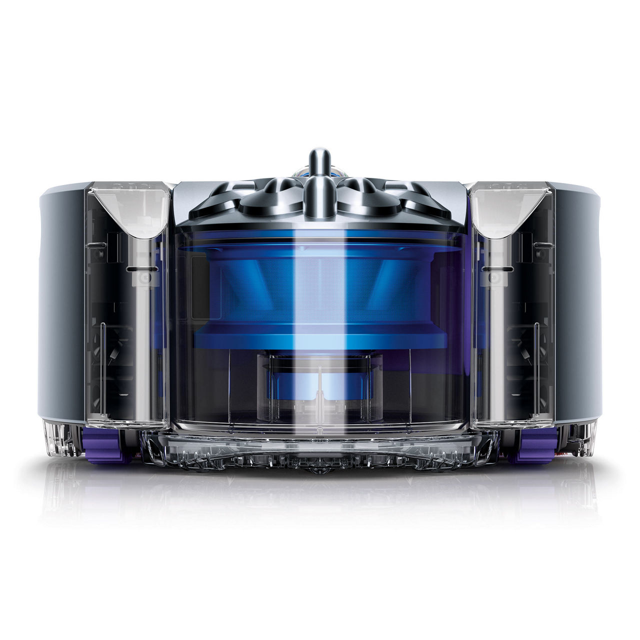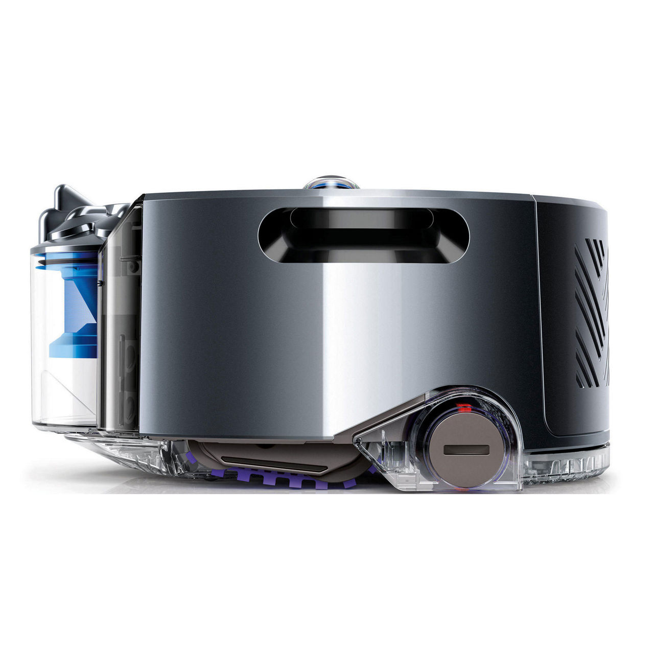 The motorised brush bar runs the full width of the robot, so it cleans everywhere it goes. Anti-static carbon fibre filaments and stiff nylon bristles remove dirt from all floor types. Where wheels might struggle, the Dyson 360 Eye™ robot’s tank tracks allow it to maintain speed and stay on course.