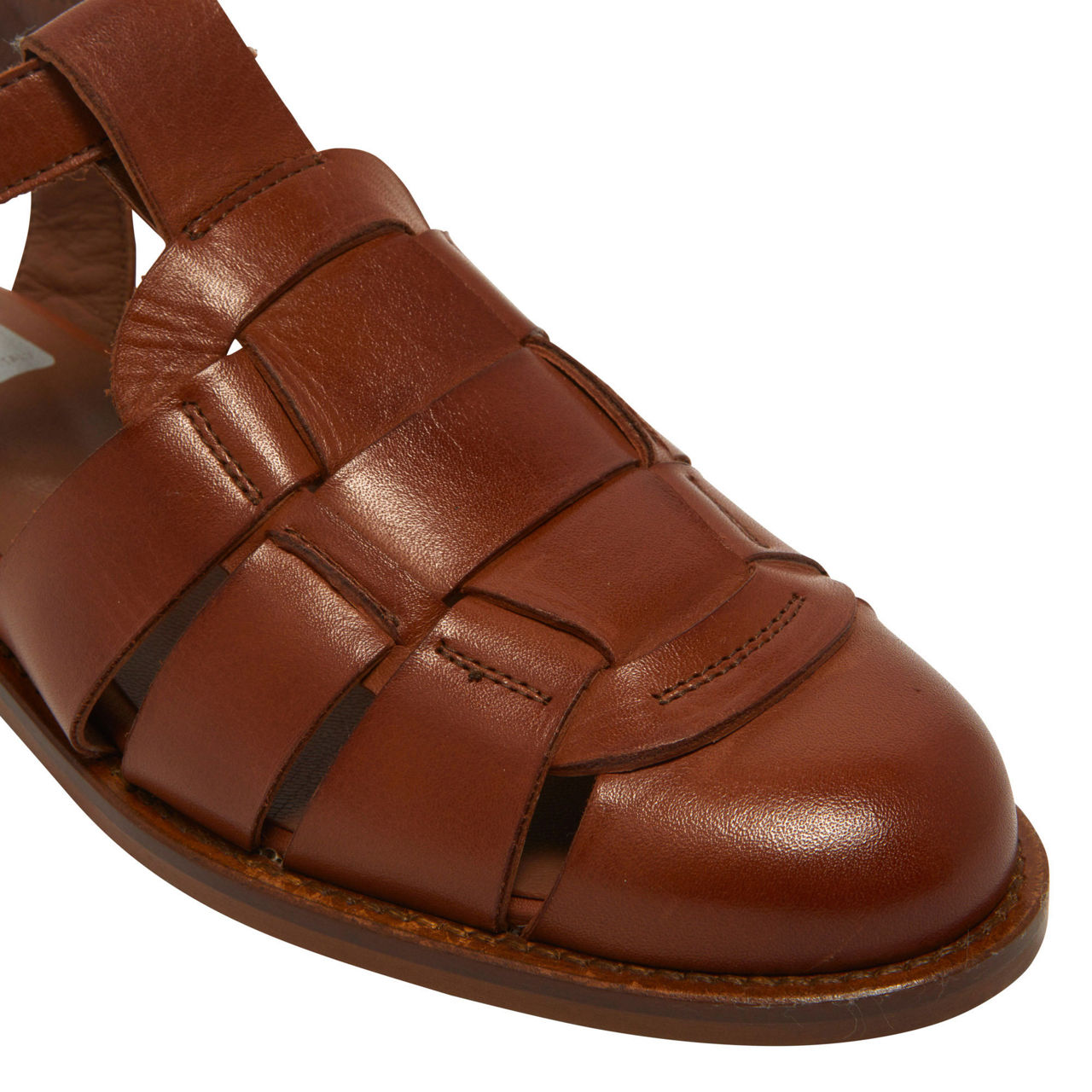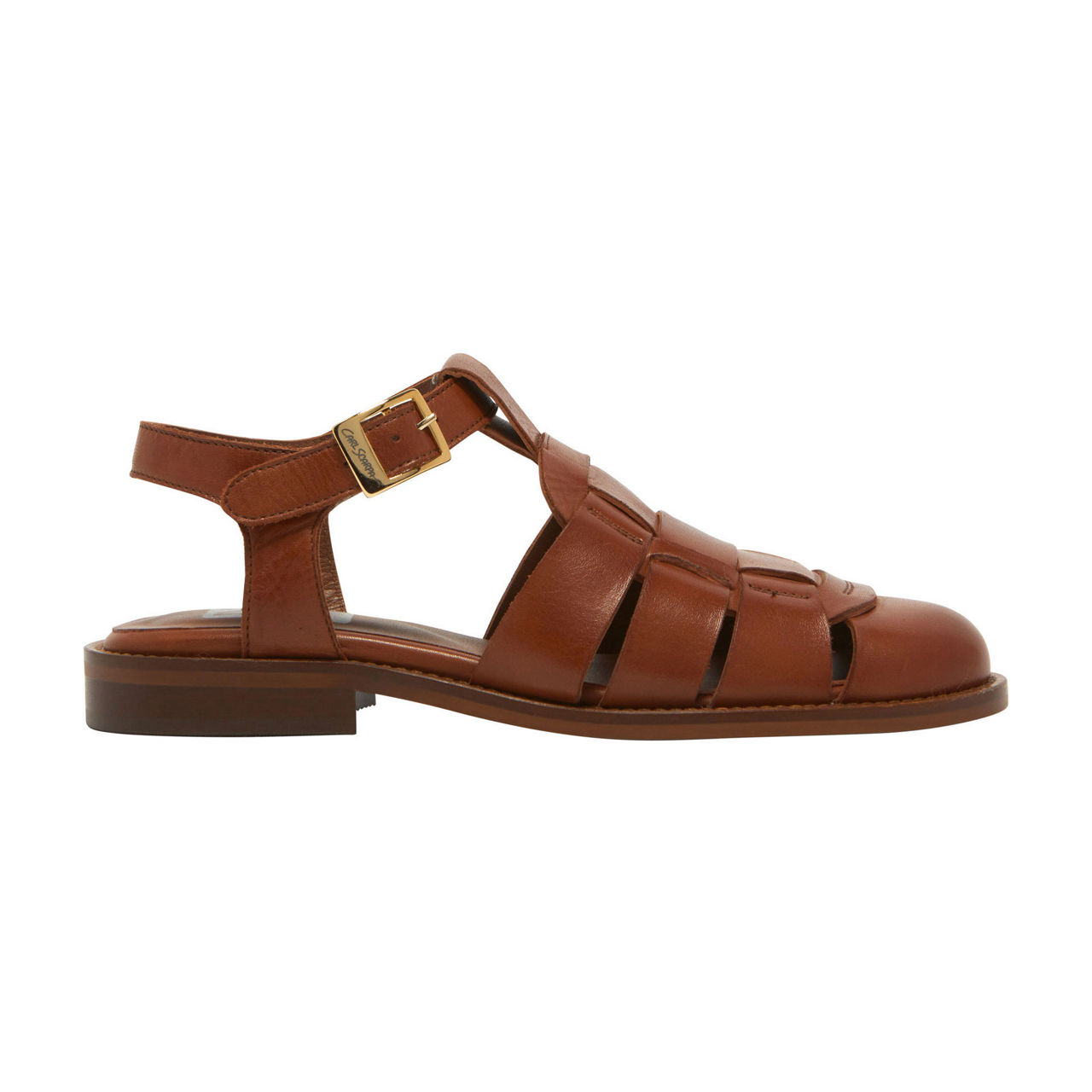 - Gold-tone buckle fastening with brand logo, fisherman style straps, smooth finish, tonal stitching, contrast sole, low flat heel
