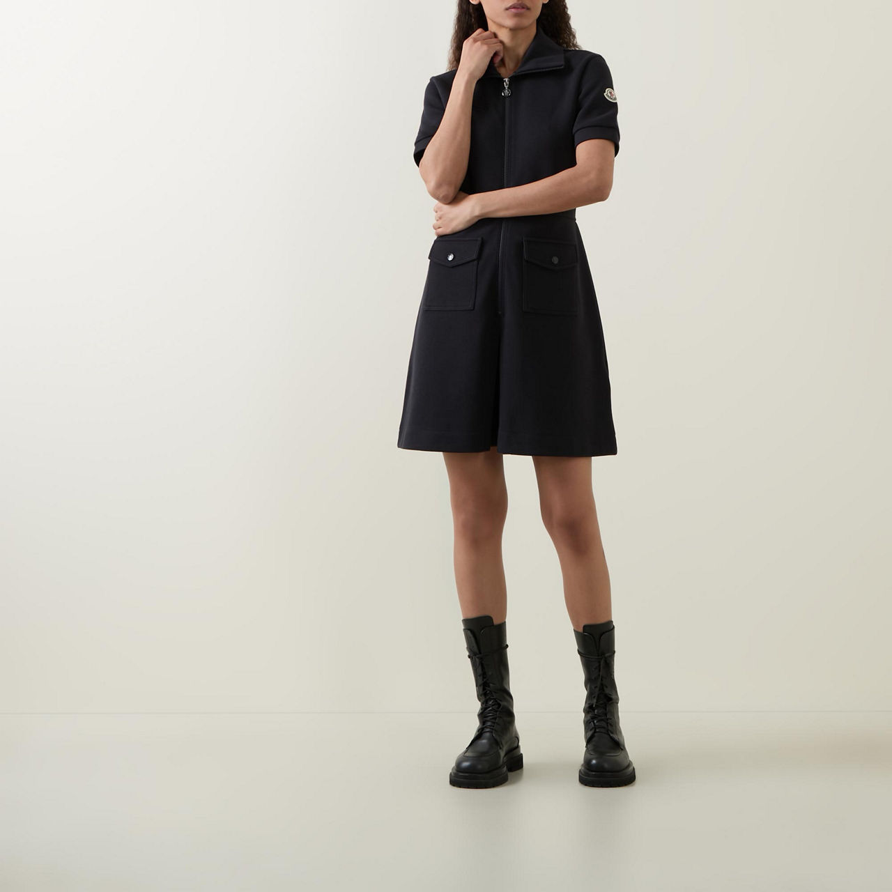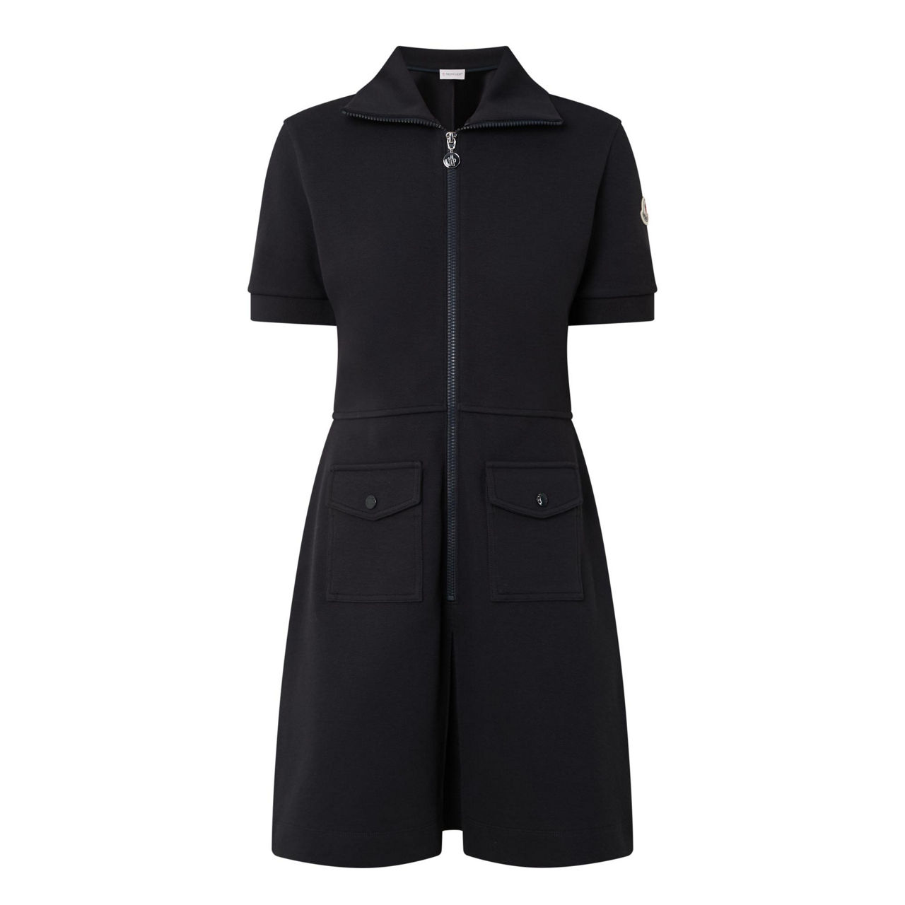 - Polo collar, short sleeves, front zip fastening, two front flap pockets with snap button fastenings, straight hem, felt logo detail, mini length, smooth finish