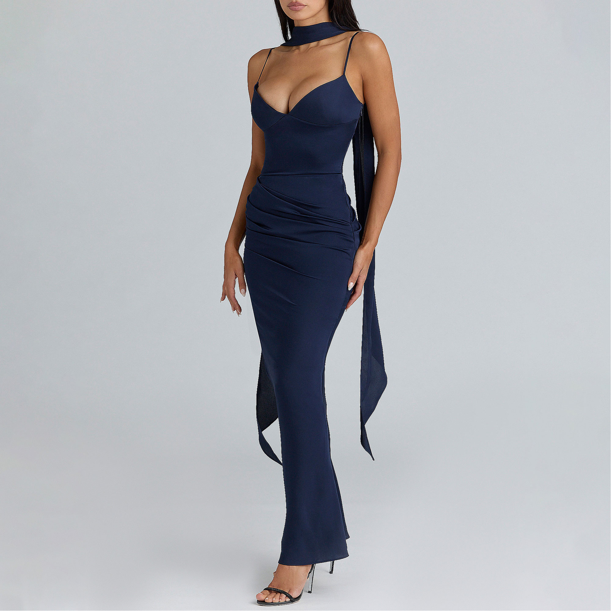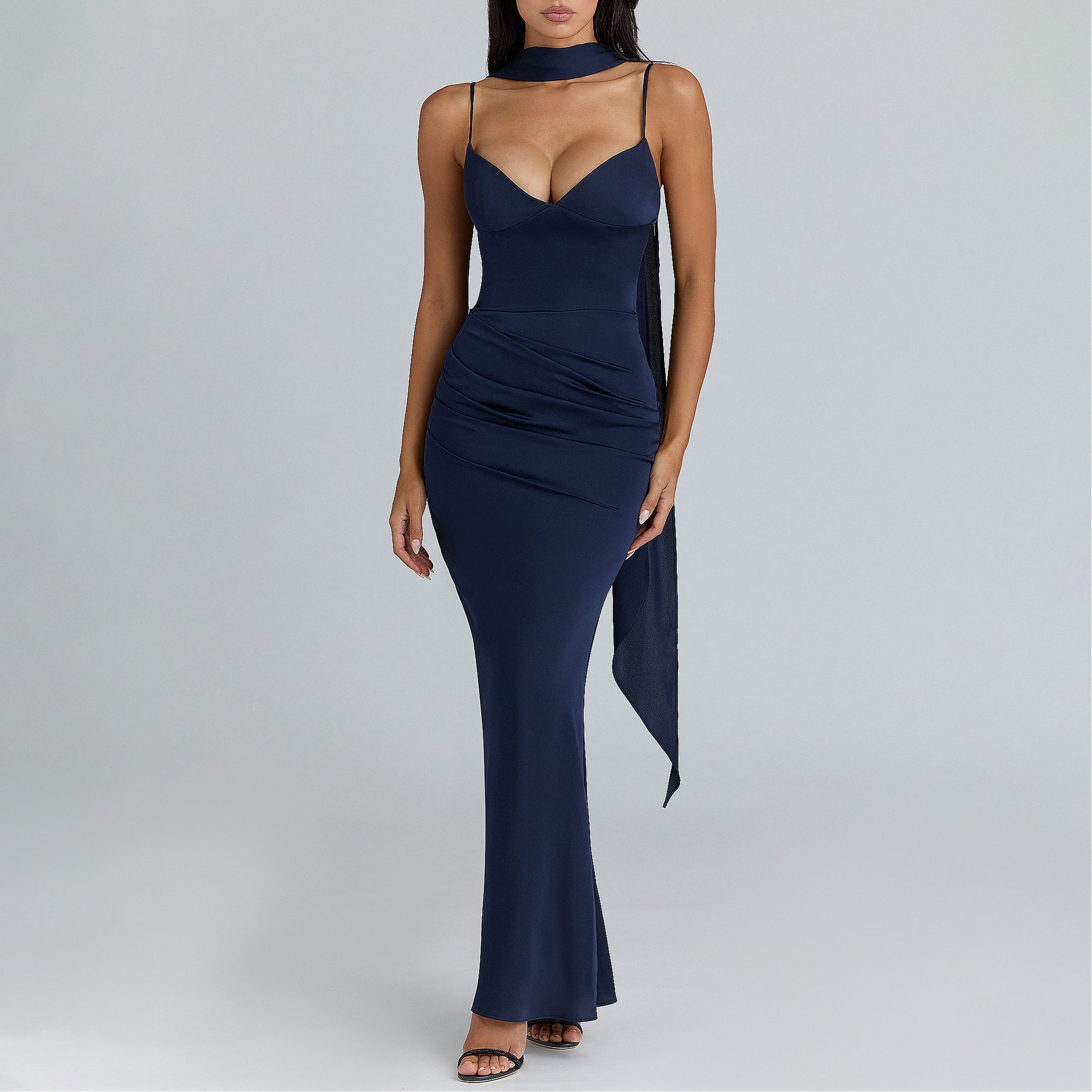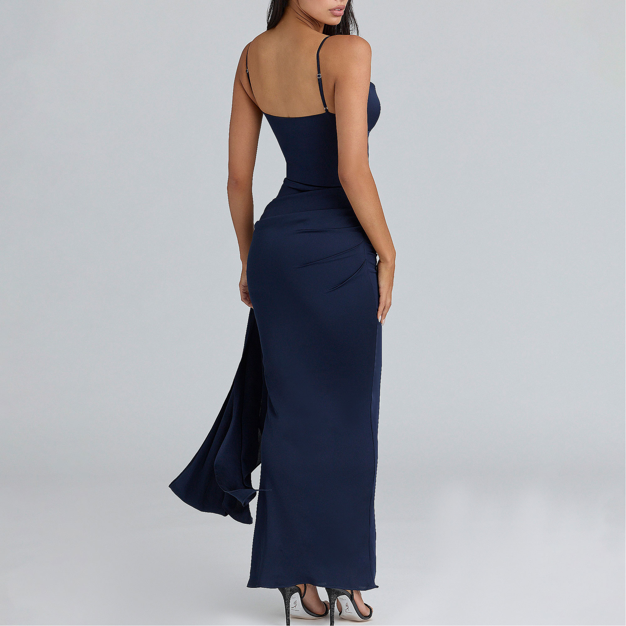 - Lightly padded cups, subtle boning at the waist, elegant maxi drape, side zip, adjustable straps