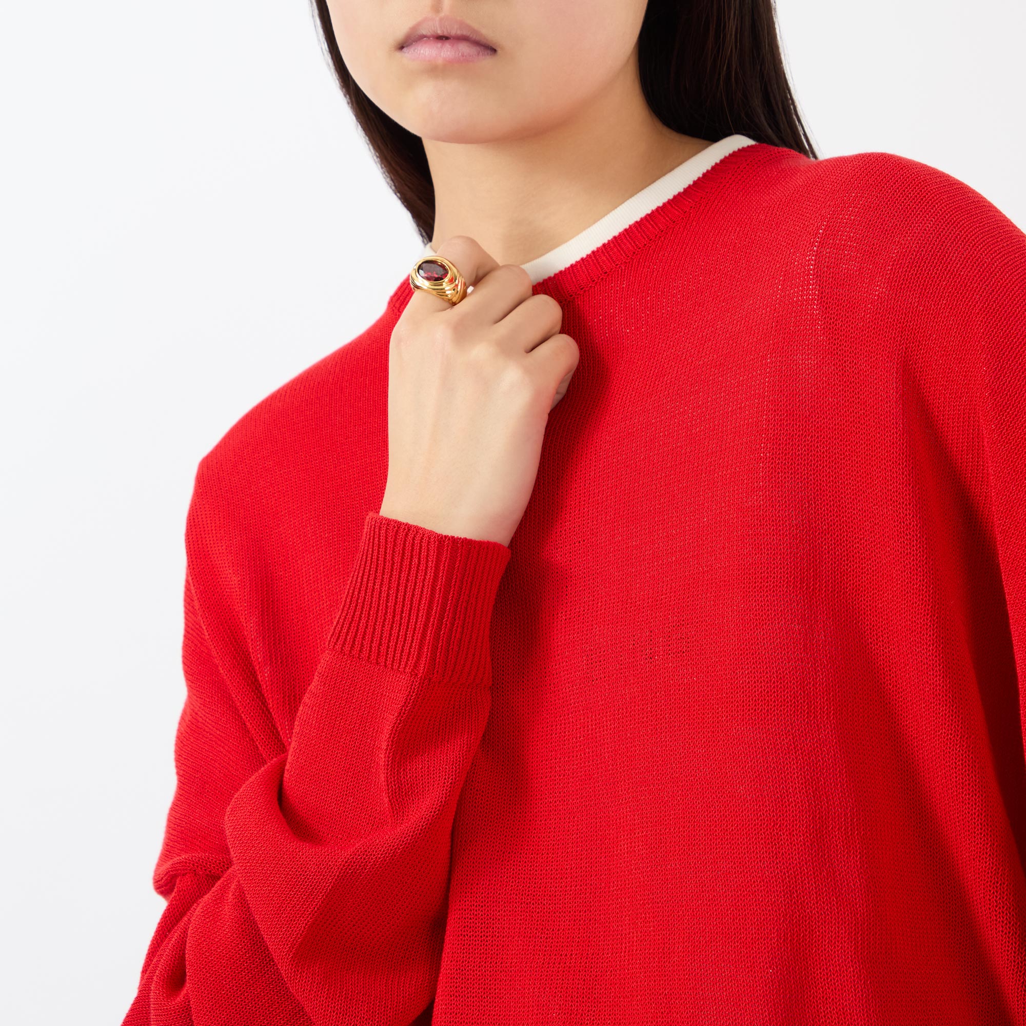 - Dome shaped, garnet coloured stone, statement piece, polished gold-tone finish