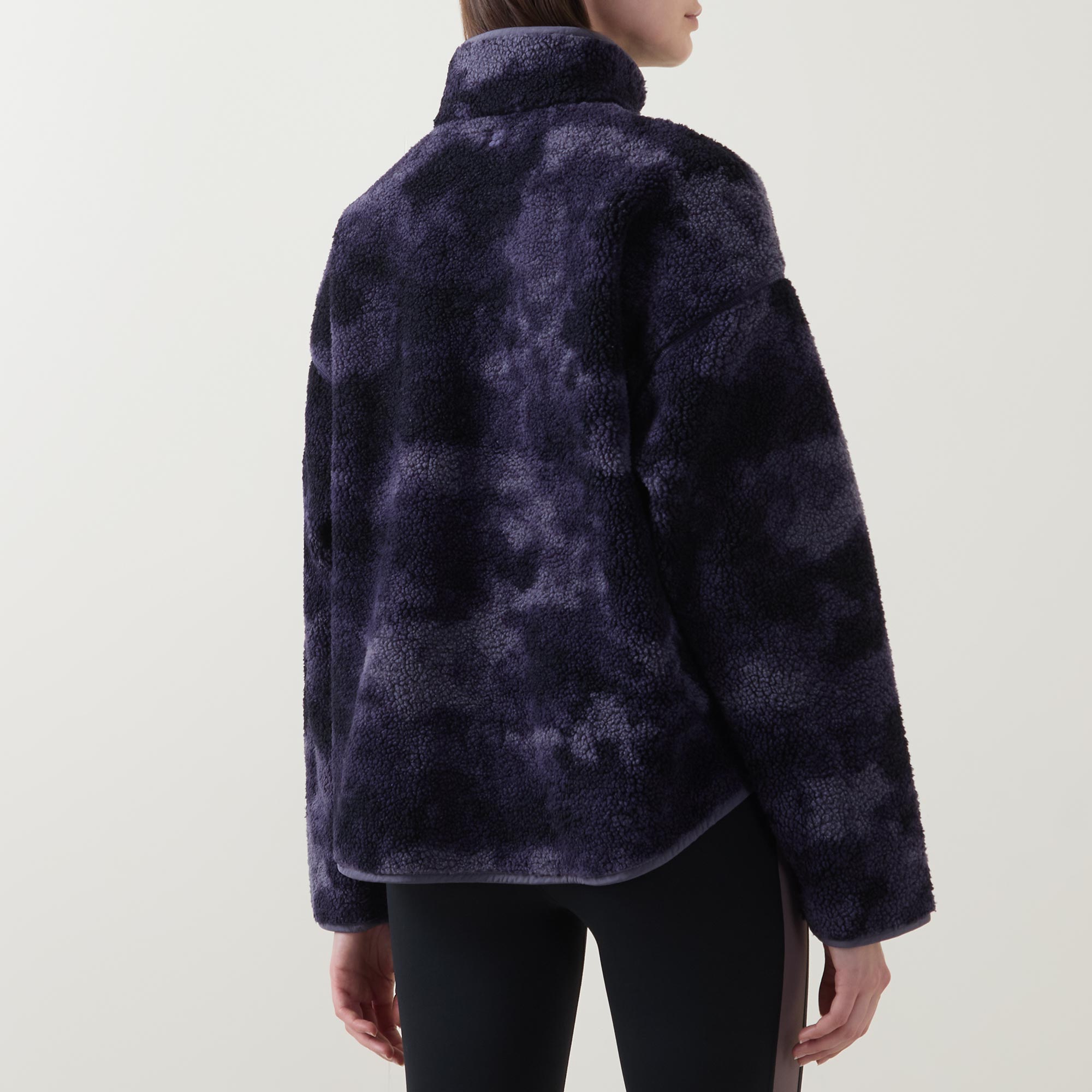 - Features: Plush fleece fabric with nylon binding at the hem and cuffs, funnel neckline, dropped shoulders, two front zip pockets, patterned