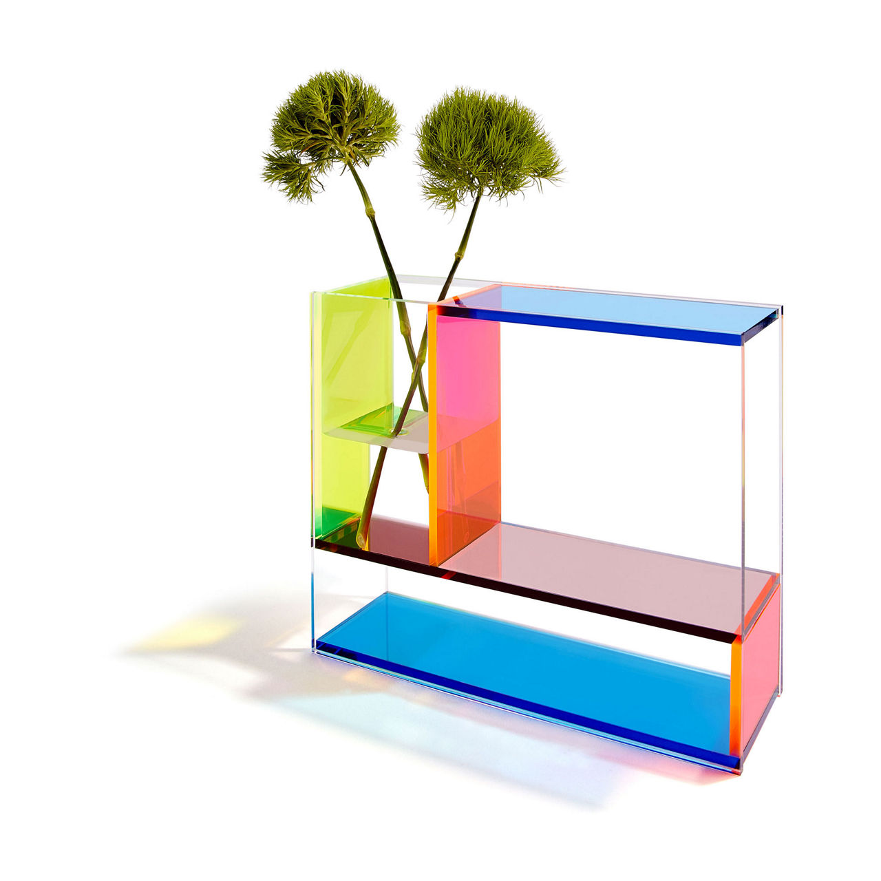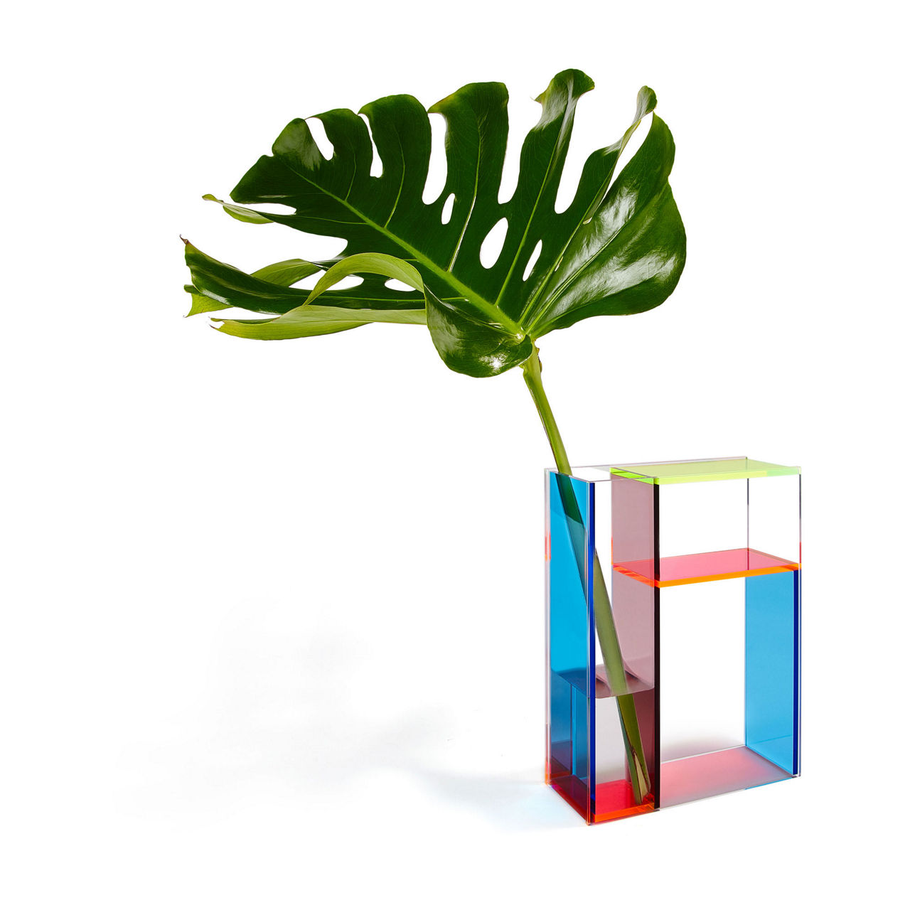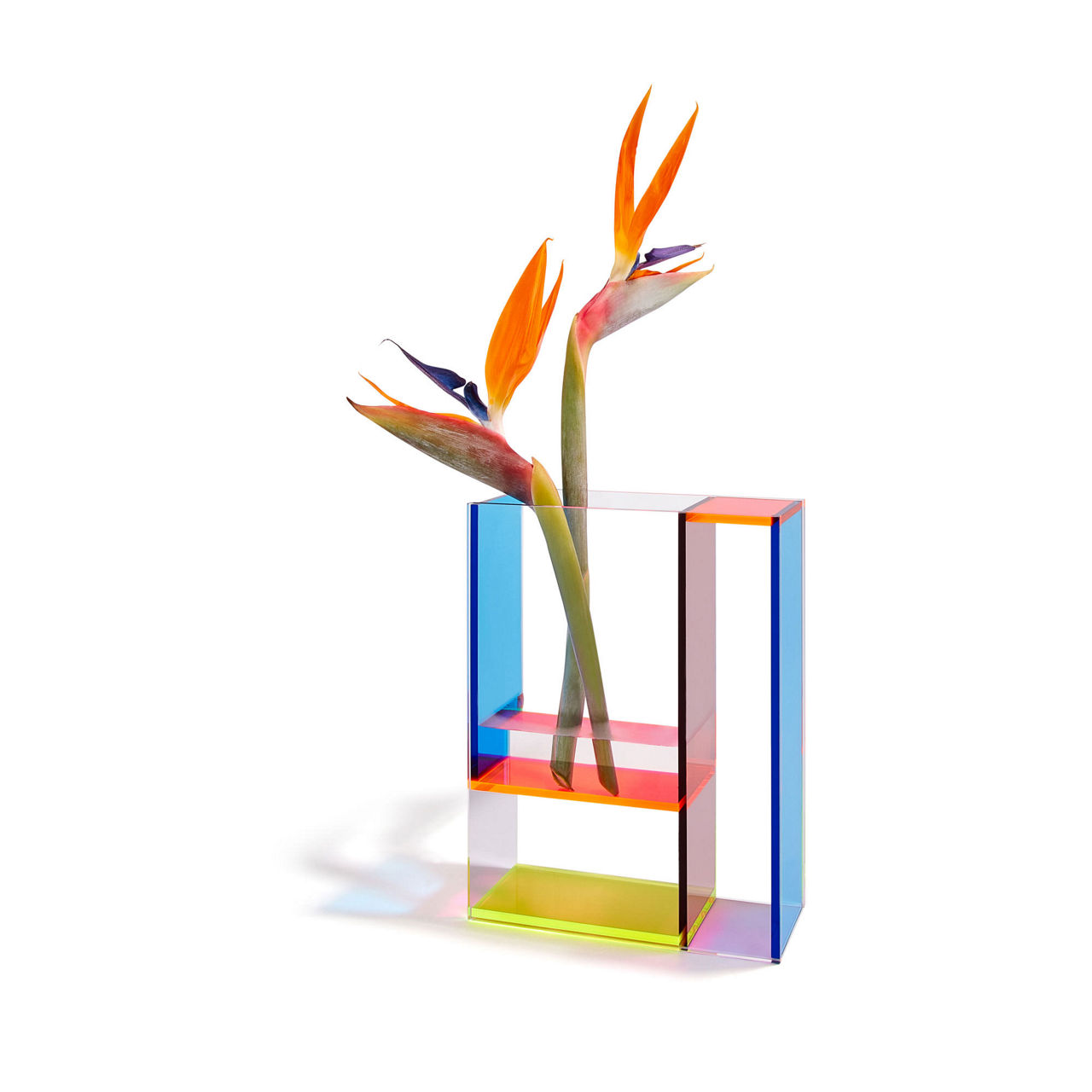 This updated version of the popular Mondri Vase uses transparent acrylic neon panels that create delightful colourplay and beautiful shadows. Three vases in one, it’s designed with three different chambers, so you can turn the vase for different floral arrangement possibilities and flower sizes. The Neon Mondri Vase is a mix of clear and blue, yellow, pink and lavender panels.